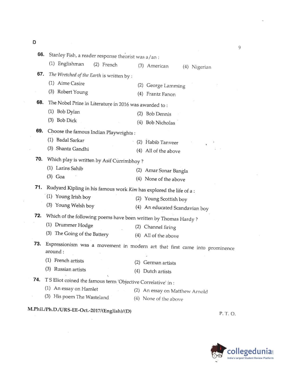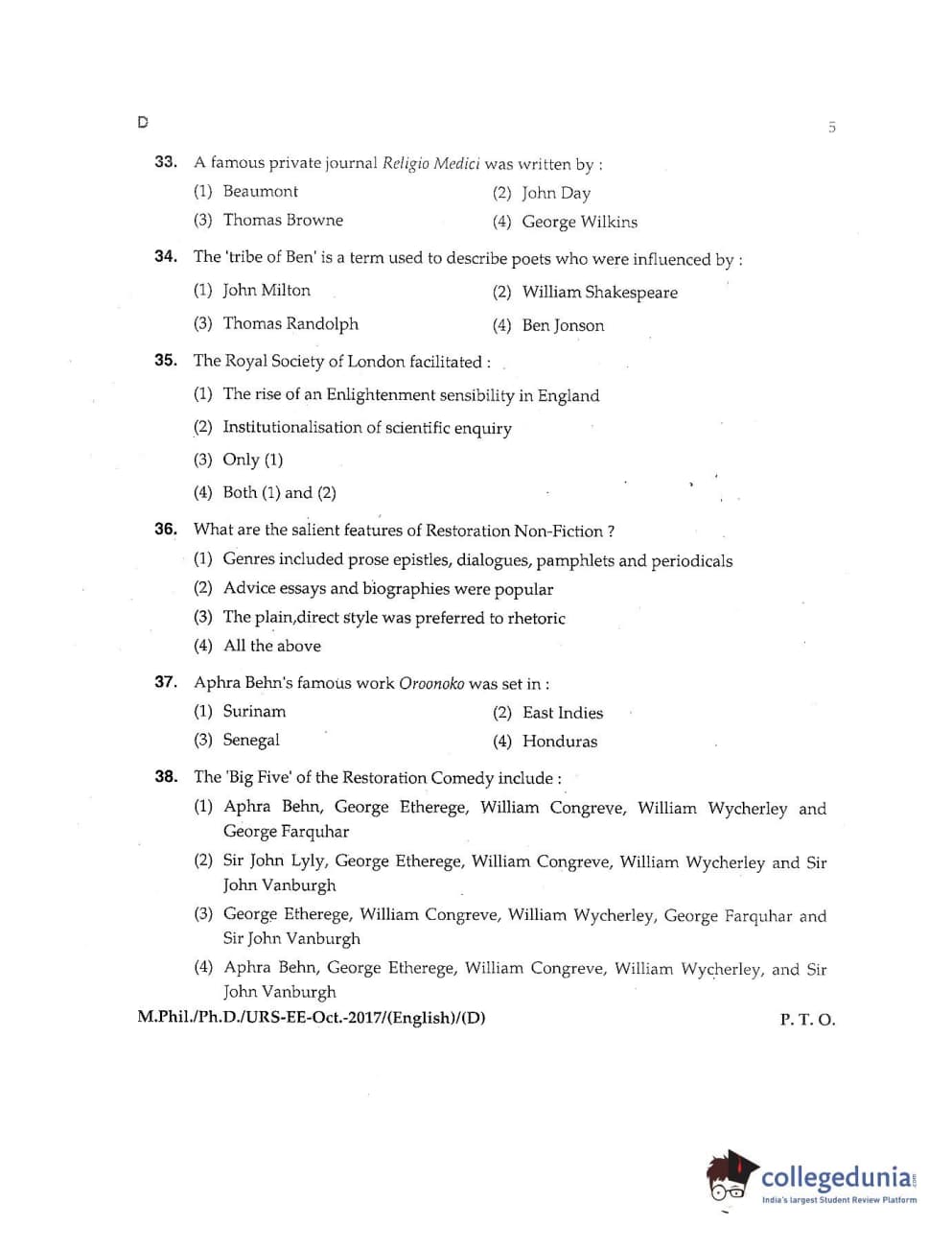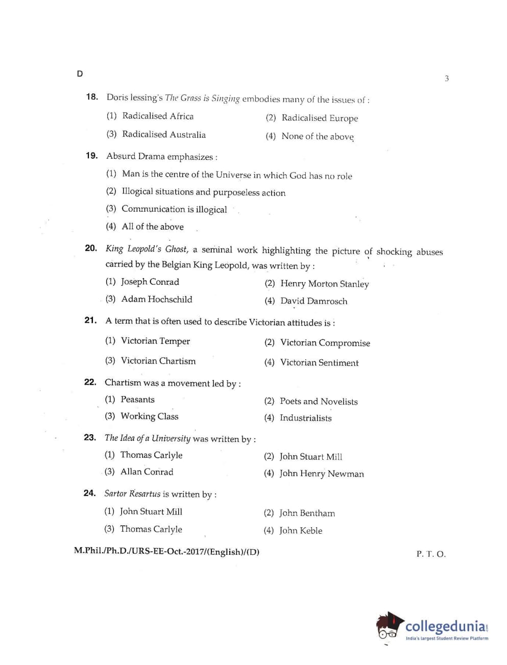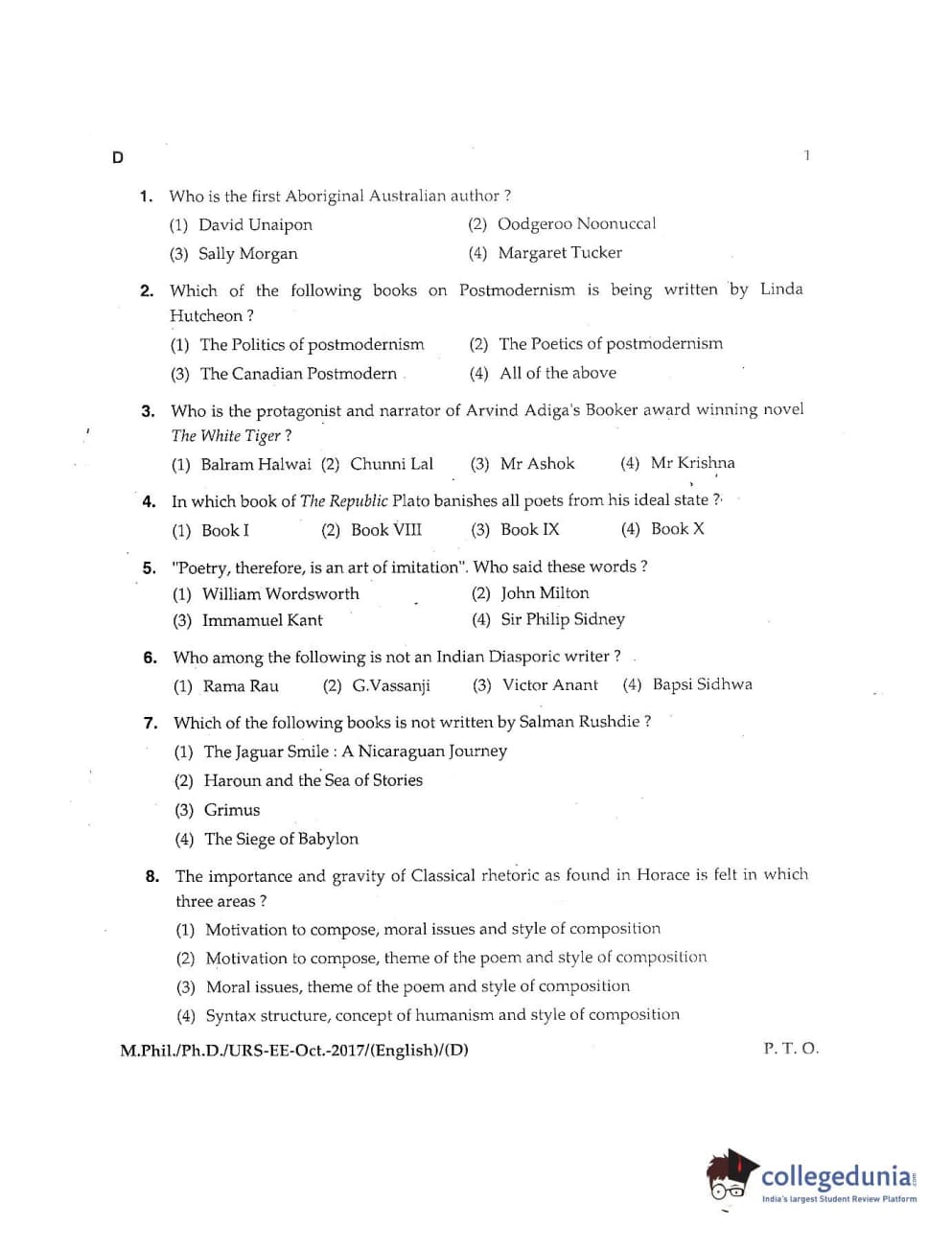 MDUCEE 2017 M.Phil./Ph.D./URS English Set D Question Paper with Answer Key PDFs