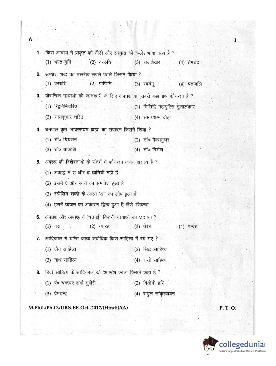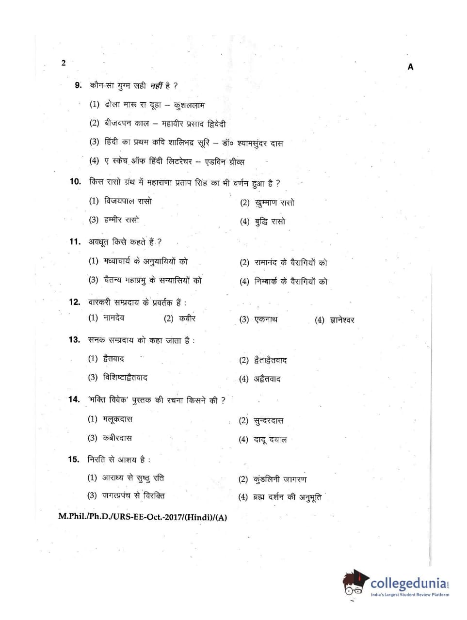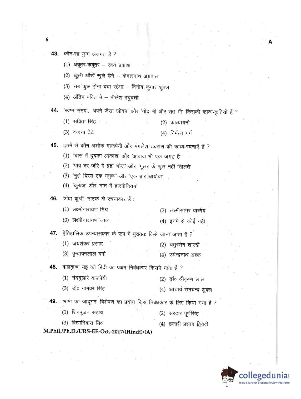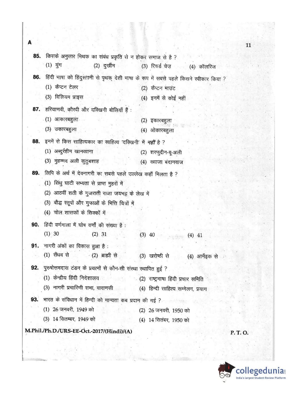 MDUCEE 2017 M.Phil./Ph.D./URS Hindi Set A Question Paper with Answer Key PDFs