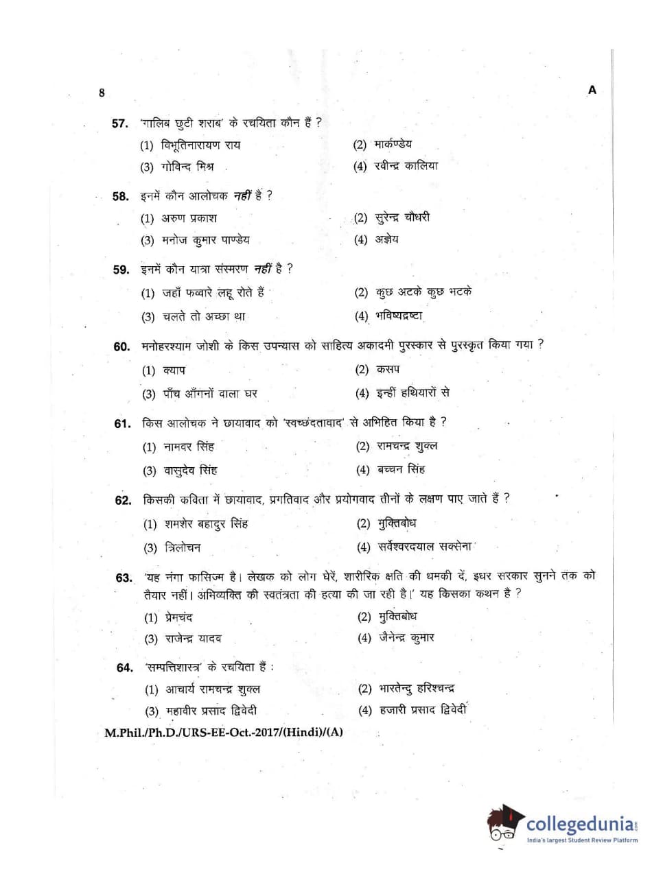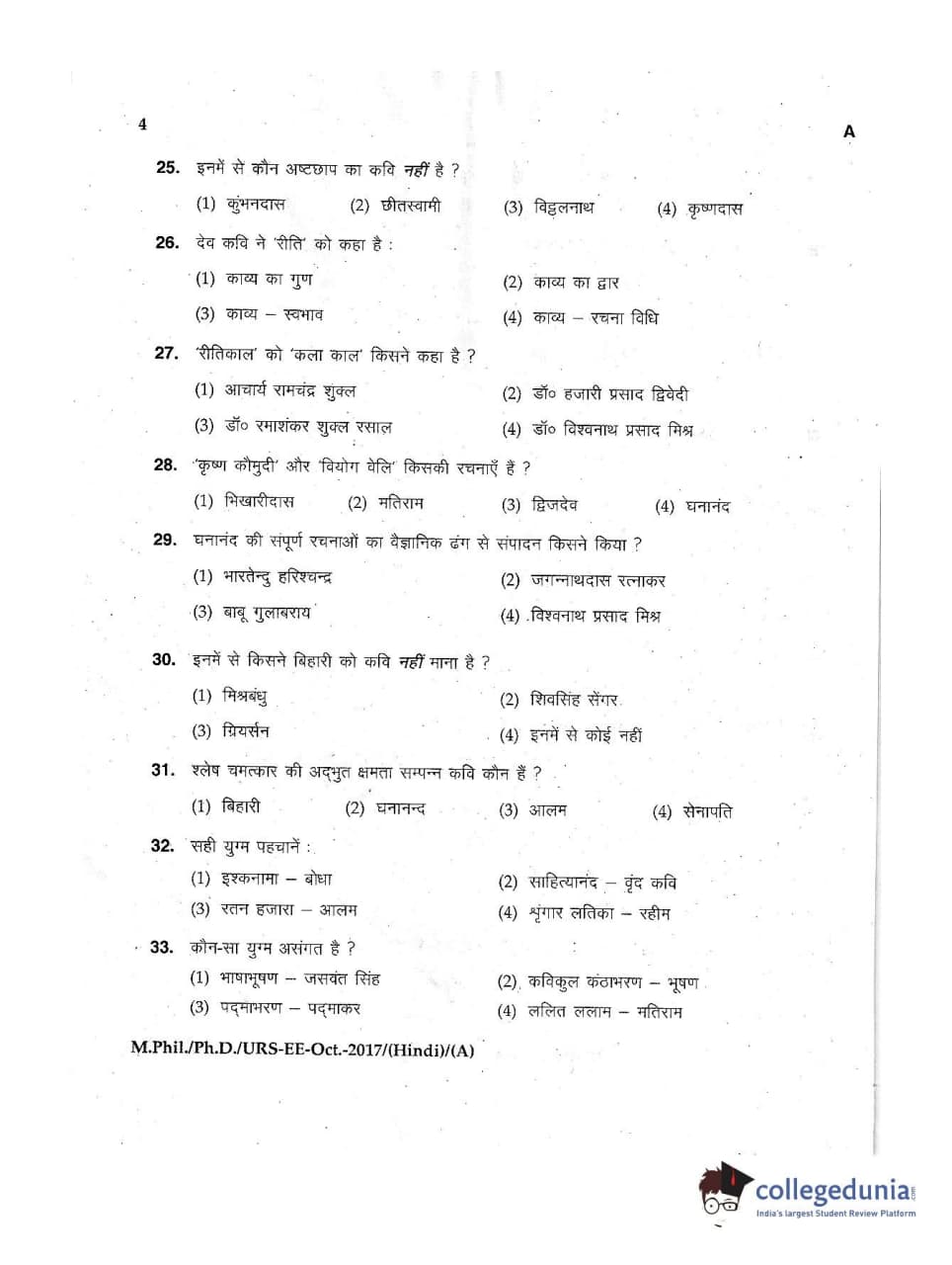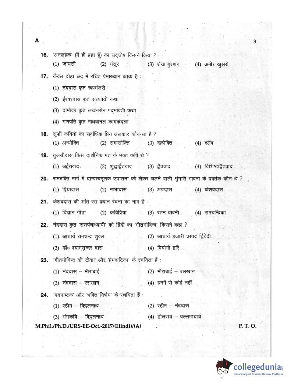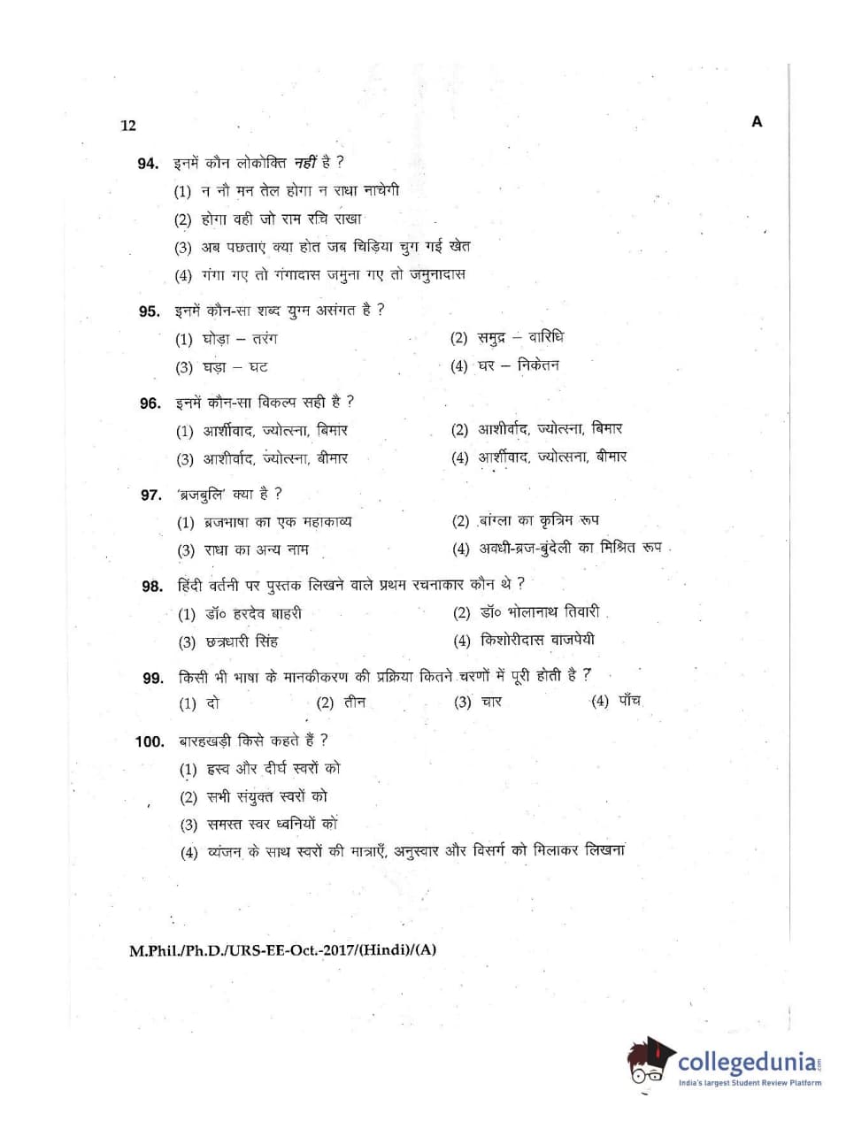 MDUCEE 2017 M.Phil./Ph.D./URS Hindi Set A Question Paper with Answer Key PDFs