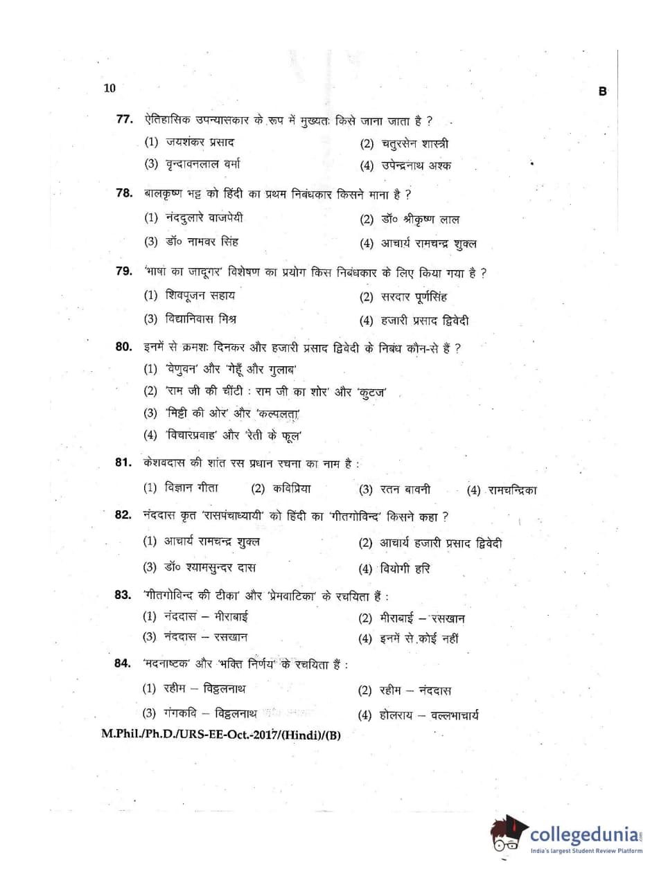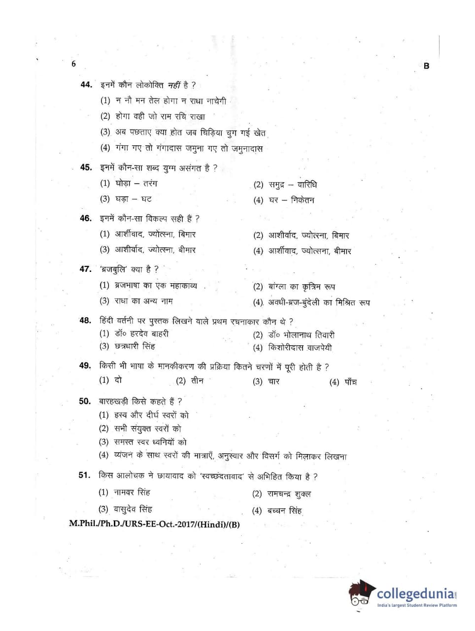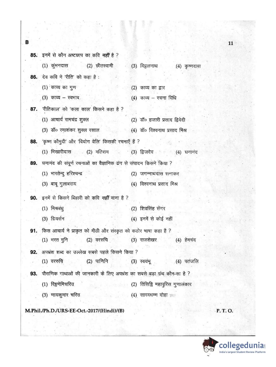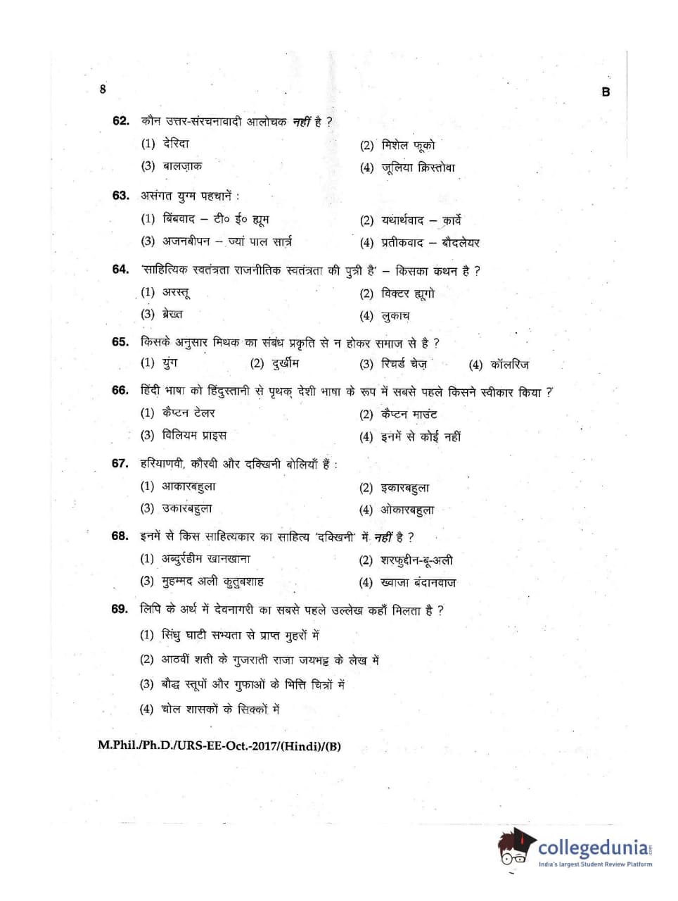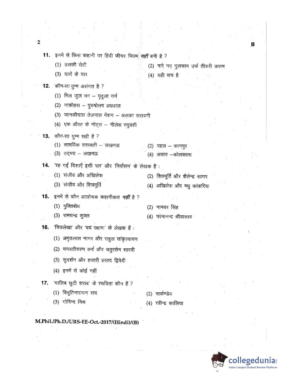 MDUCEE 2017 M.Phil./Ph.D./URS Hindi Set B Question Paper with Answer Key PDFs