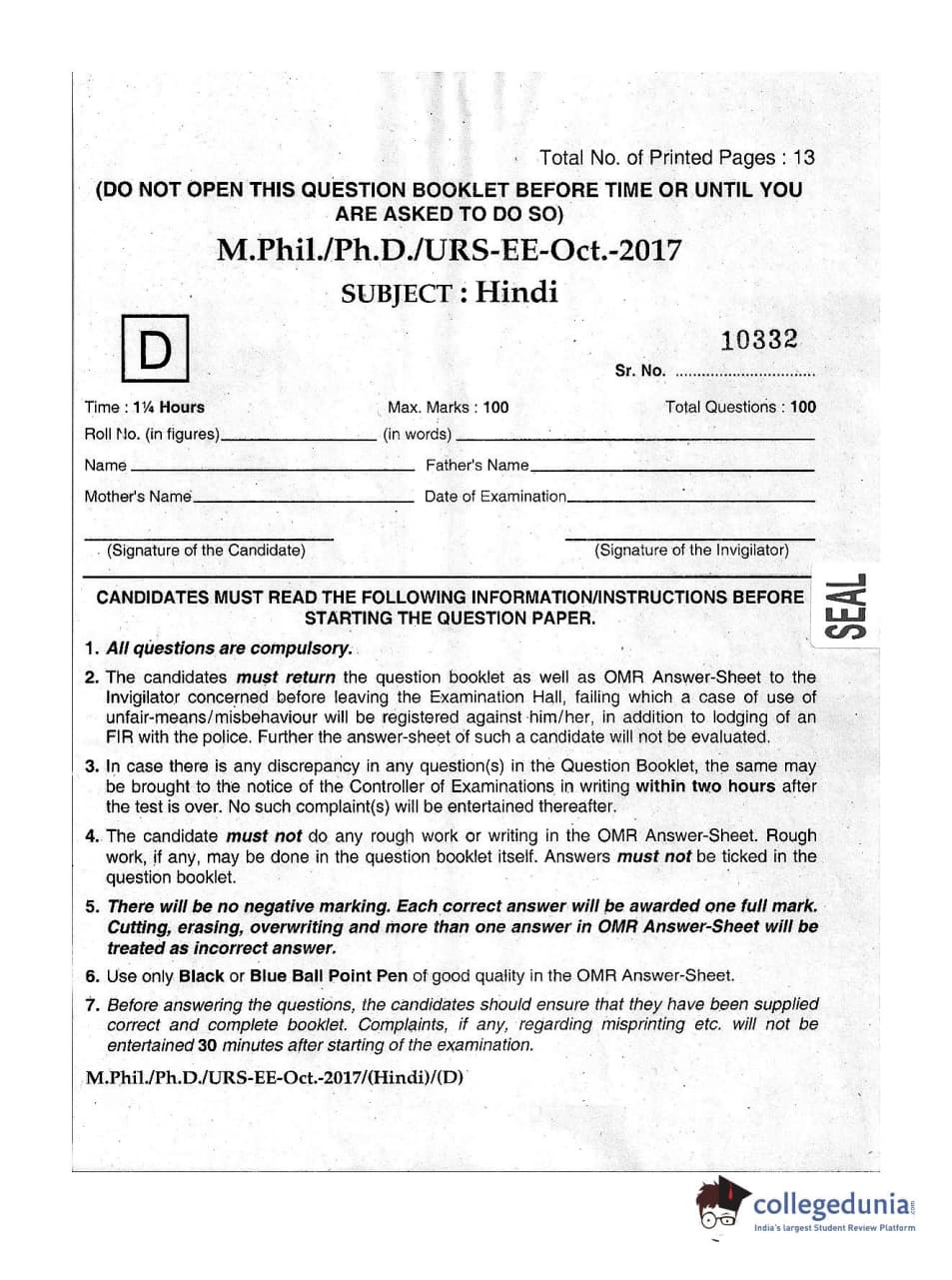 MDUCEE 2017 M.Phil./Ph.D./URS Hindi Set D Question paper with answer key pdf is available for download. The exam was successfully organized by Maharishi Dayanand University. The question paper comprised a total of 100 questions.