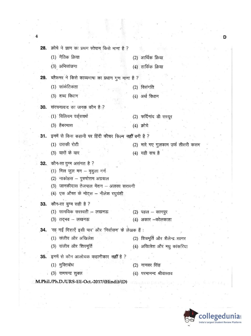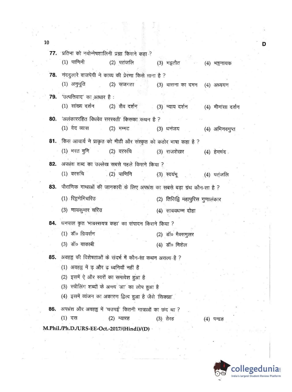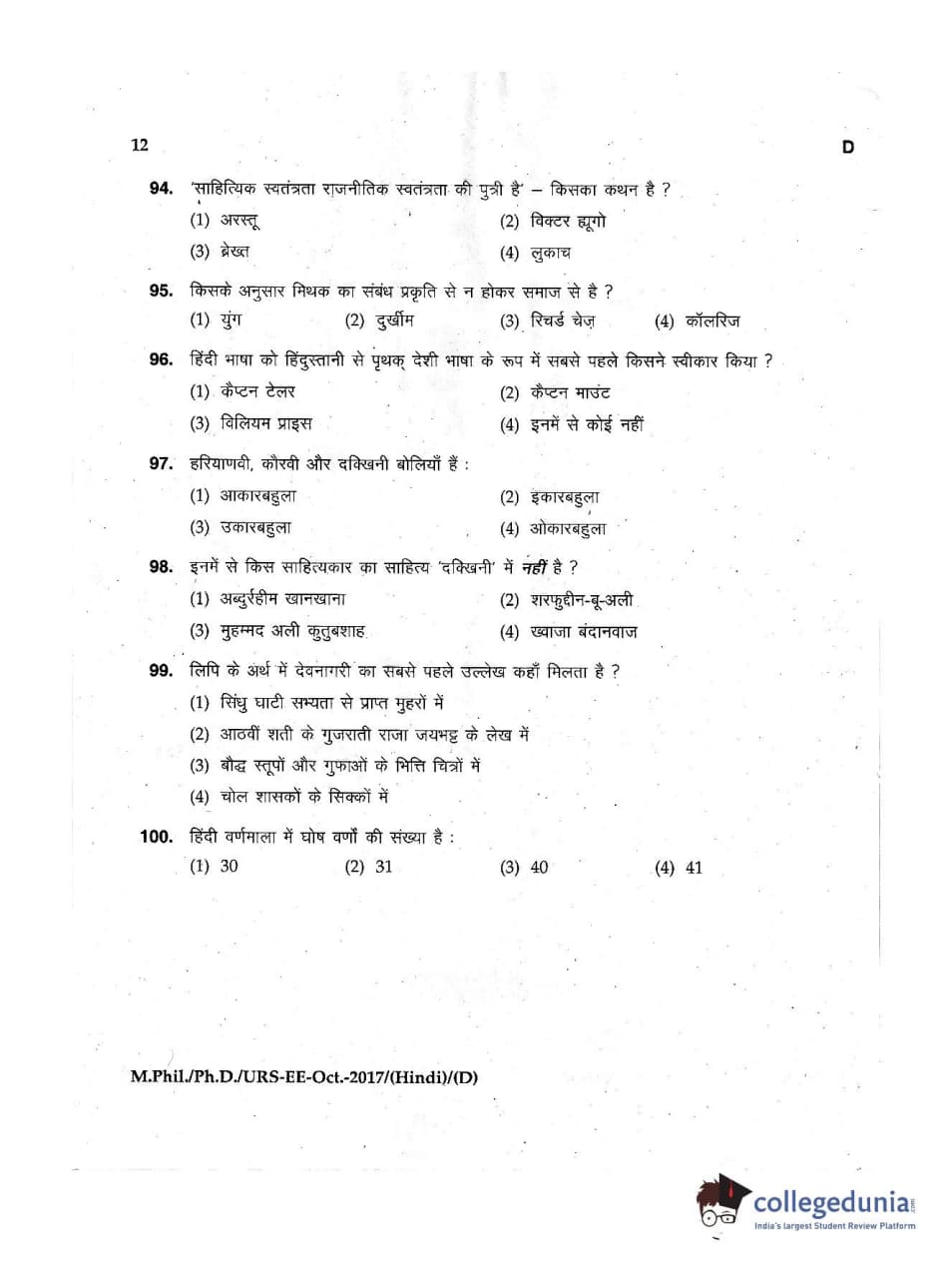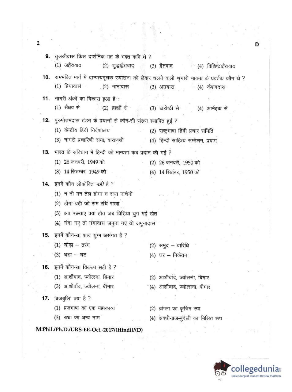 MDUCEE 2017 M.Phil./Ph.D./URS Hindi Set D Question Paper with Answer Key PDFs