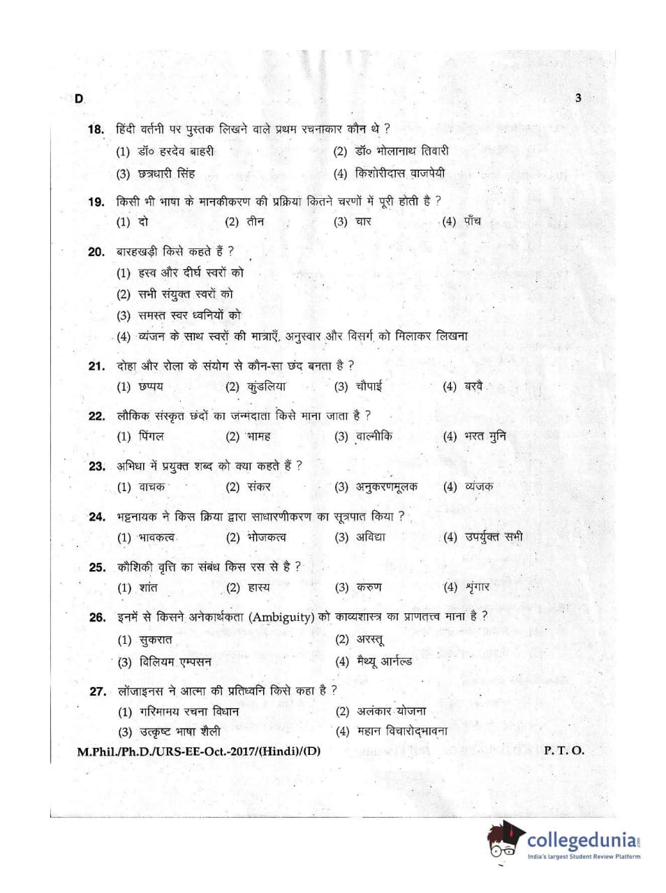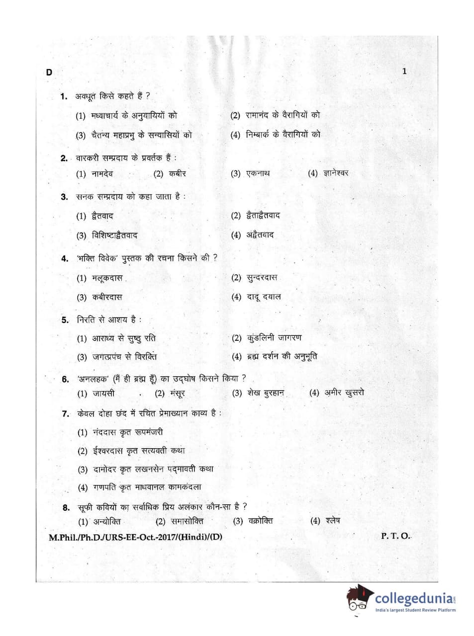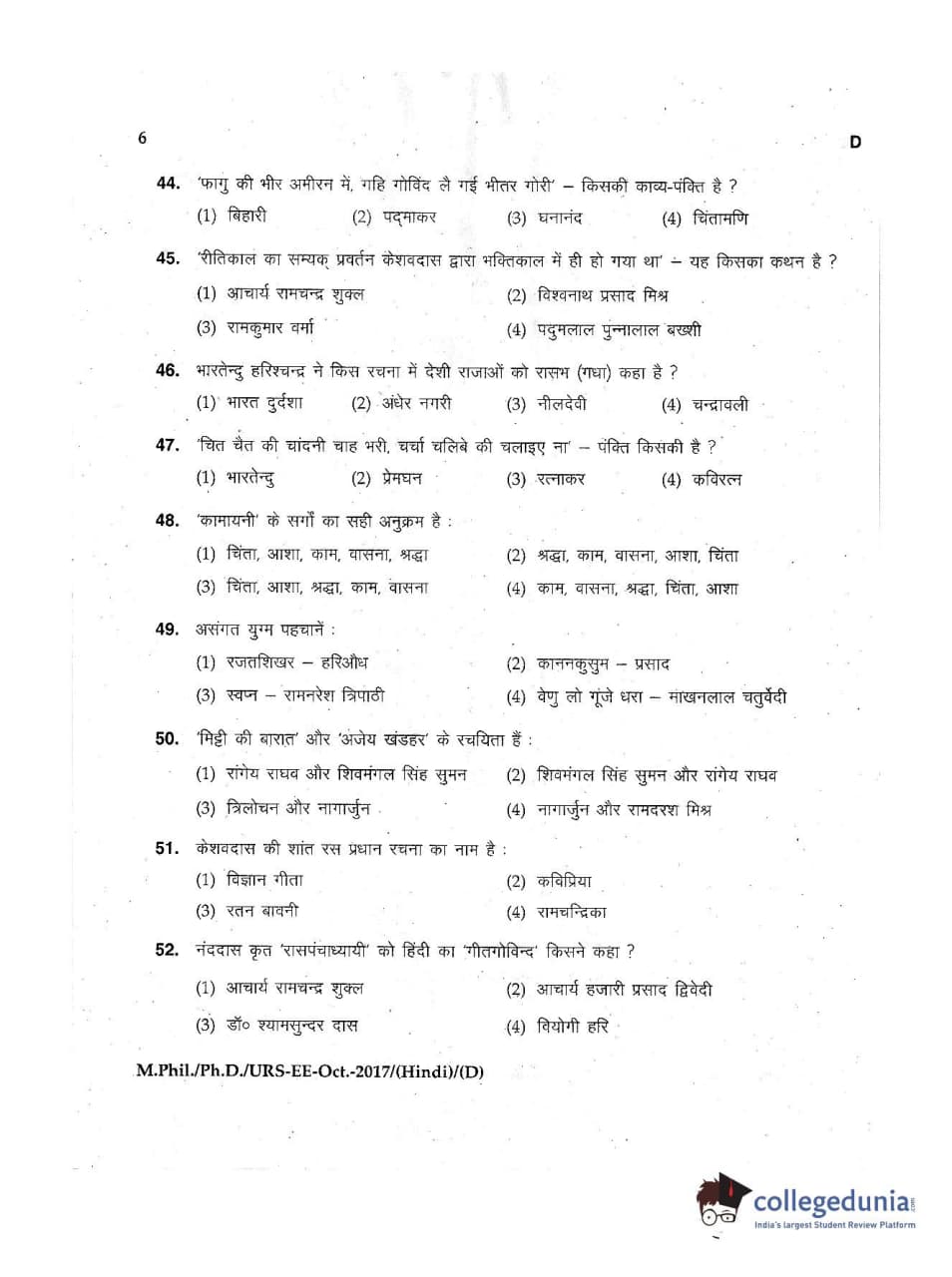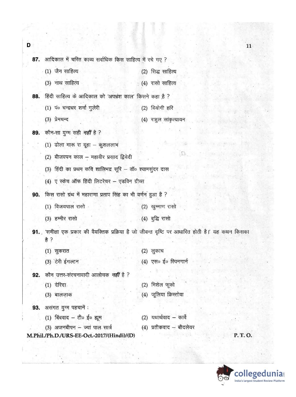 MDUCEE 2017 M.Phil./Ph.D./URS Hindi Set D Question Paper with Answer Key PDFs