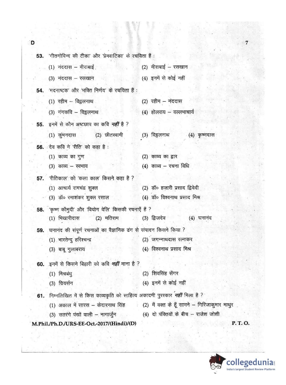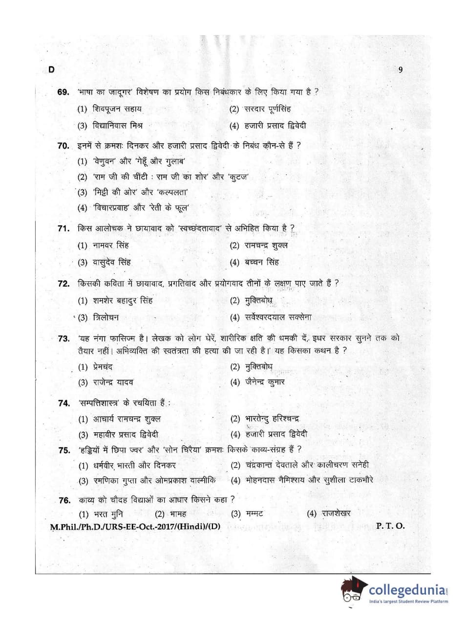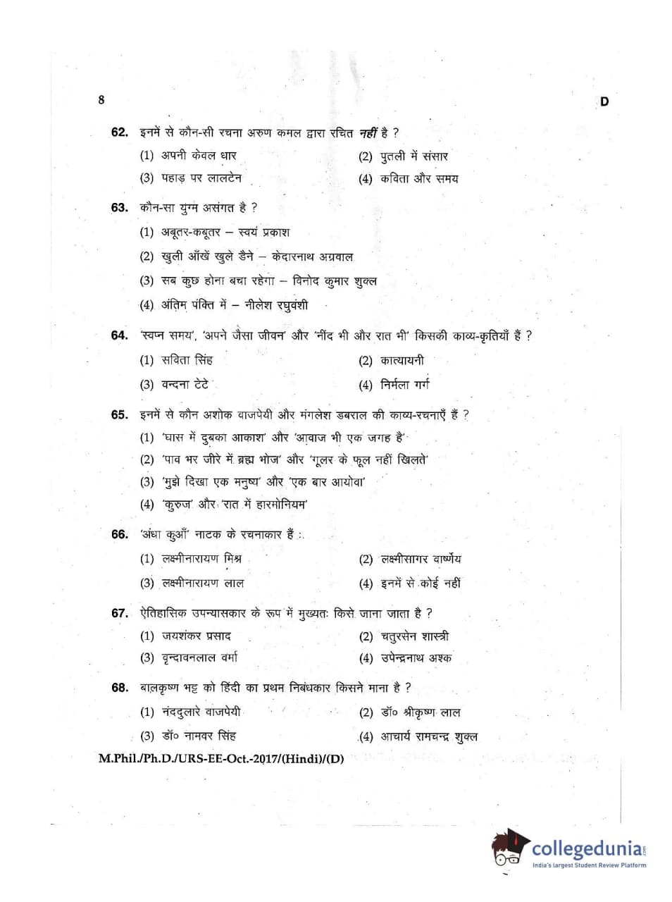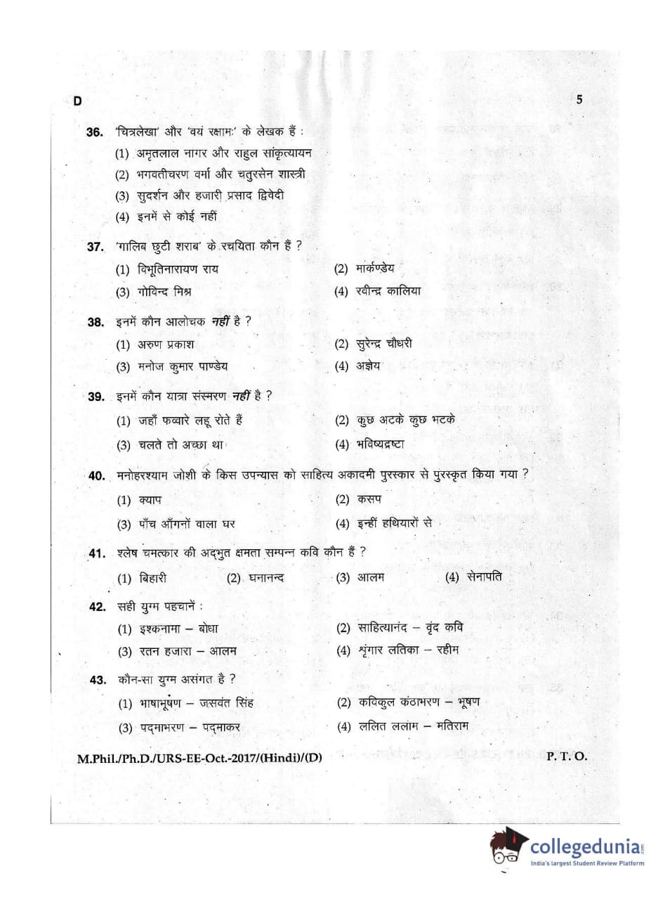 MDUCEE 2017 M.Phil./Ph.D./URS Hindi Set D Question Paper with Answer Key PDFs