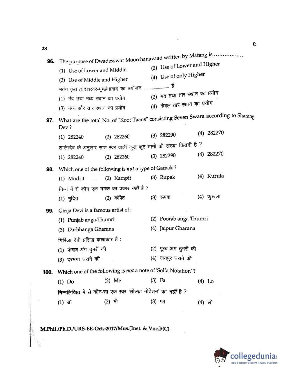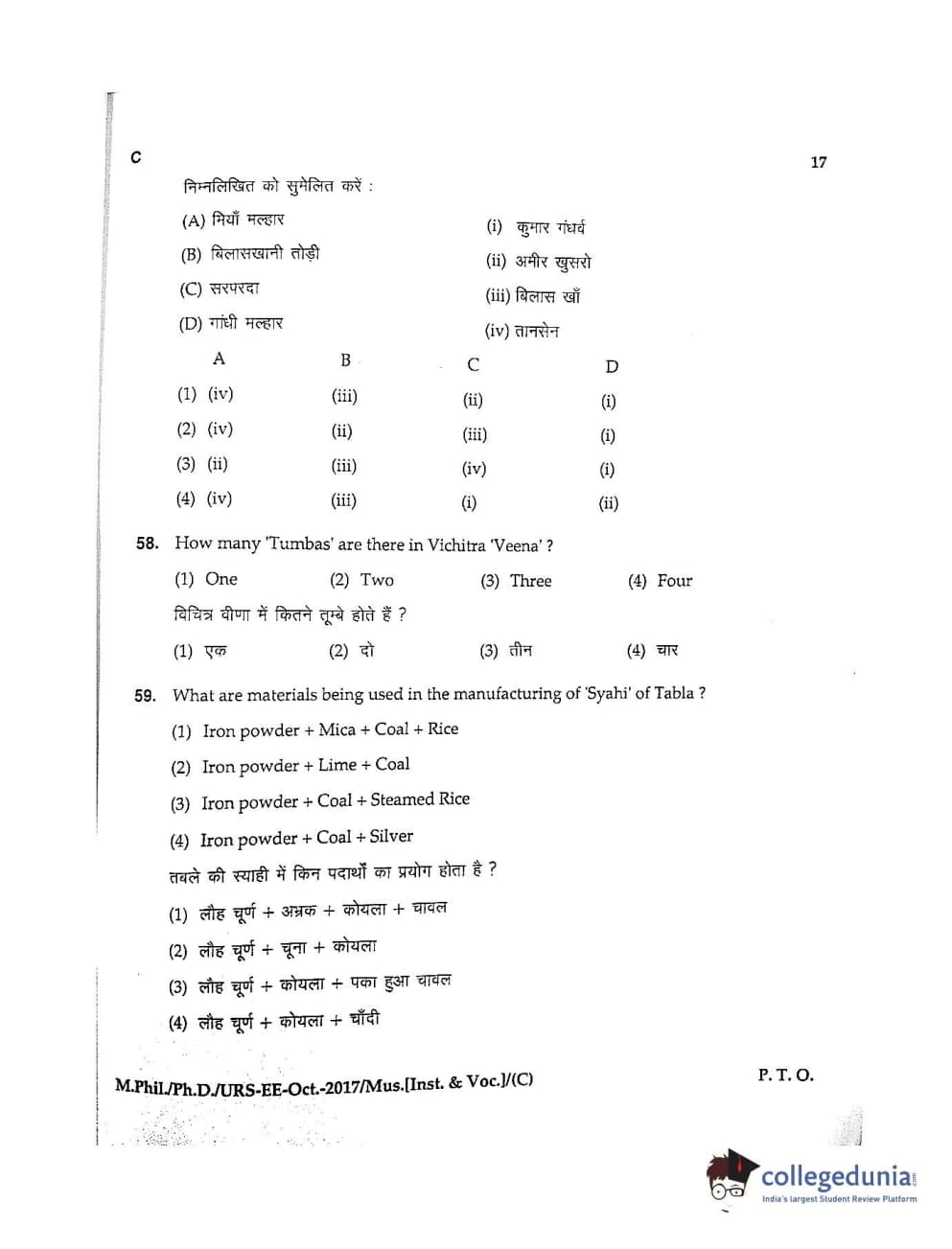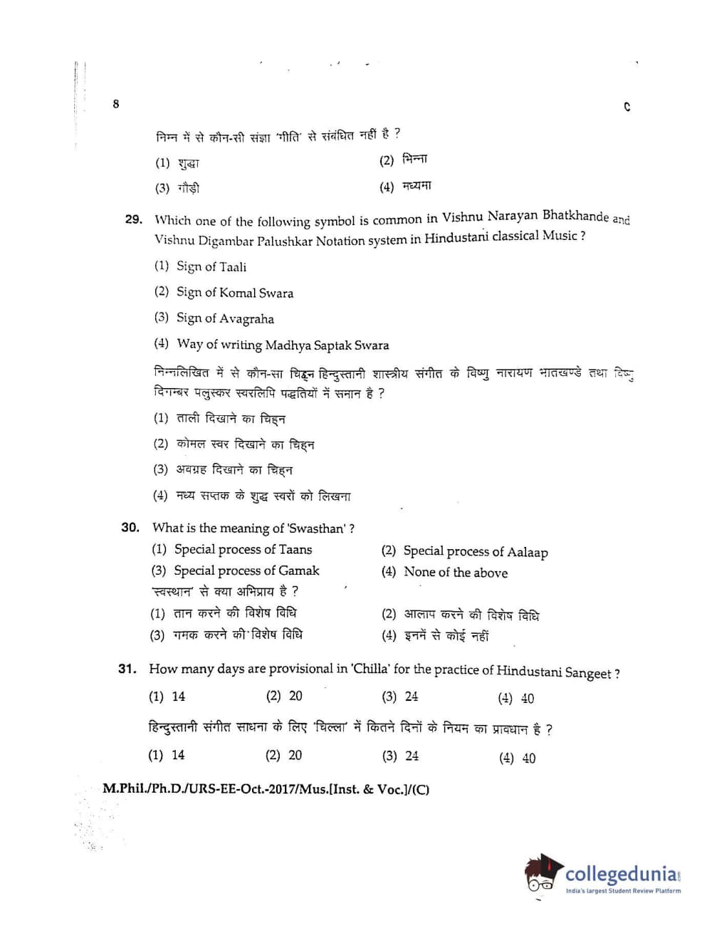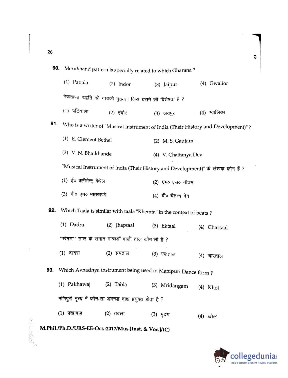 MDUCEE 2017 M.Phil./Ph.D./URS Music (Instrumental and Vocal) Set C Question Paper with Answer Key PDFs
