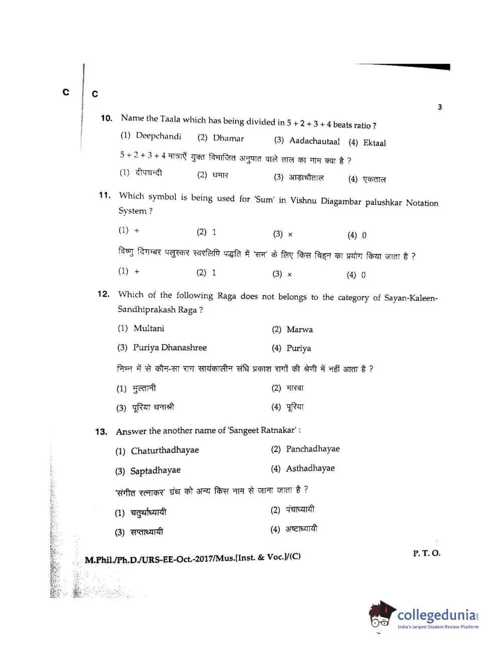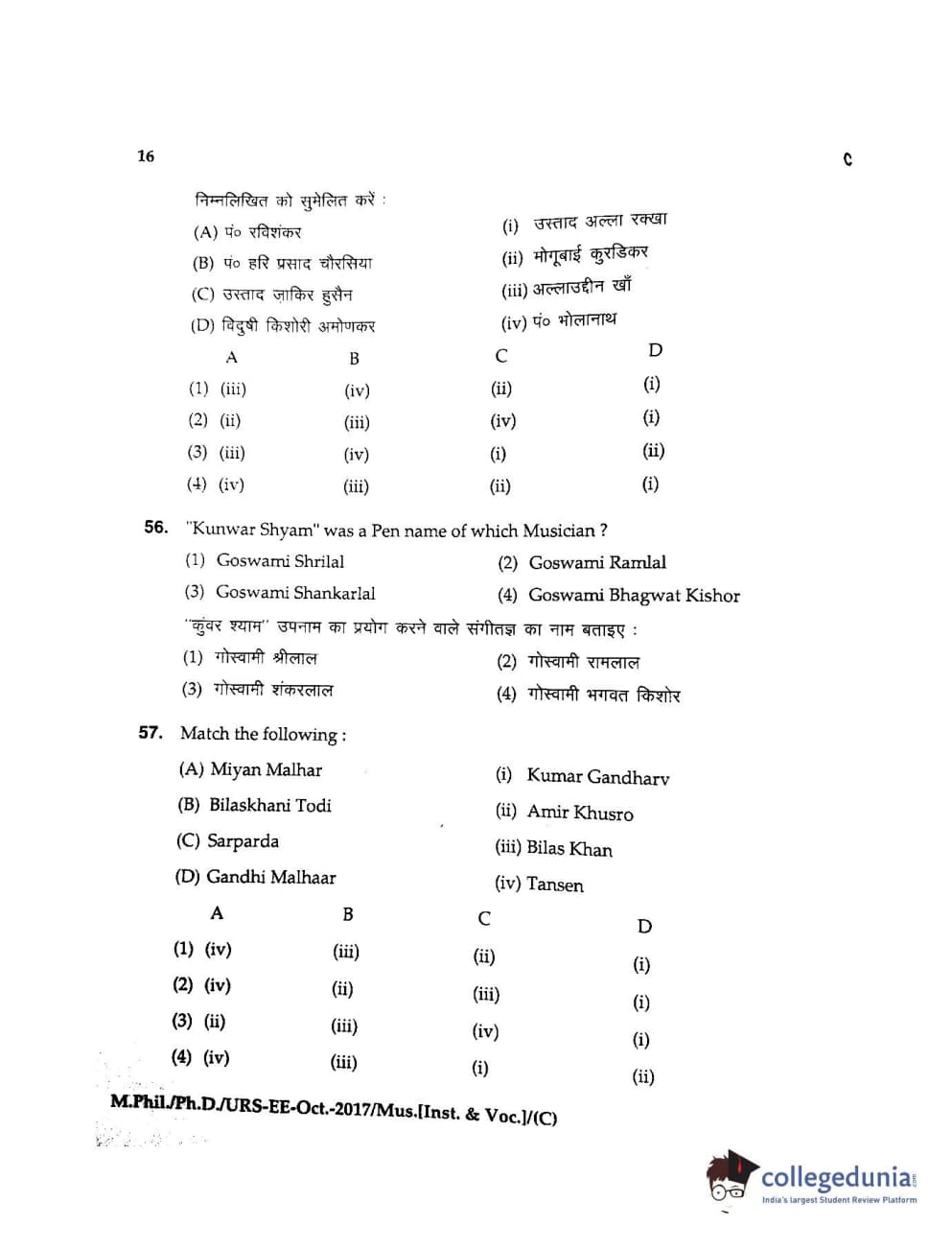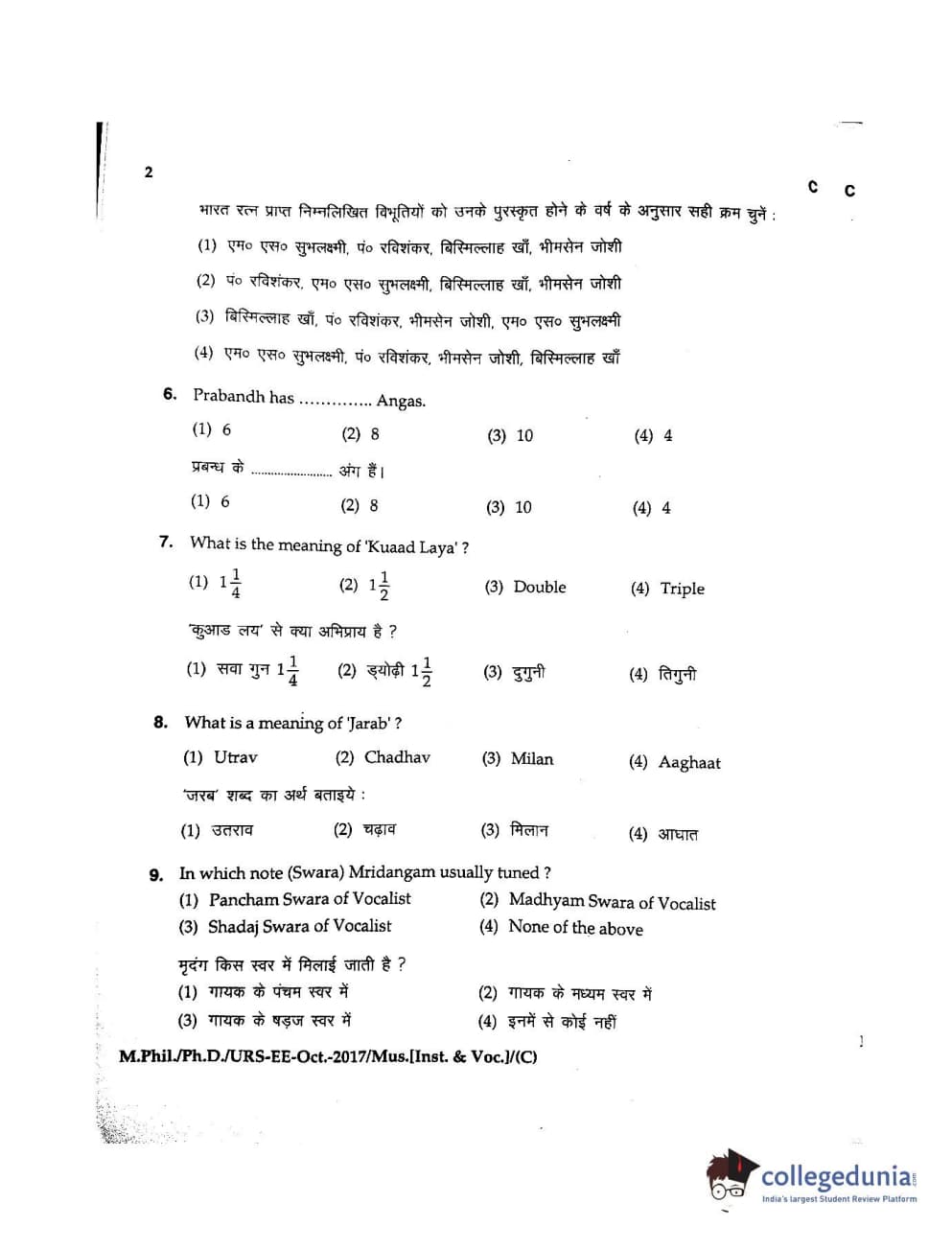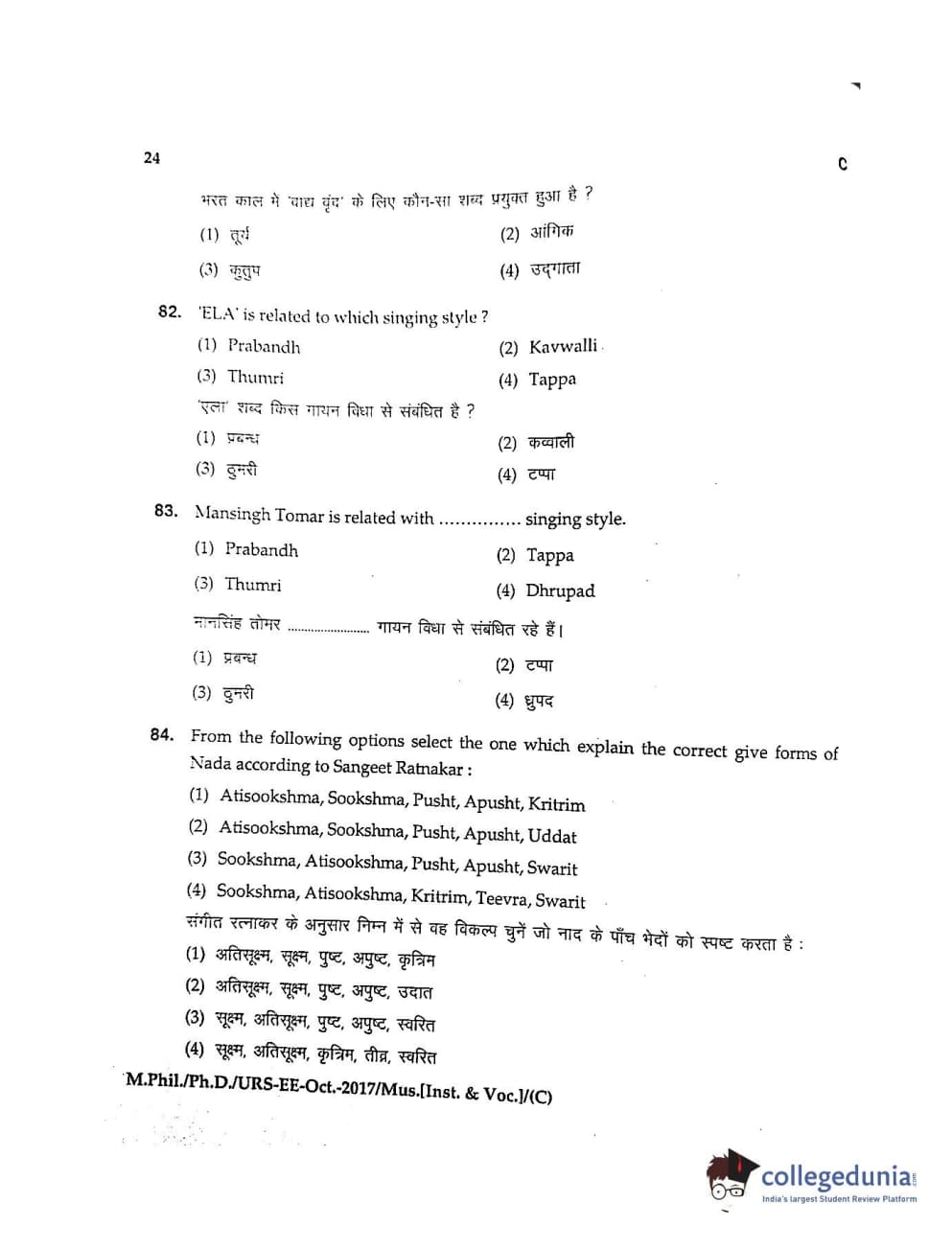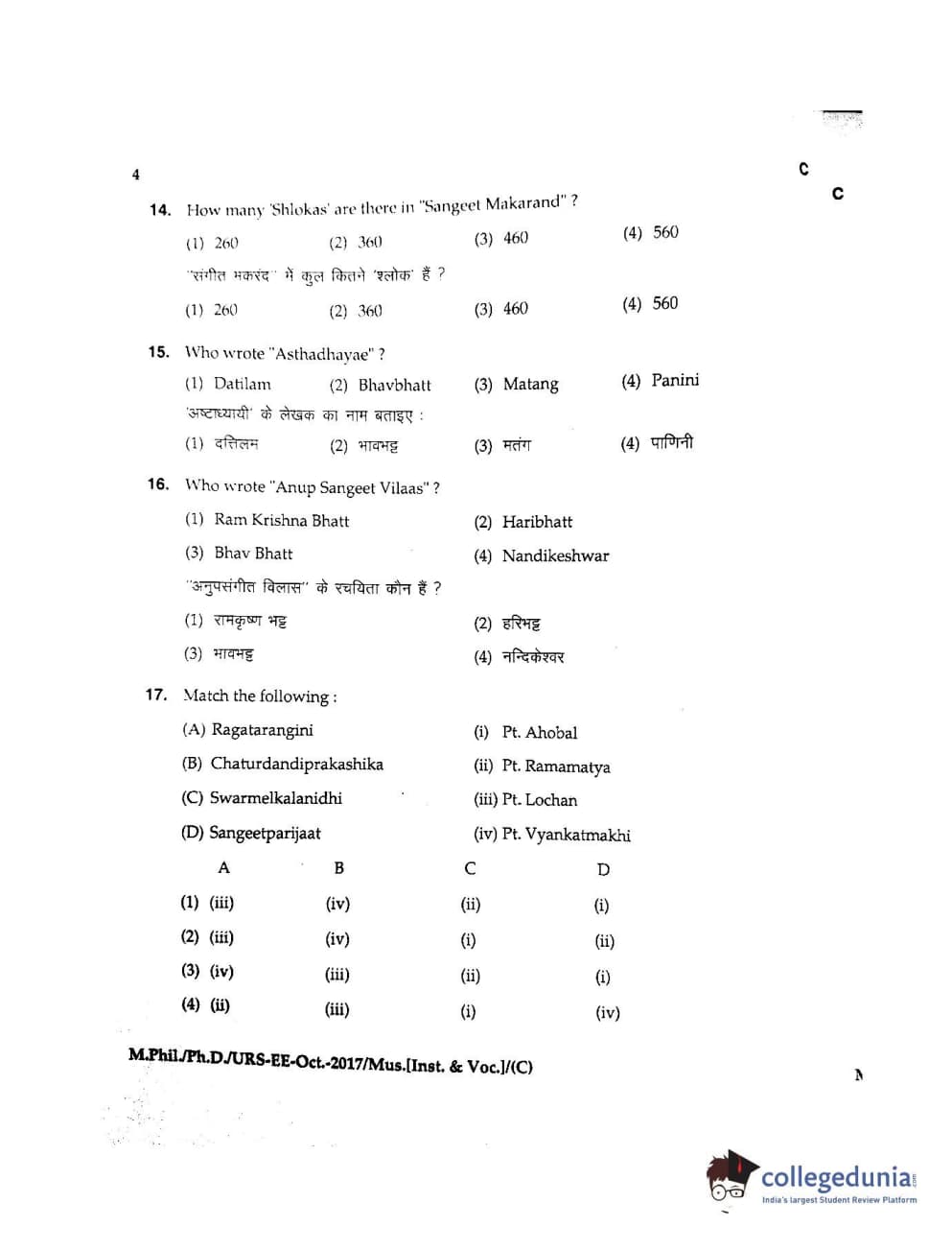 MDUCEE 2017 M.Phil./Ph.D./URS Music (Instrumental and Vocal) Set C Question Paper with Answer Key PDFs