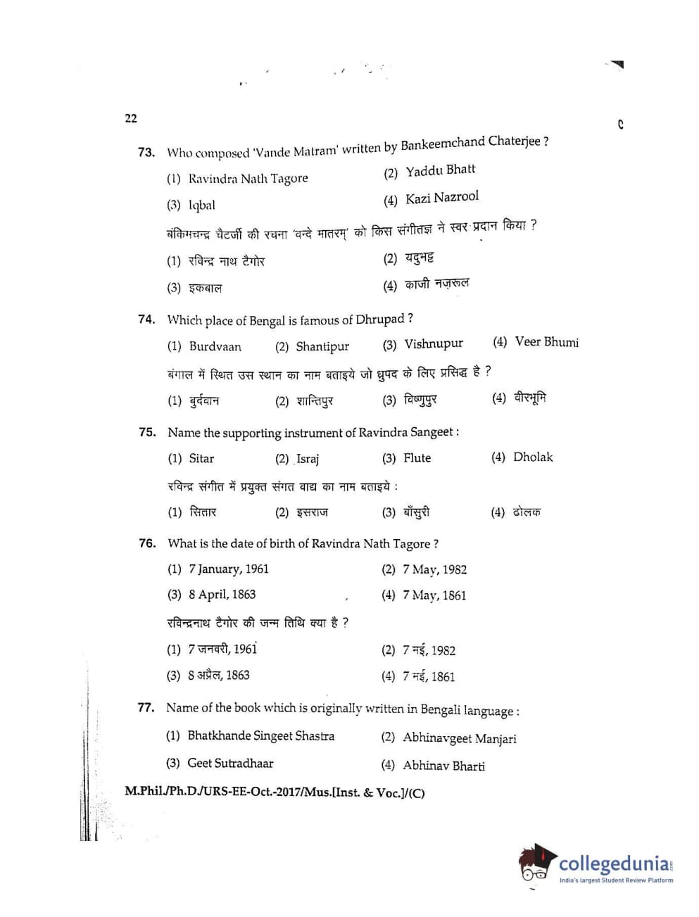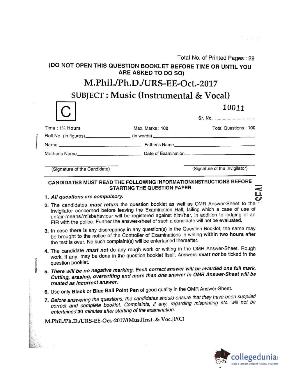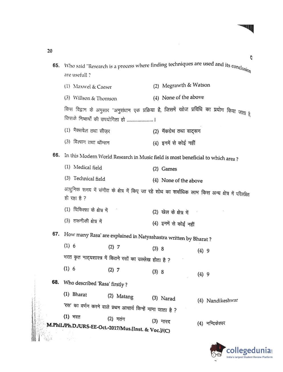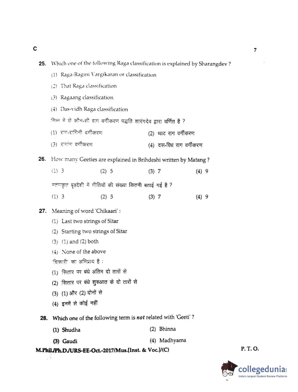 MDUCEE 2017 M.Phil./Ph.D./URS Music (Instrumental and Vocal) Set C Question Paper with Answer Key PDFs