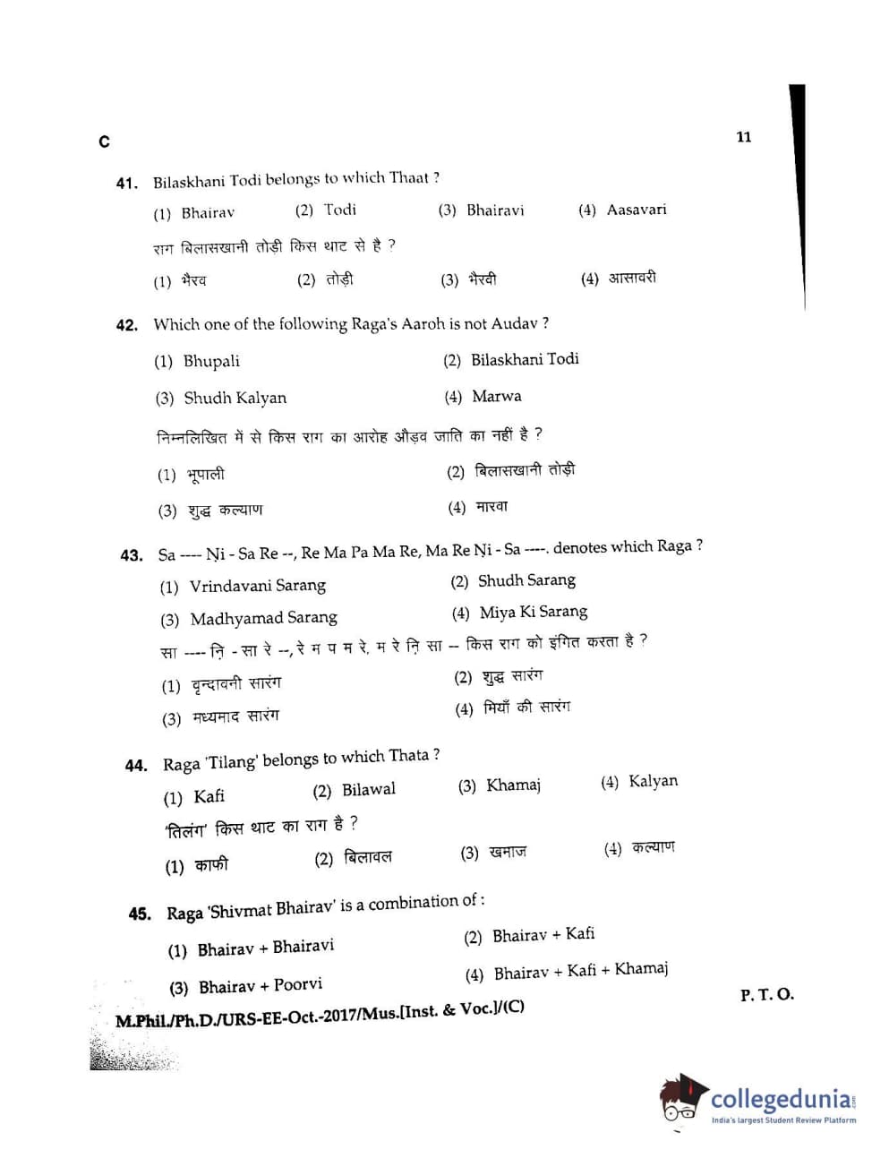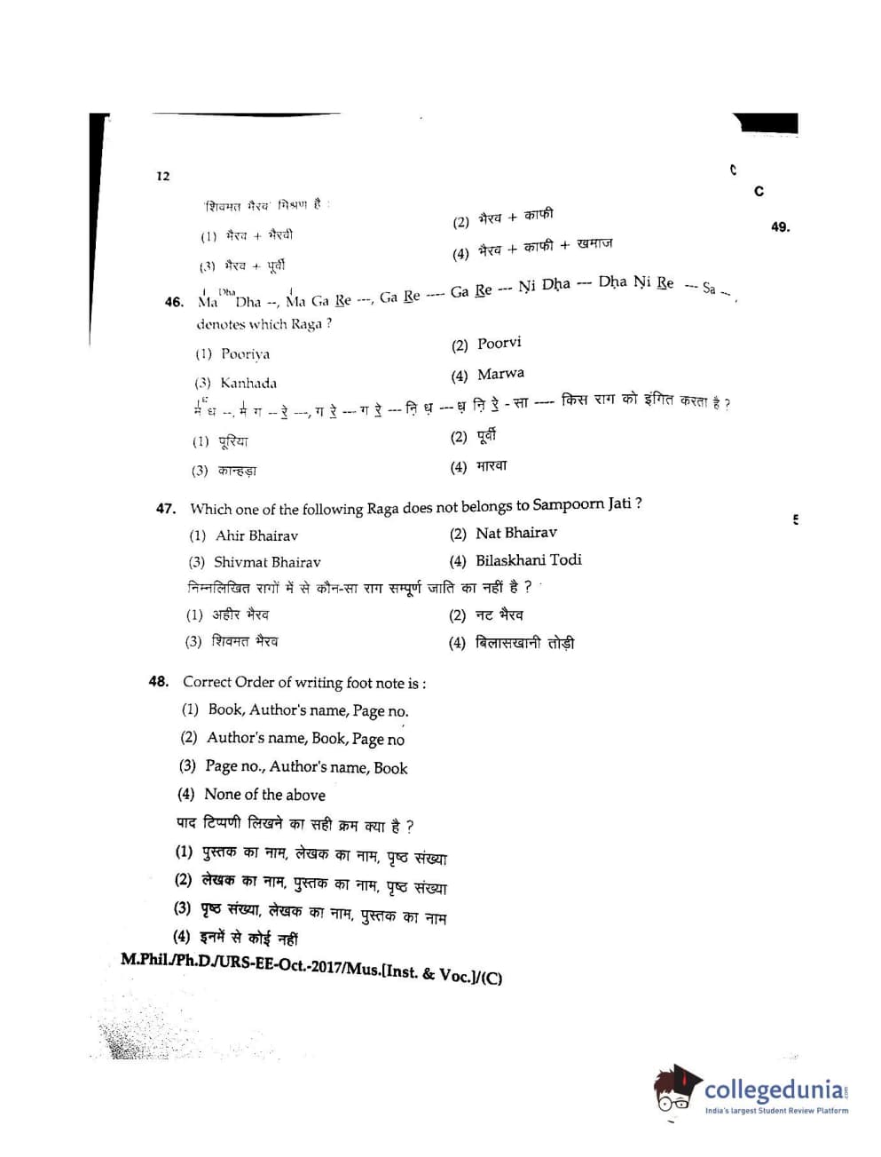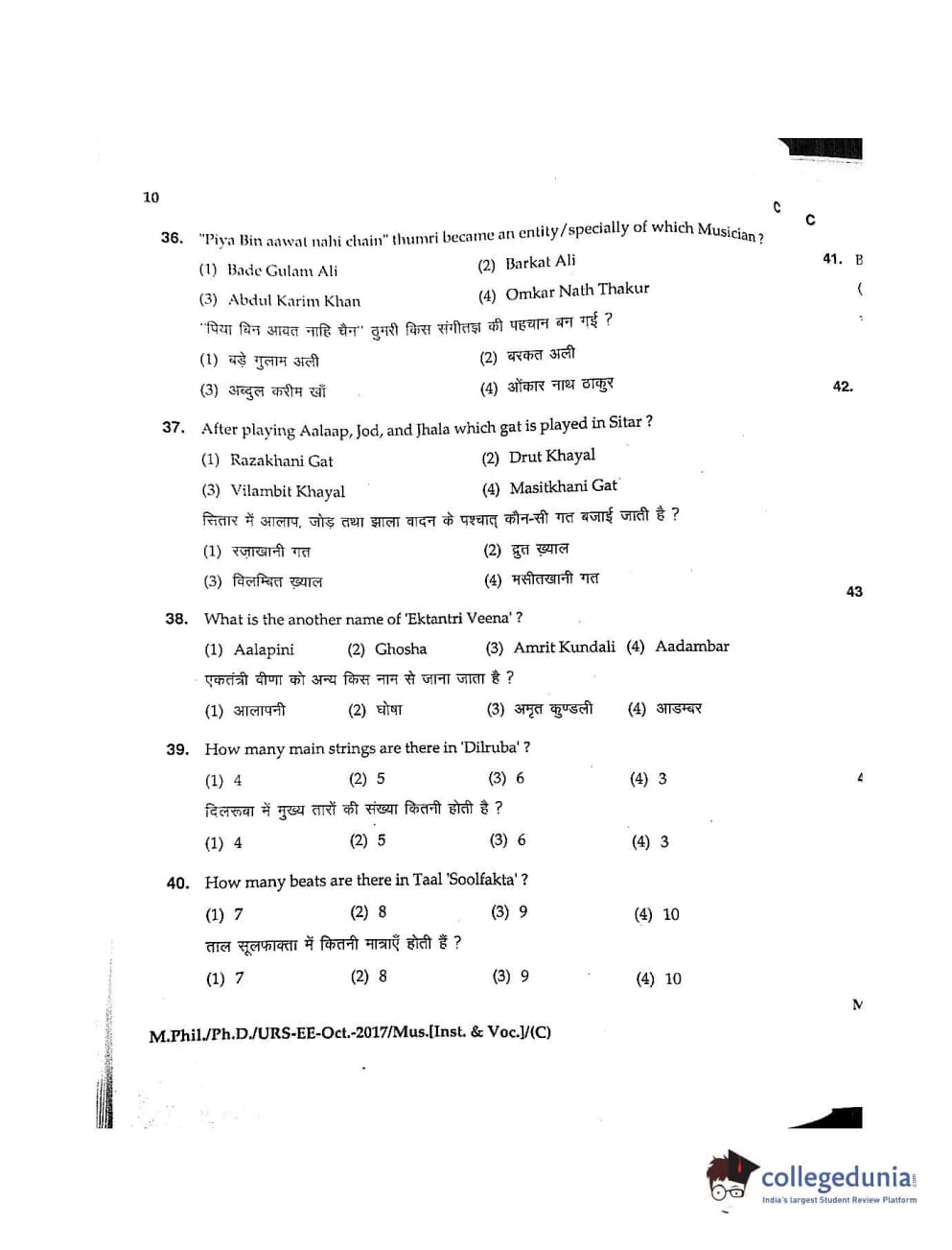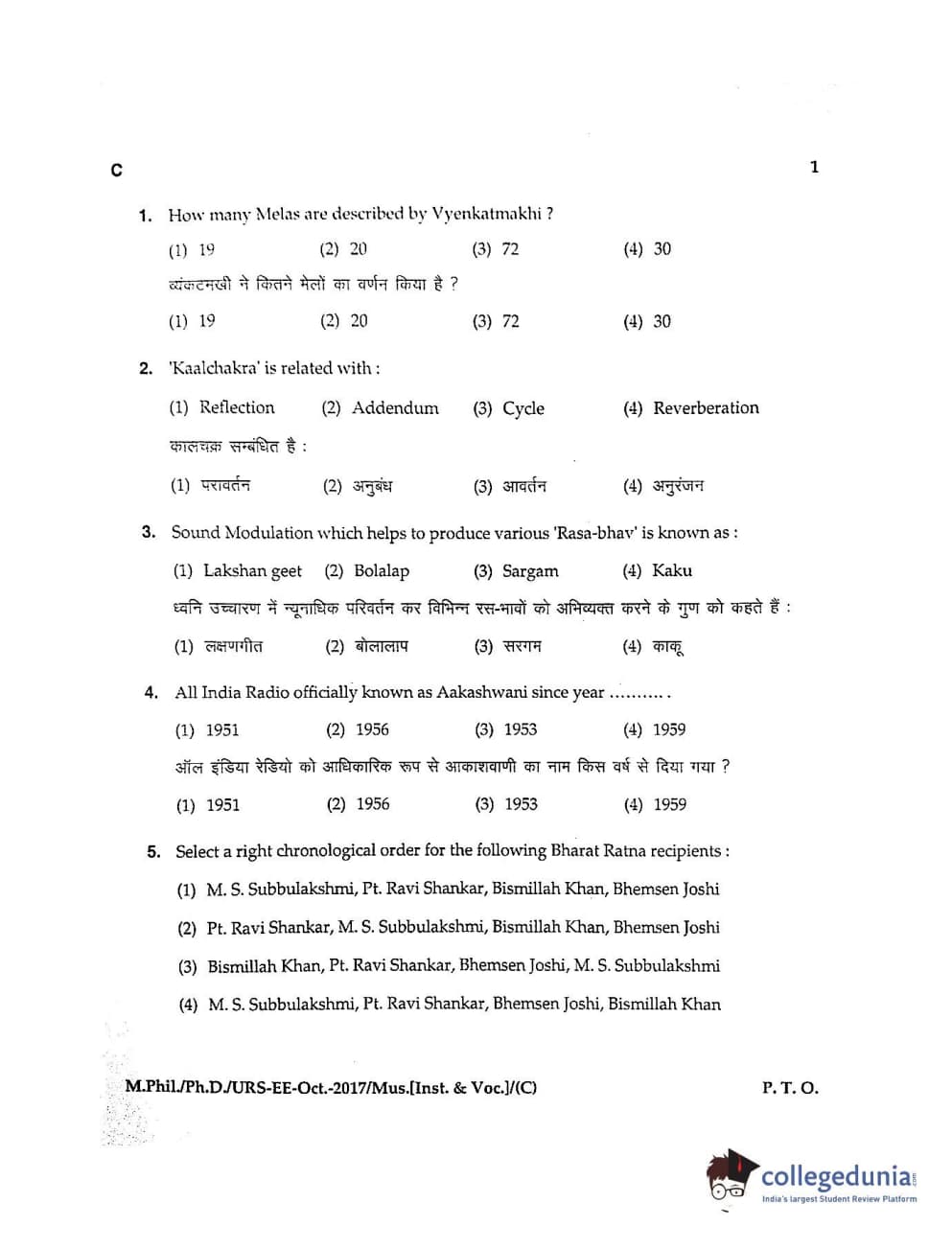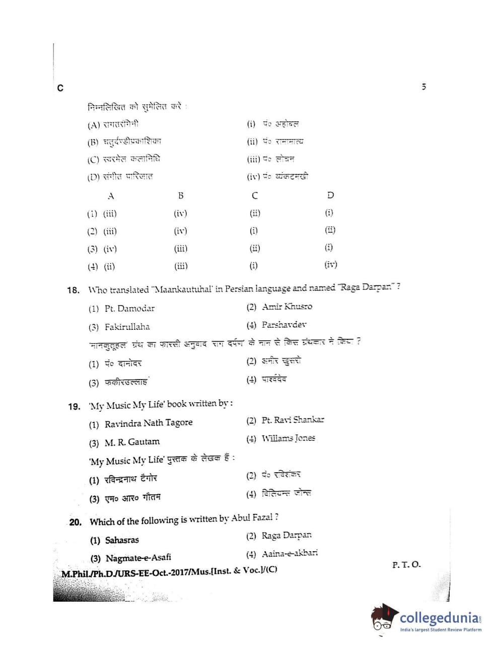 MDUCEE 2017 M.Phil./Ph.D./URS Music (Instrumental and Vocal) Set C Question Paper with Answer Key PDFs