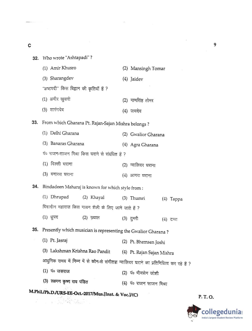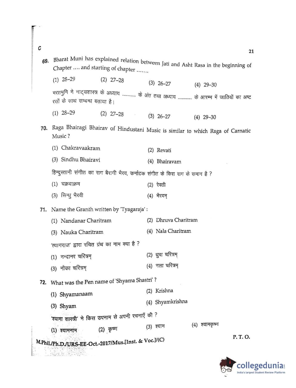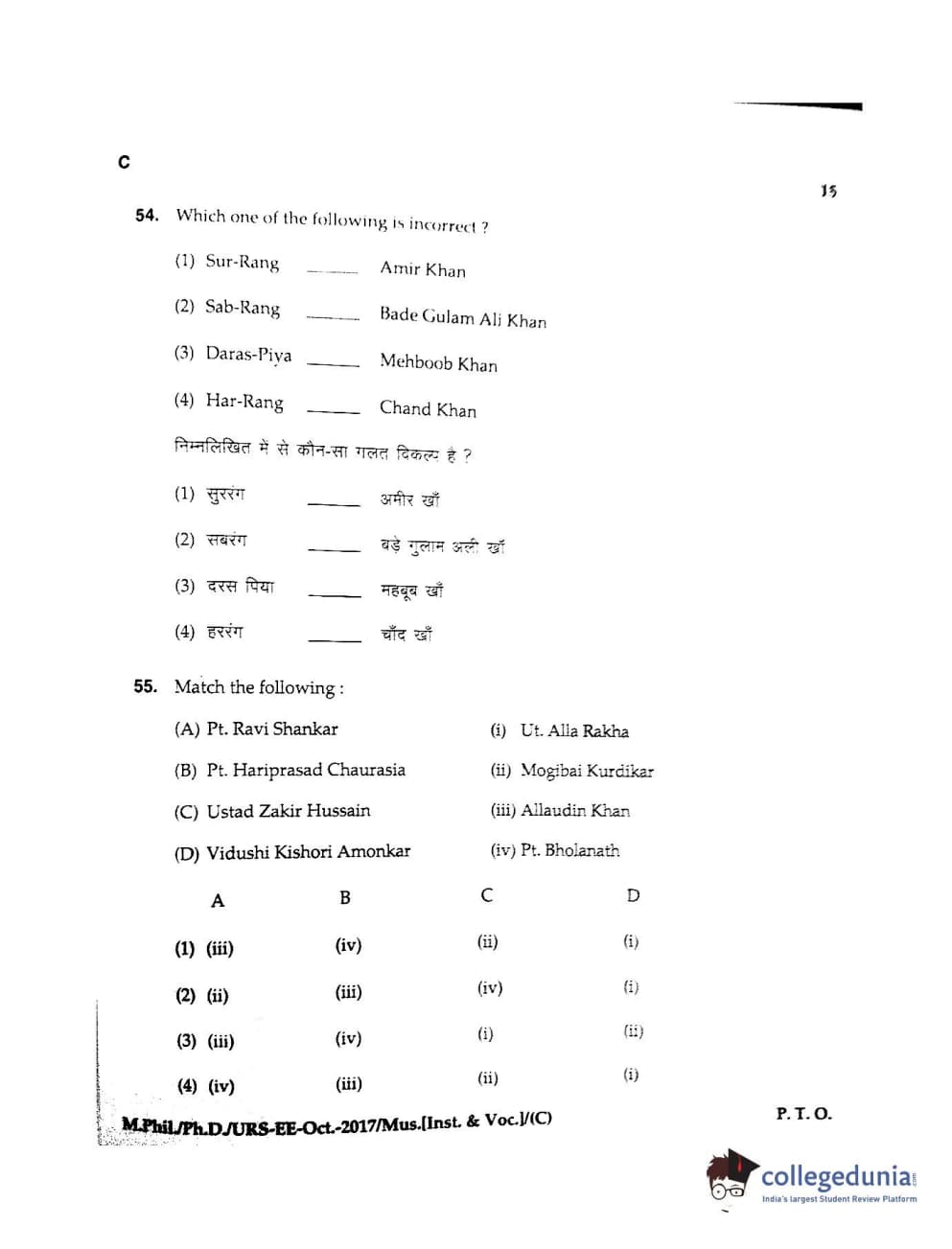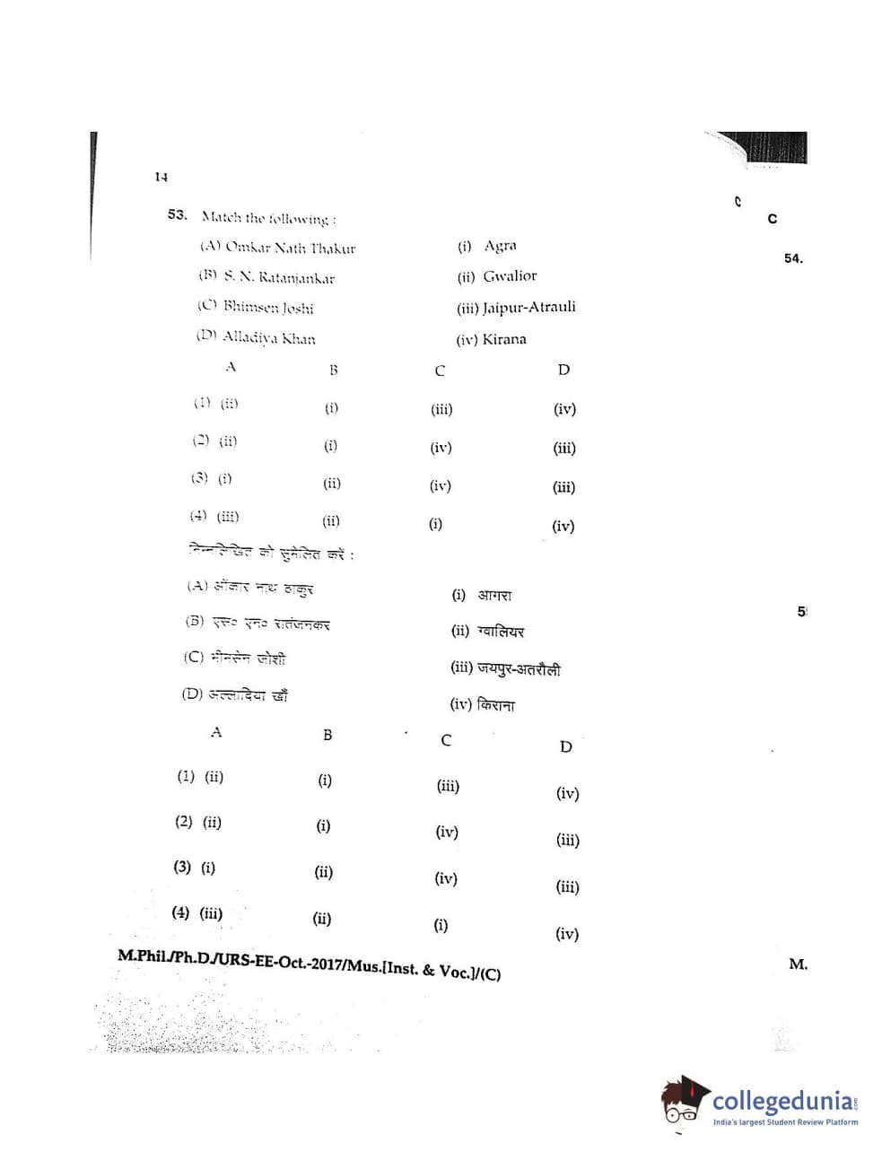 MDUCEE 2017 M.Phil./Ph.D./URS Music (Instrumental and Vocal) Set C Question Paper with Answer Key PDFs