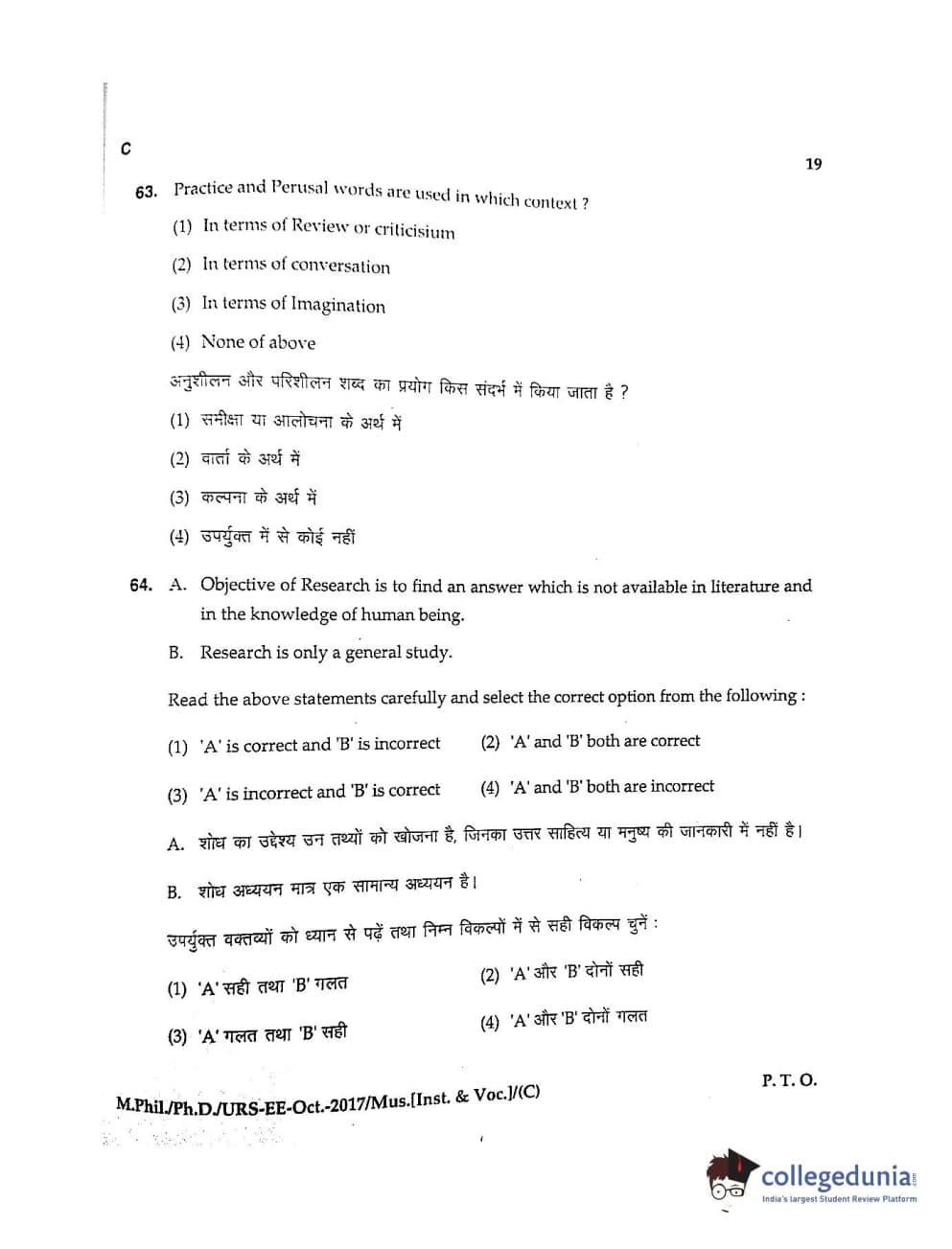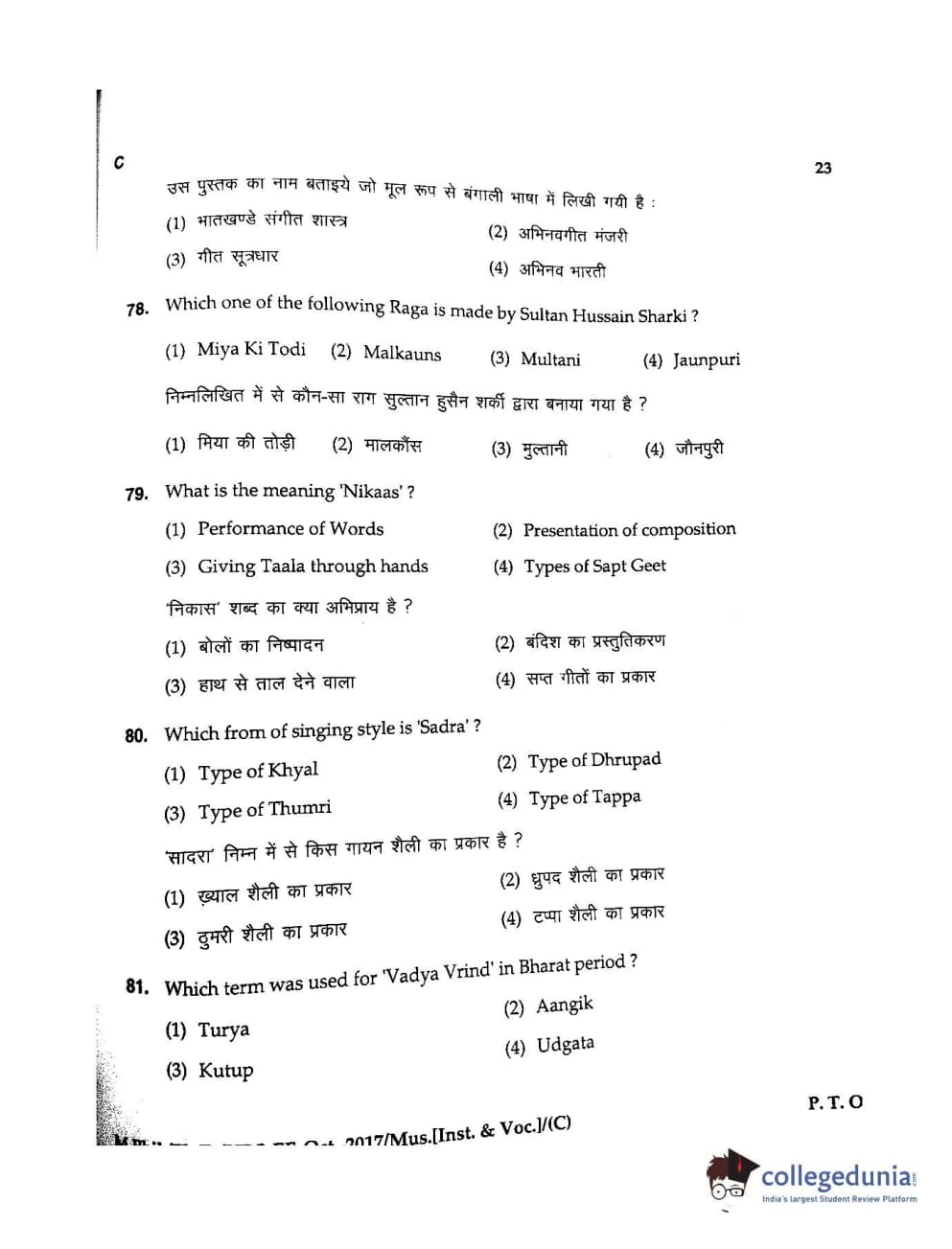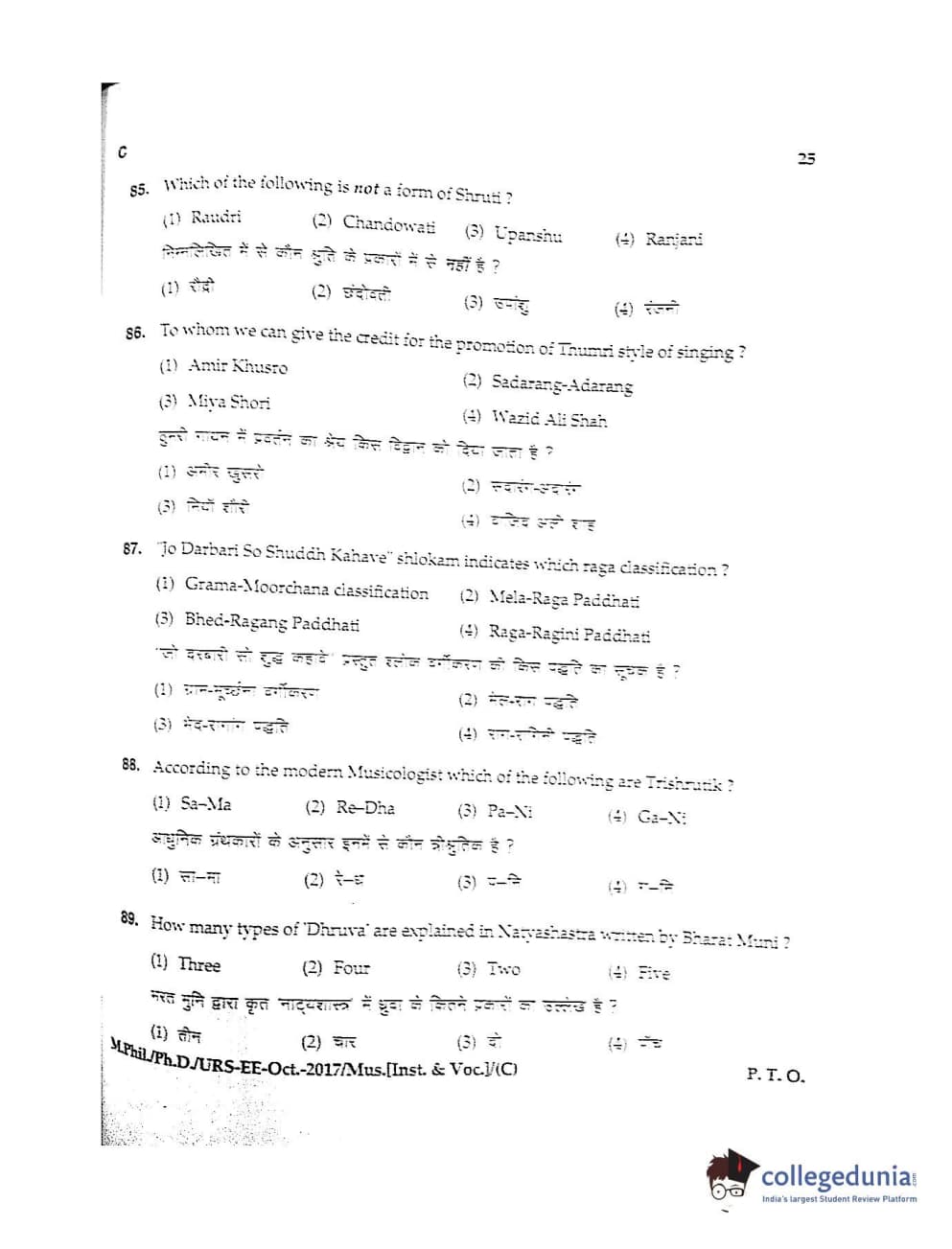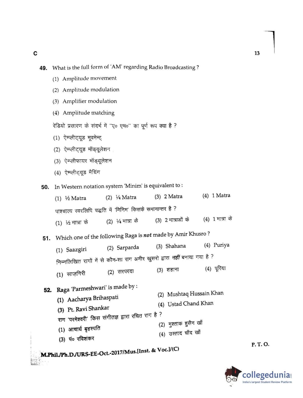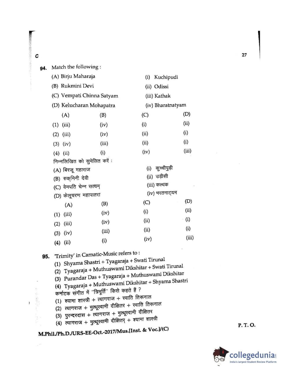 MDUCEE 2017 M.Phil./Ph.D./URS Music (Instrumental and Vocal) Set C Question Paper with Answer Key PDFs