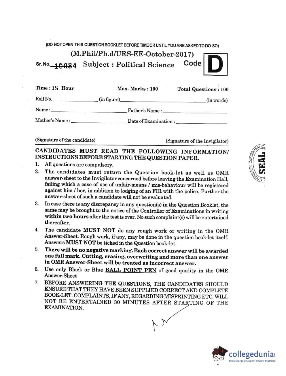 MDUCEE 2017 M.Phil./Ph.D./URS Political Science Set D Question paper with answer key pdf is available for download. The exam was successfully organized by Maharishi Dayanand University. The question paper comprised a total of 100 questions.