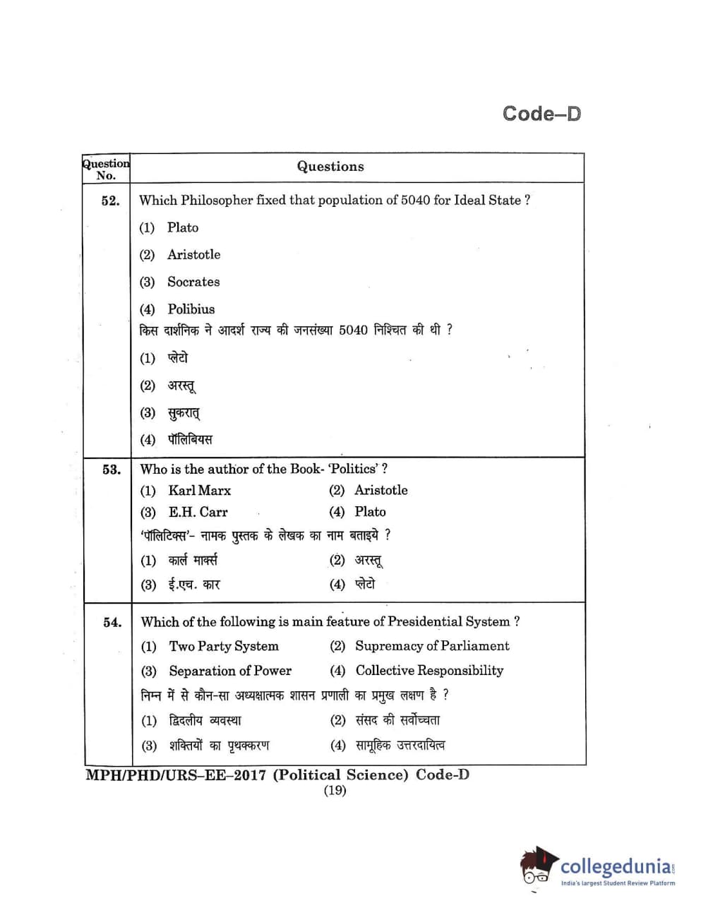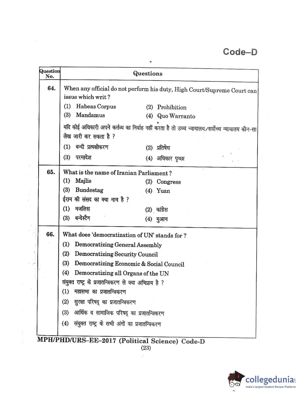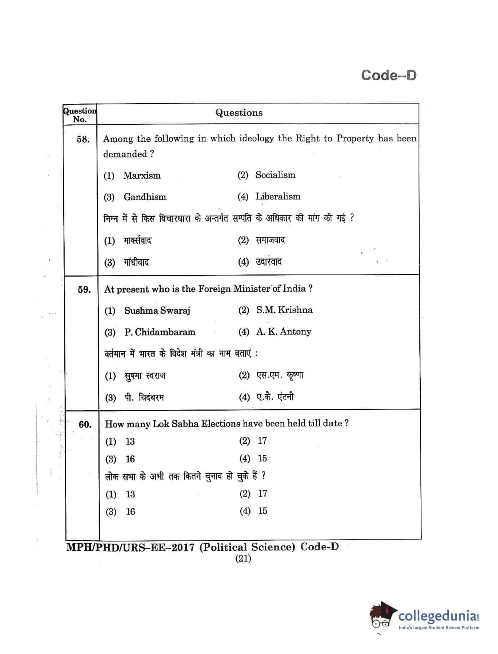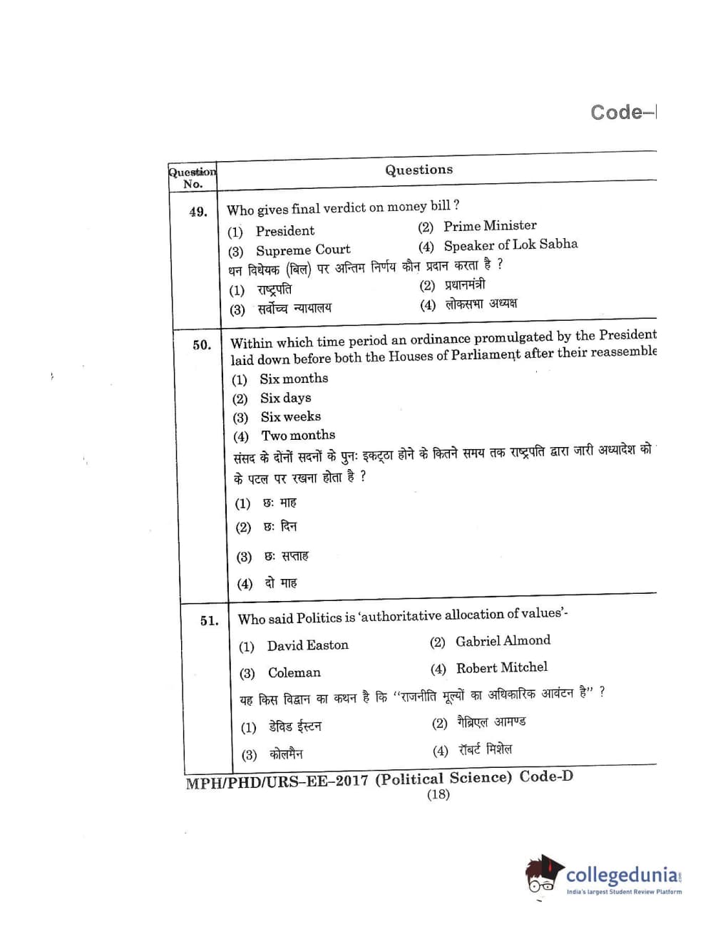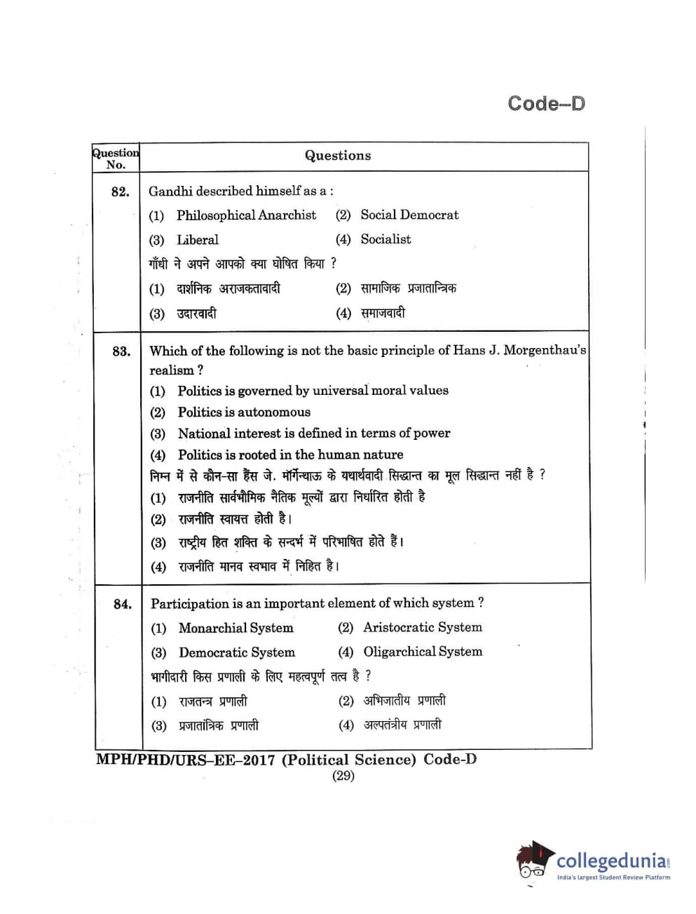 MDUCEE 2017 M.Phil./Ph.D./URS Political Science Set D Question Paper with Answer Key PDFs