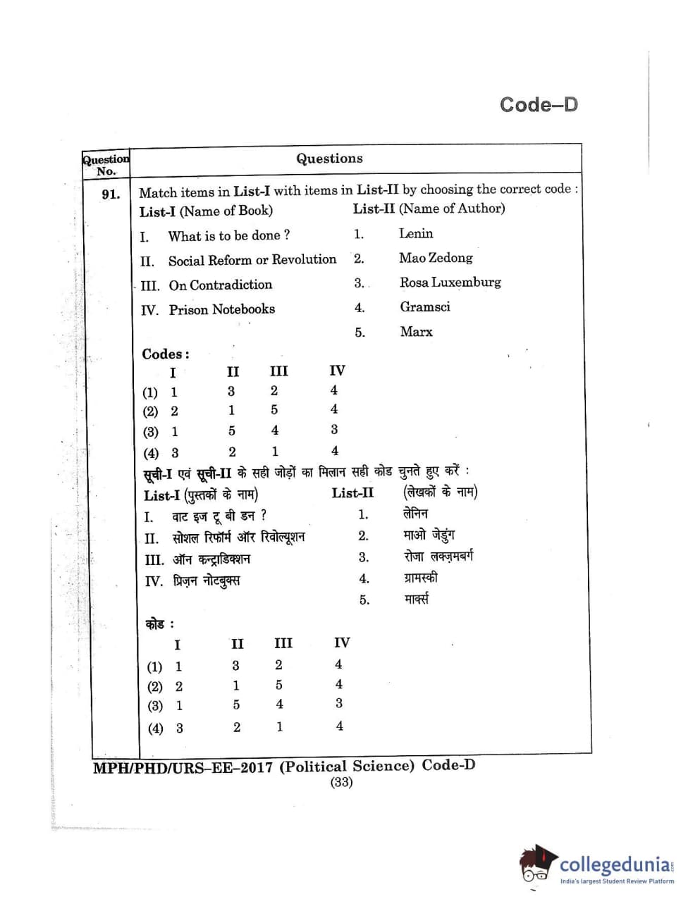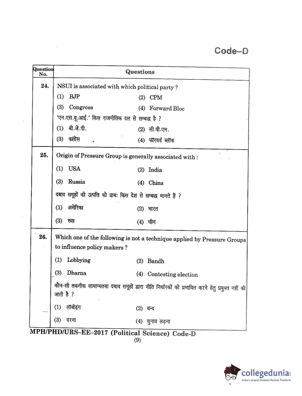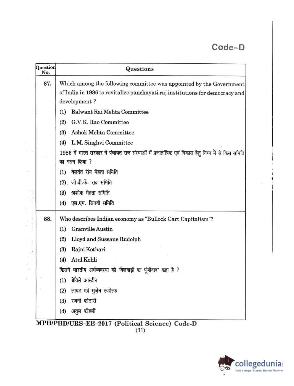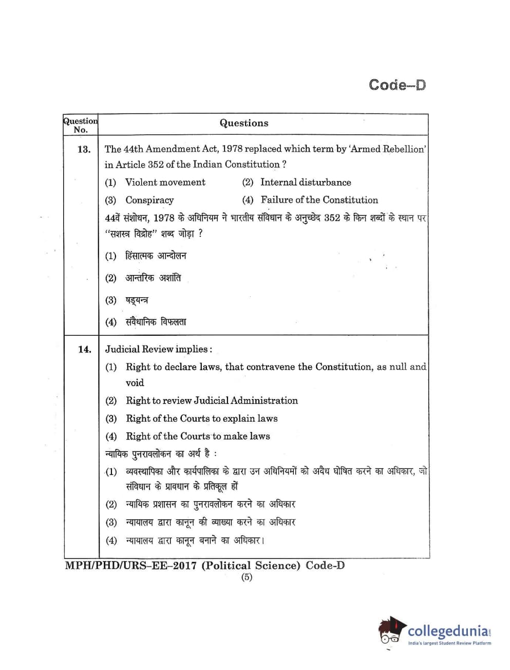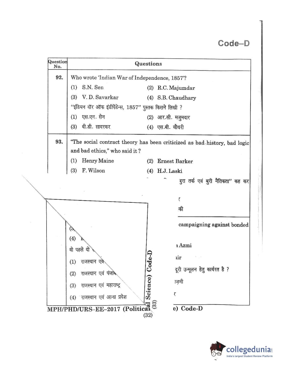 MDUCEE 2017 M.Phil./Ph.D./URS Political Science Set D Question Paper with Answer Key PDFs