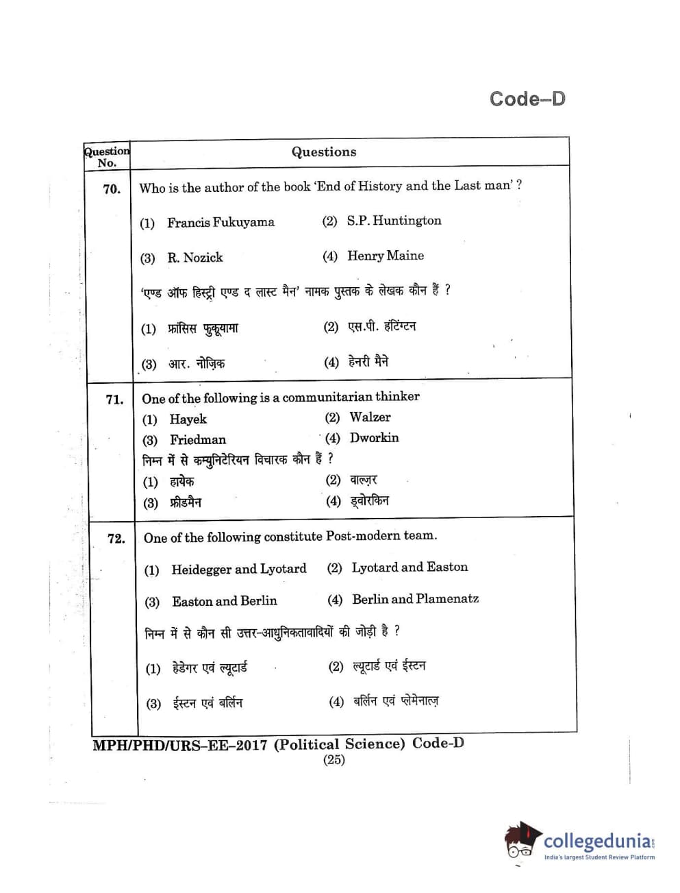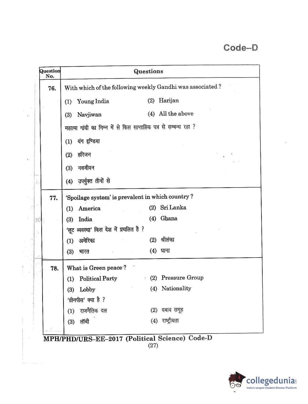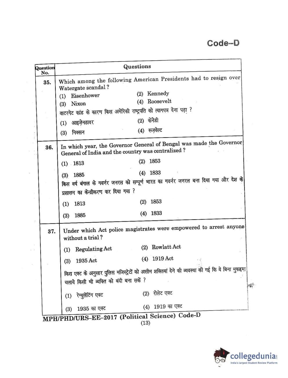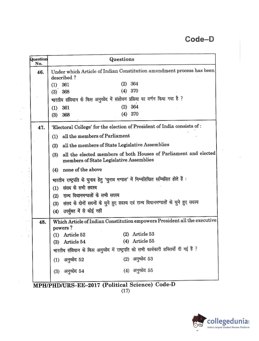 MDUCEE 2017 M.Phil./Ph.D./URS Political Science Set D Question Paper with Answer Key PDFs