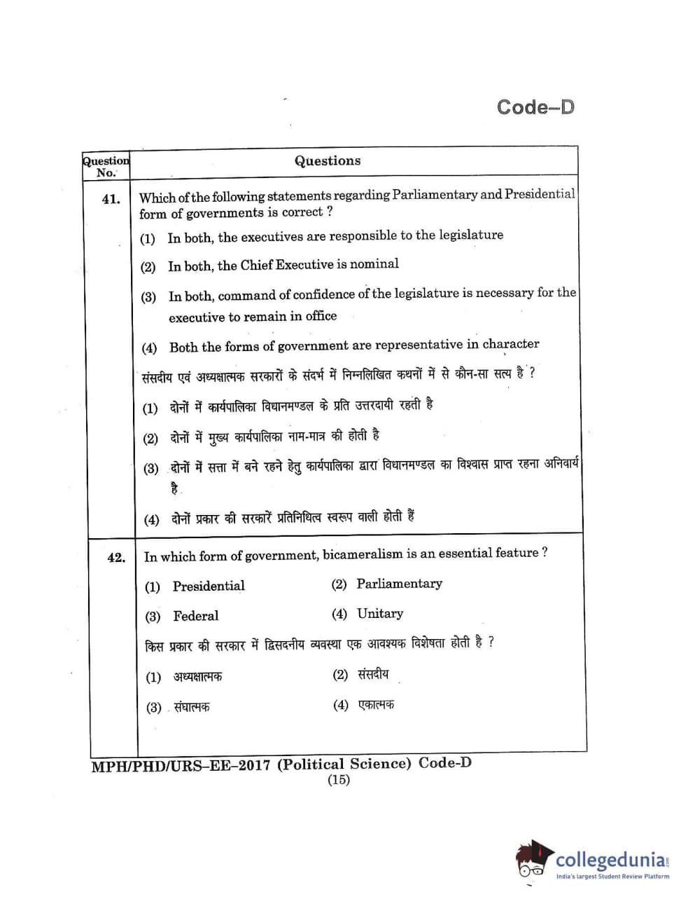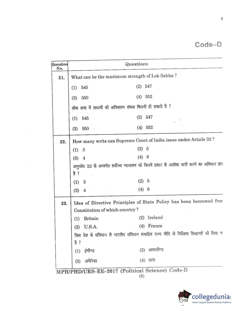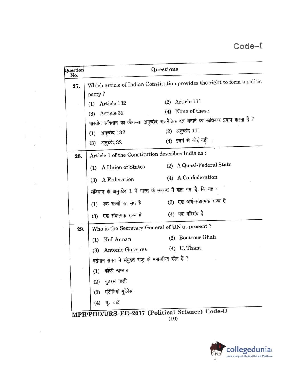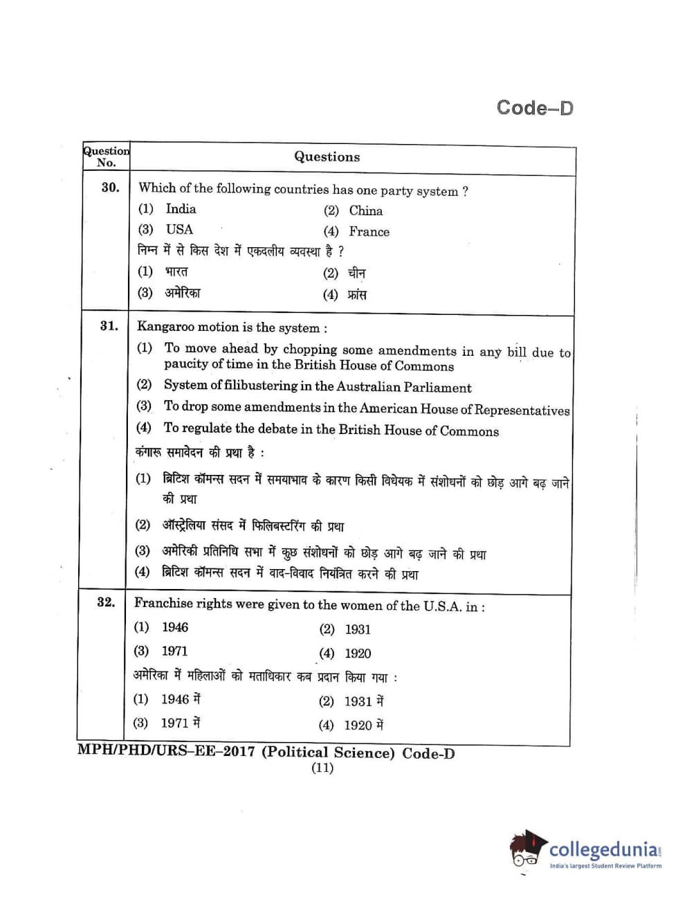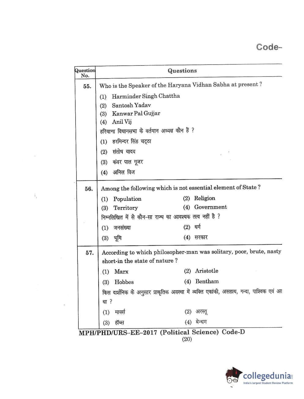MDUCEE 2017 M.Phil./Ph.D./URS Political Science Set D Question Paper with Answer Key PDFs