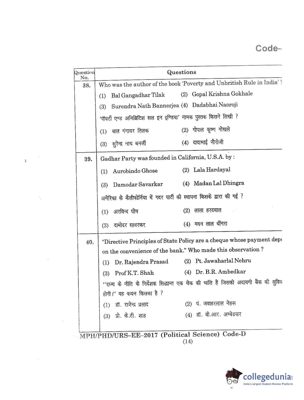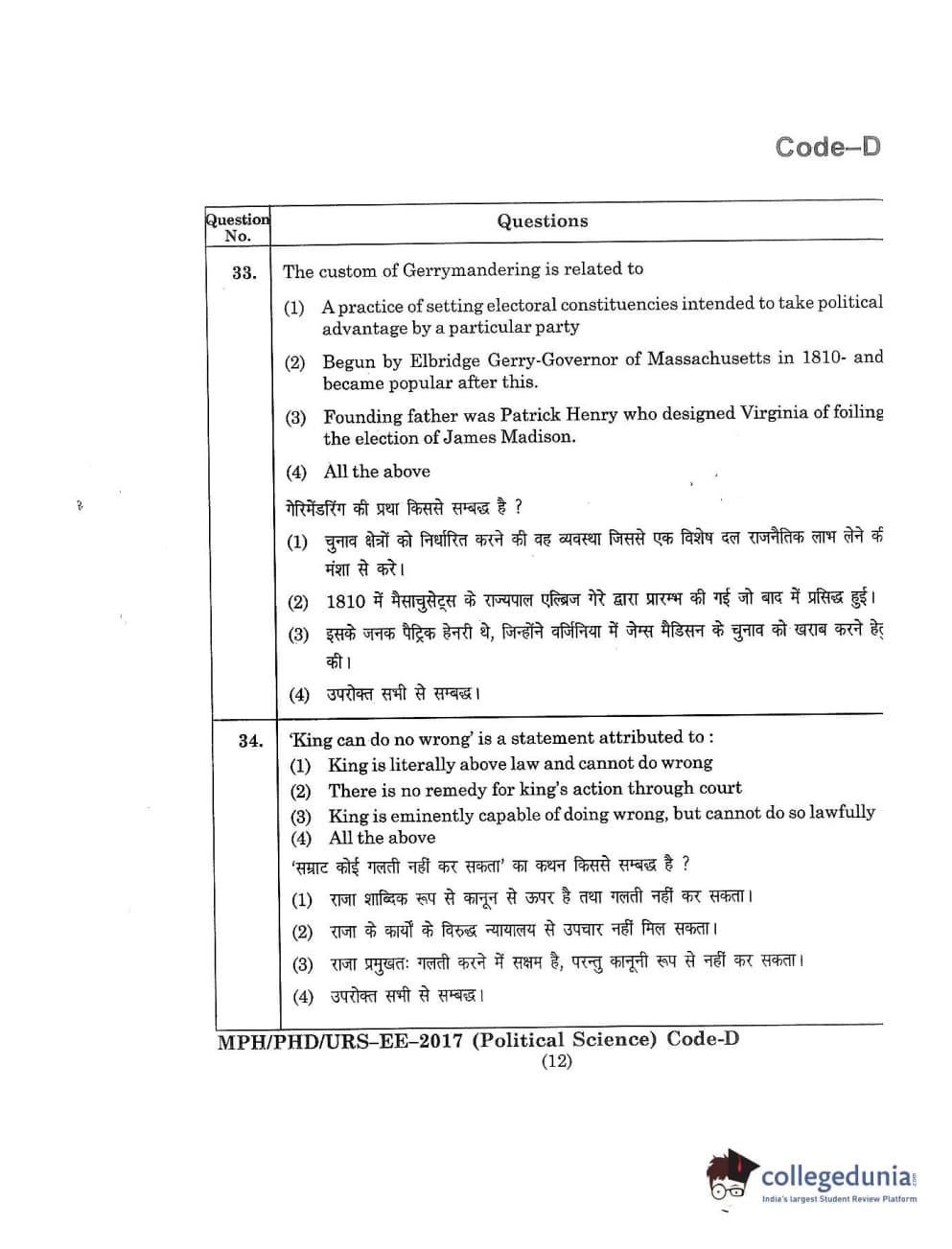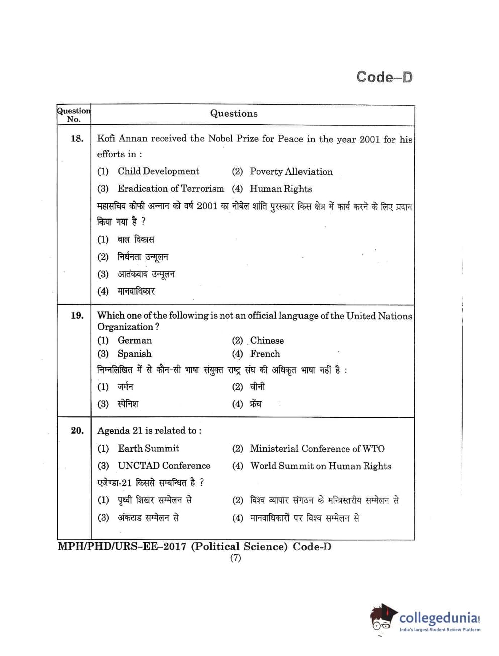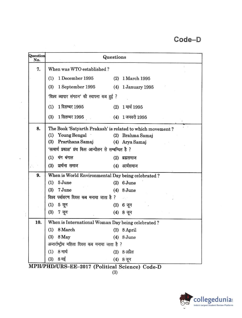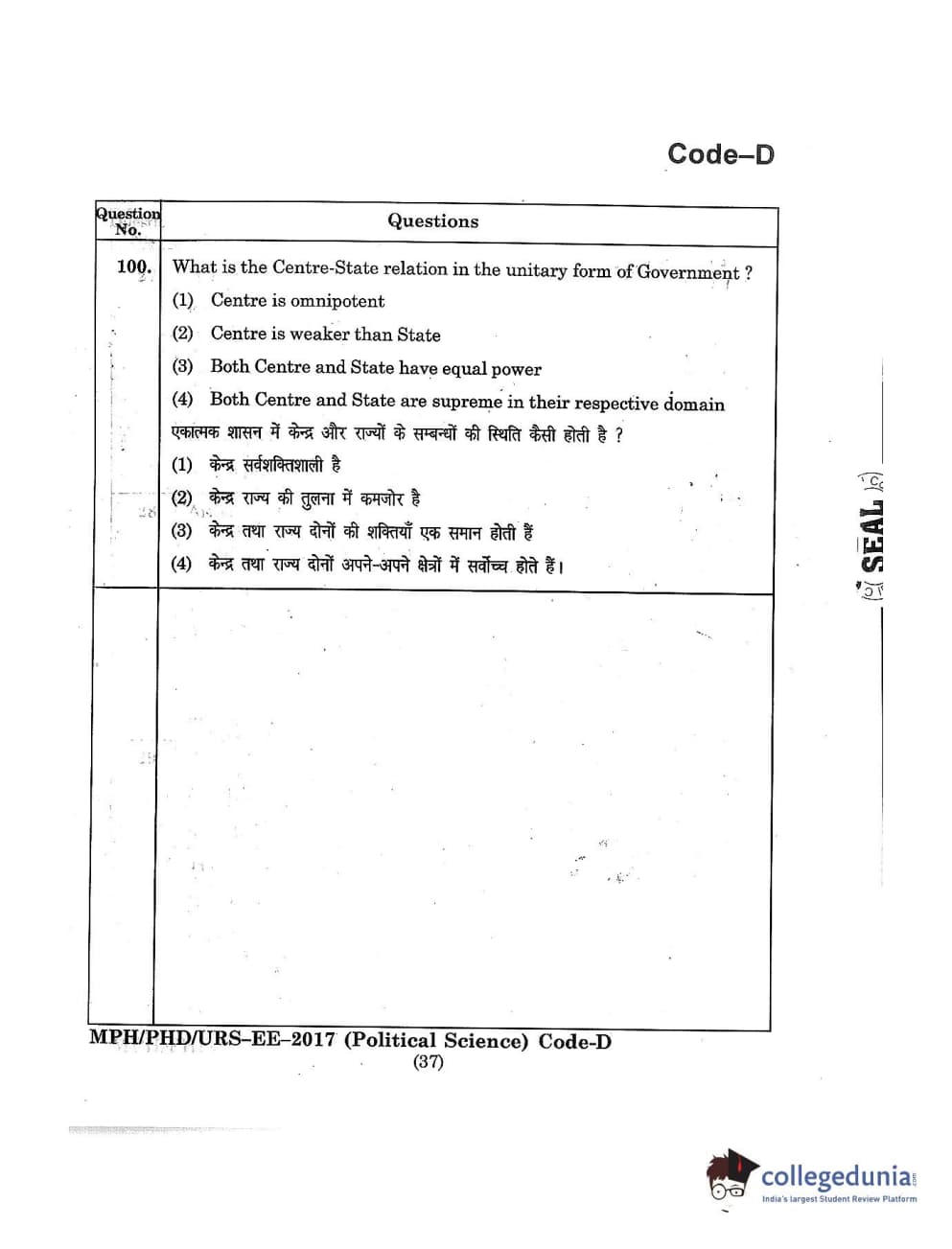 MDUCEE 2017 M.Phil./Ph.D./URS Political Science Set D Question Paper with Answer Key PDFs