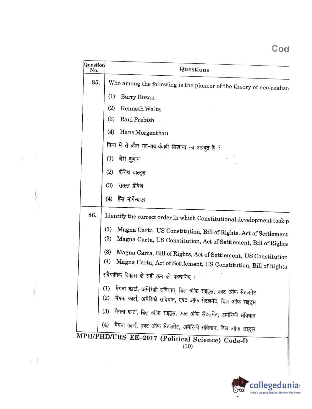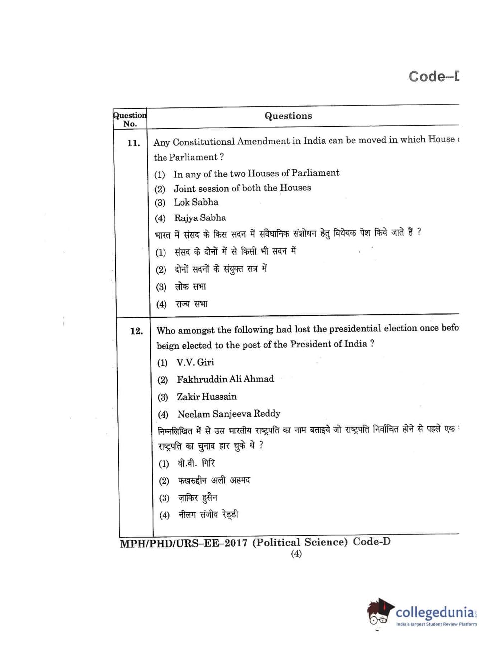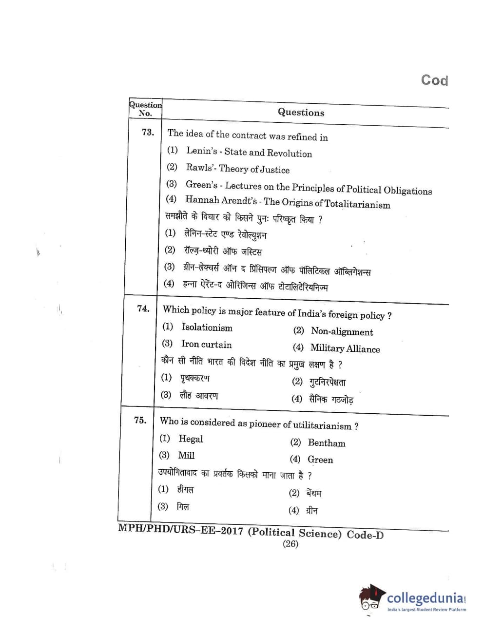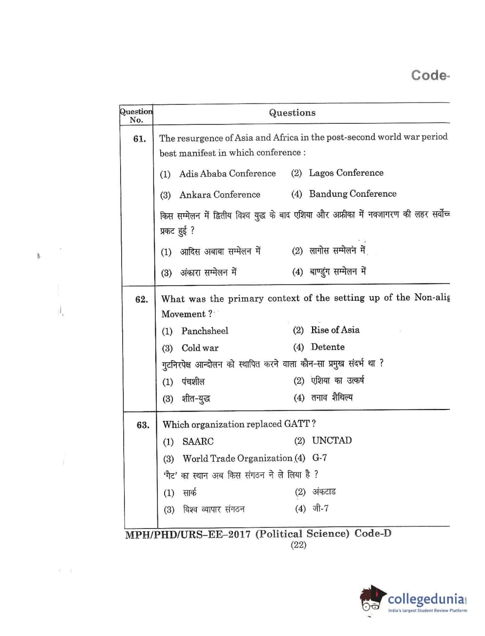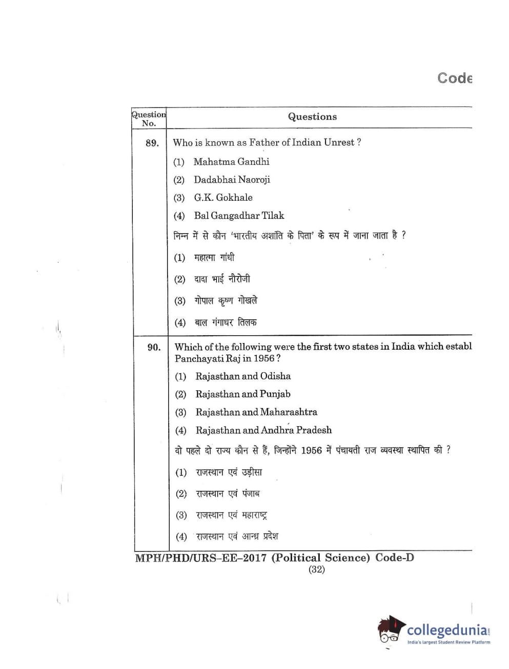 MDUCEE 2017 M.Phil./Ph.D./URS Political Science Set D Question Paper with Answer Key PDFs