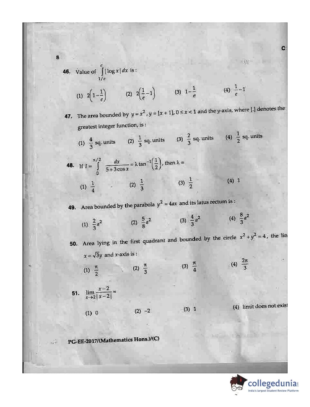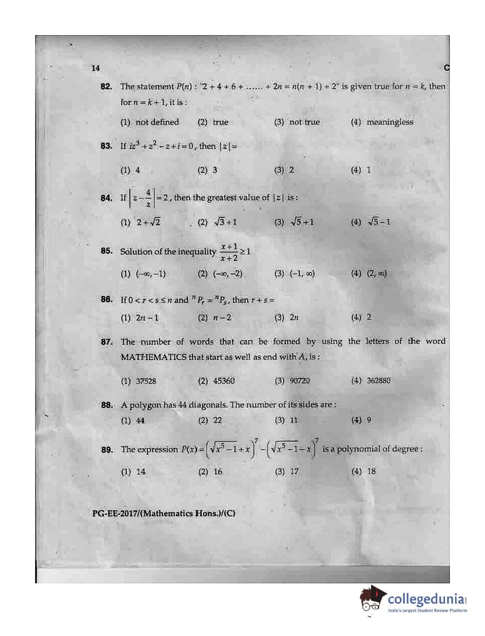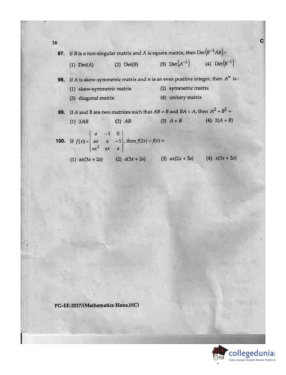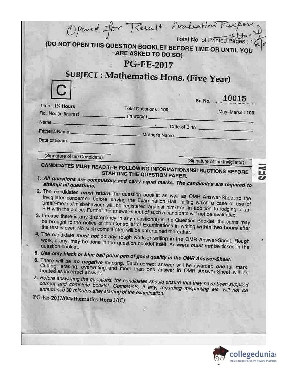 MDUCEE 2017 M.Sc. (Hons) Math 5 Year Integrated Set C Question Paper with Answer Key PDFs