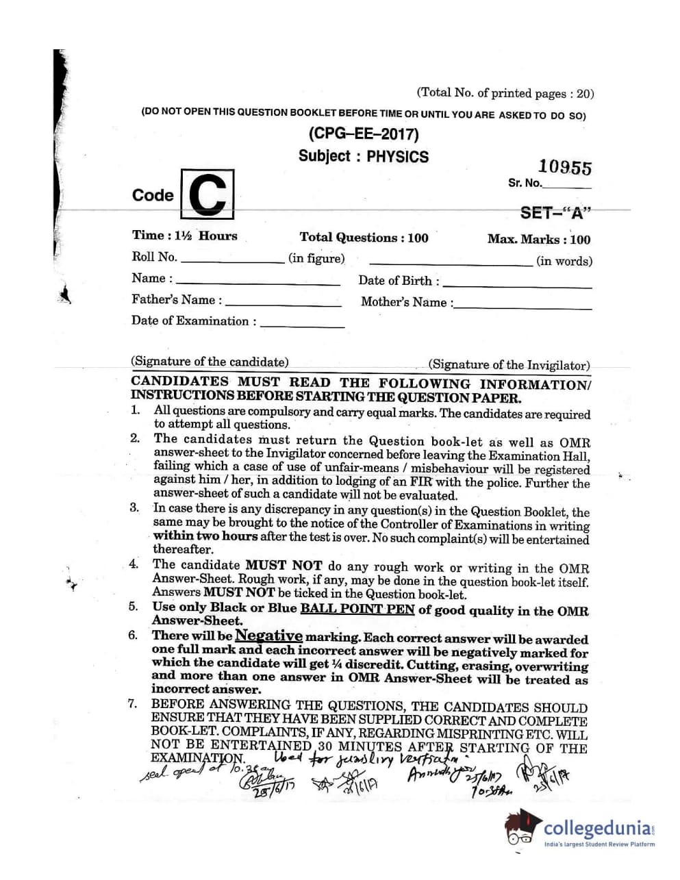 MDUCEE 2017 Physics Set C Question paper with answer key pdf is available for download. The exam was successfully organized by Maharishi Dayanand University. The question paper comprised a total of 100 questions.