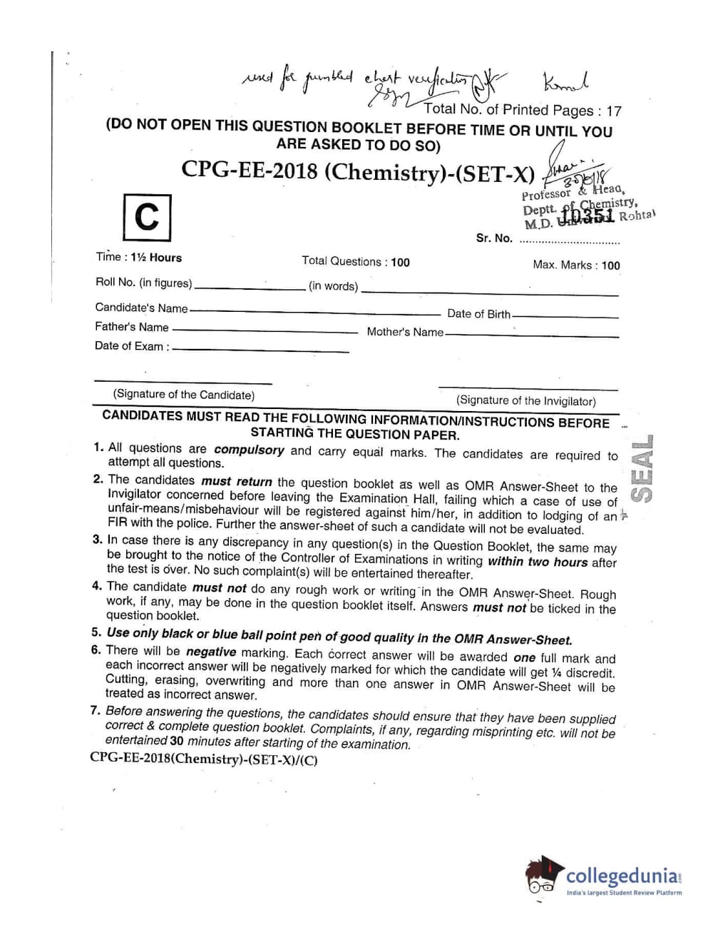 MDUCEE 2018 Chemistry Set C Question paper with answer key pdf is available for download. The exam was successfully organized by Maharishi Dayanand University. The question paper comprised a total of 100 questions.