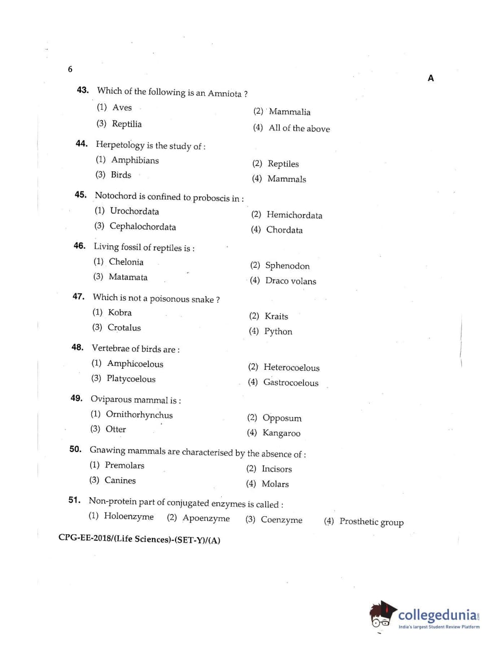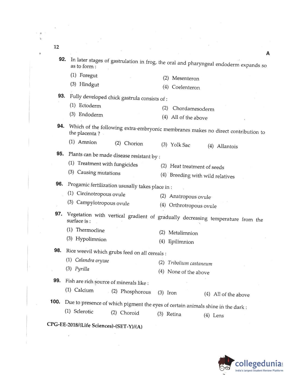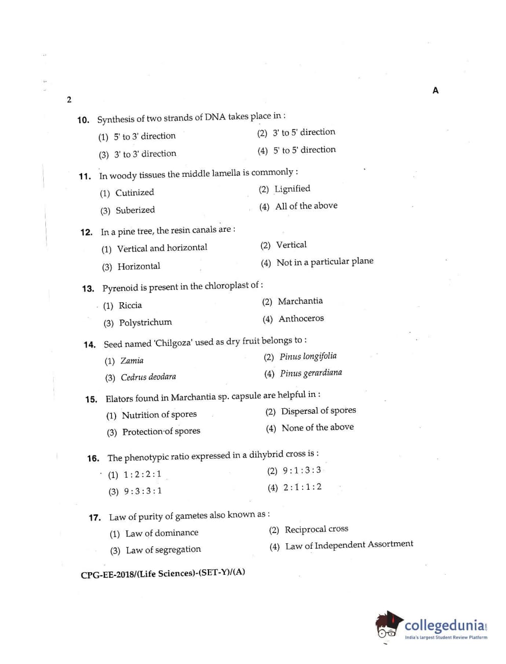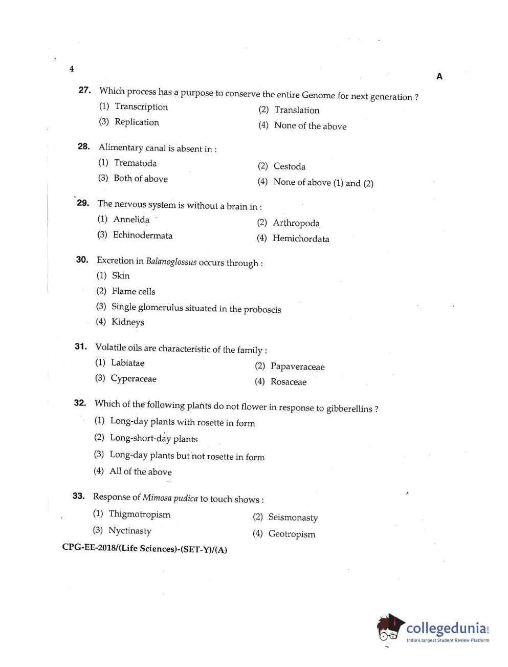MDUCEE 2018 Life Sciences Set A Question Paper with Answer Key PDFs