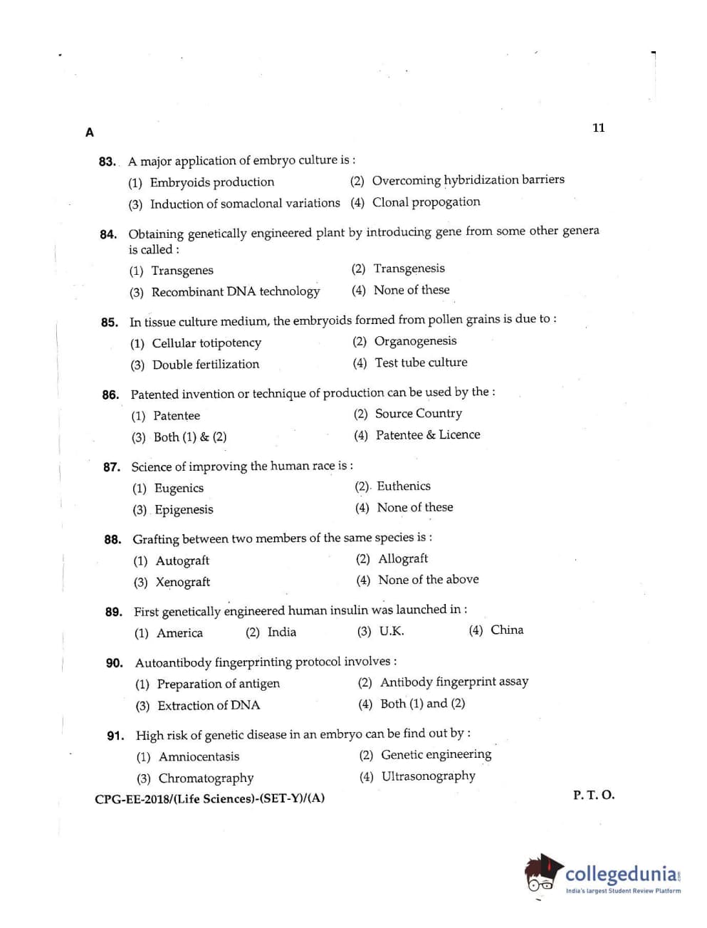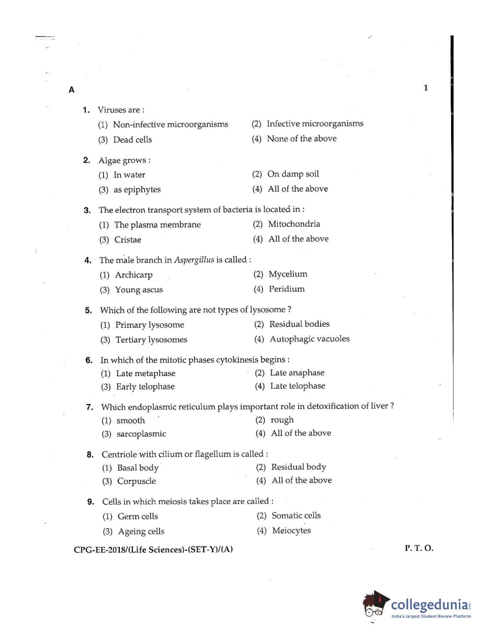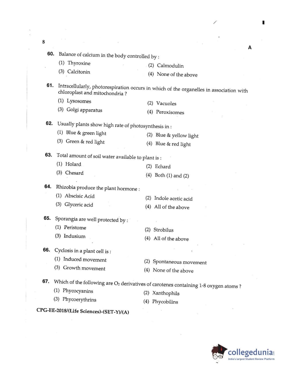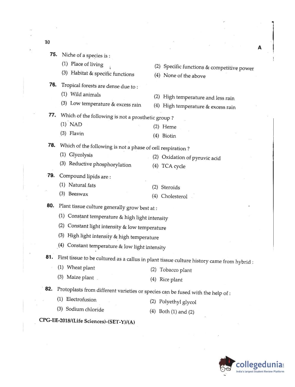 MDUCEE 2018 Life Sciences Set A Question Paper with Answer Key PDFs