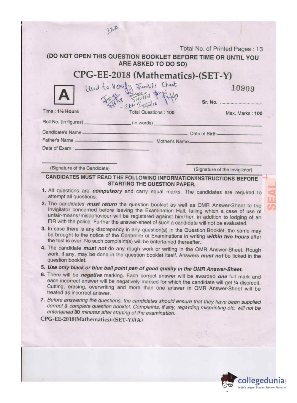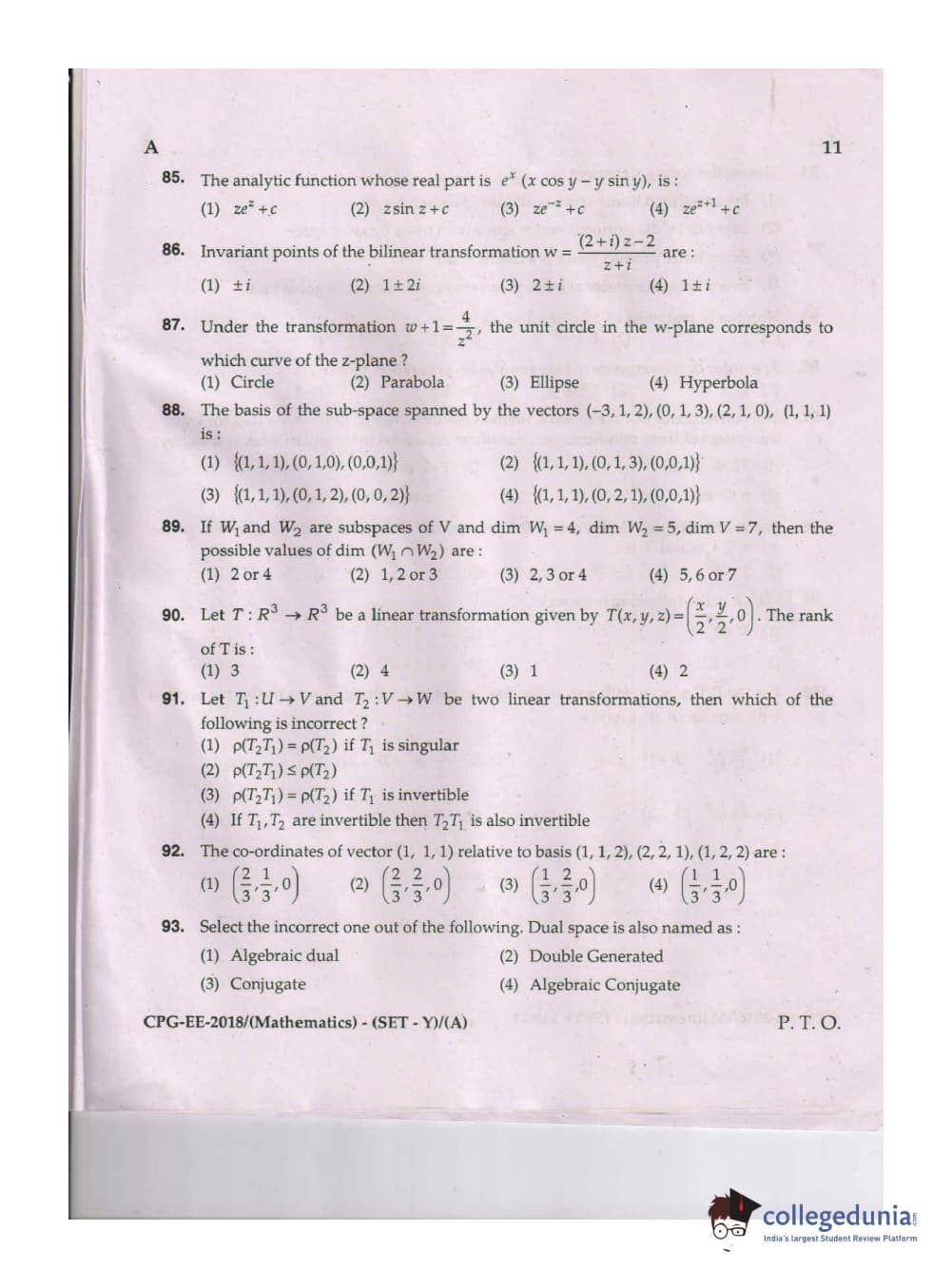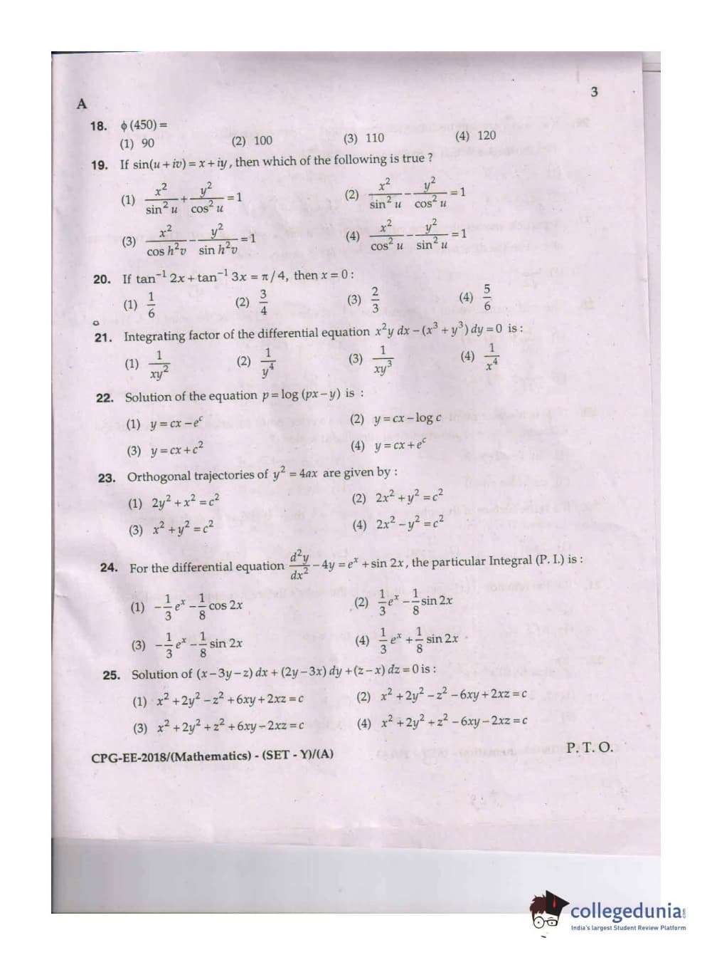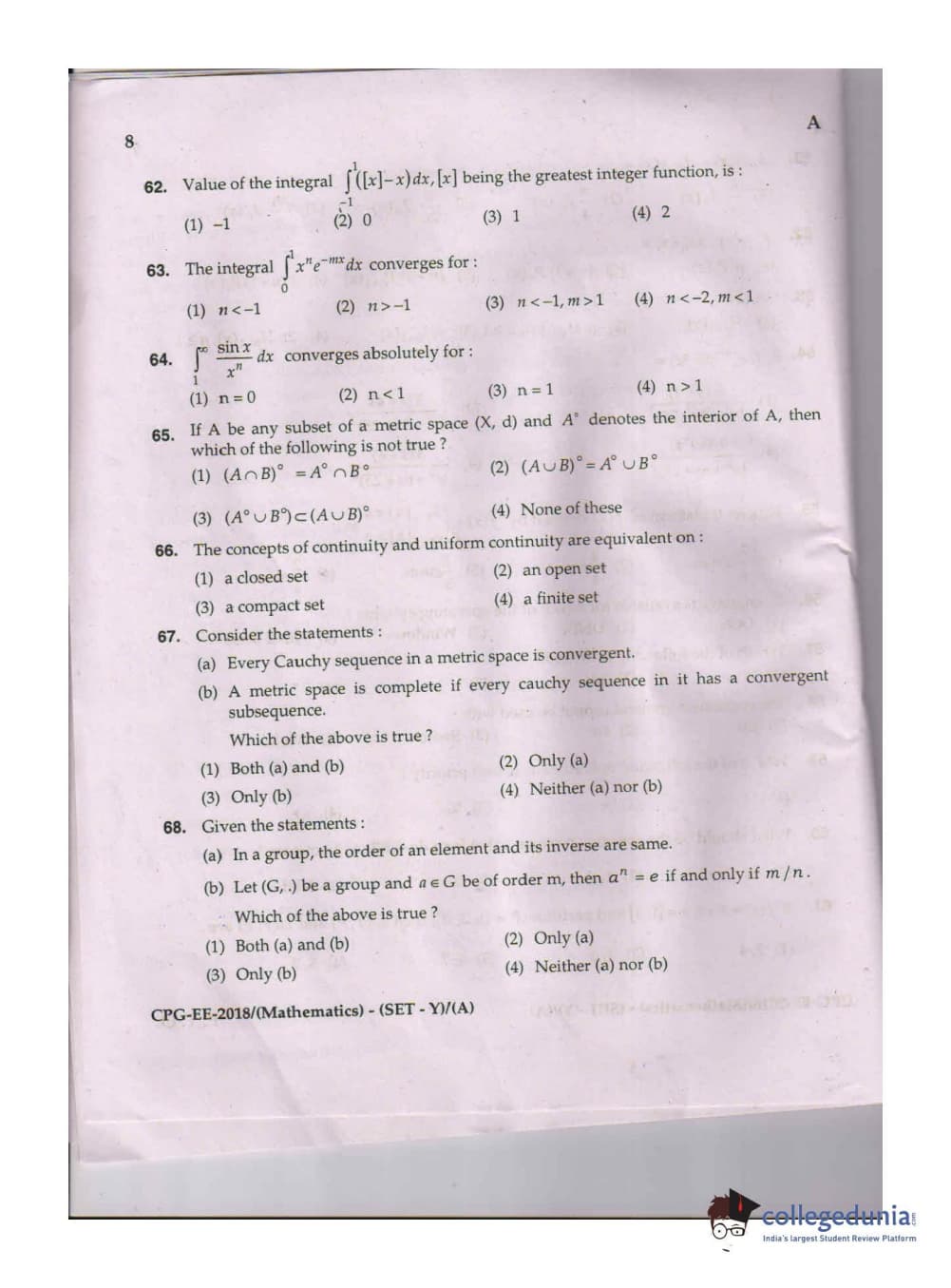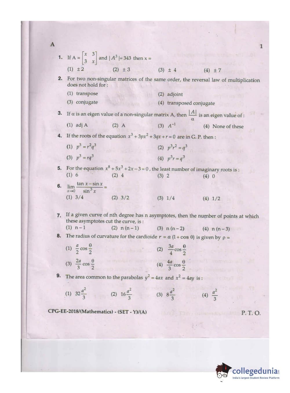 MDUCEE 2018 Mathematics Set A Question Paper with Answer Key PDFs