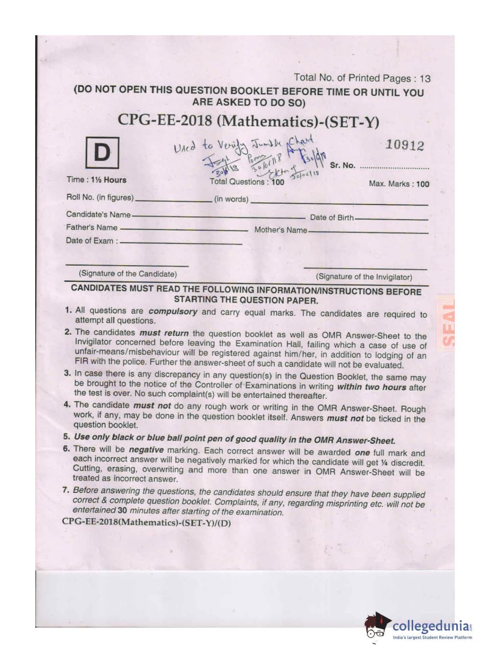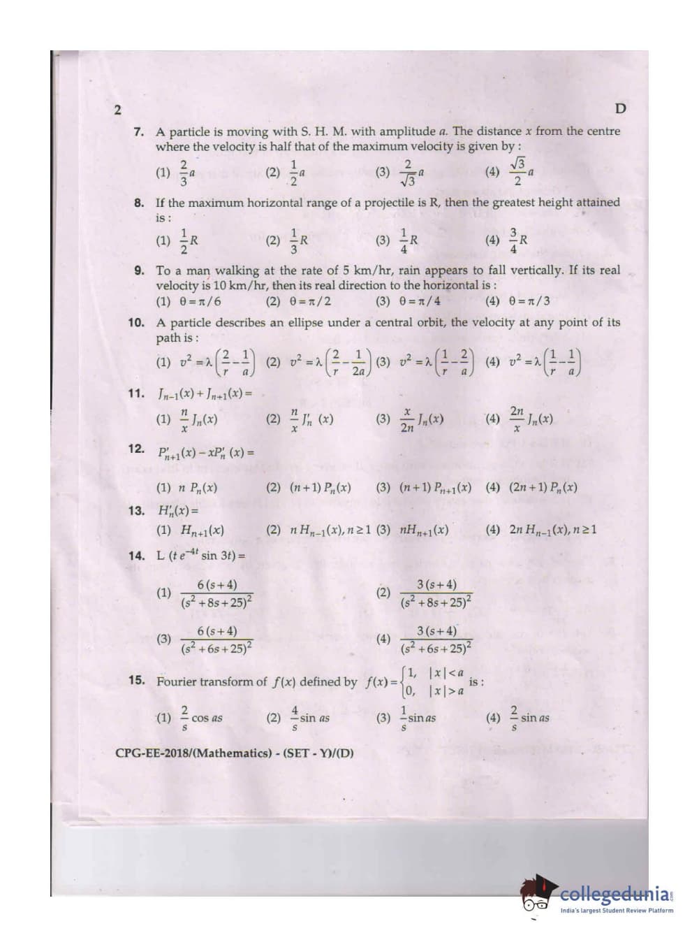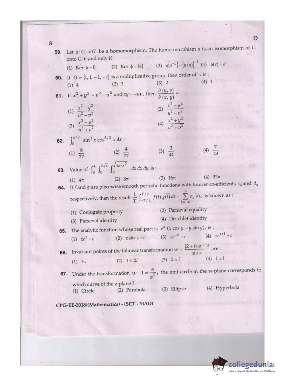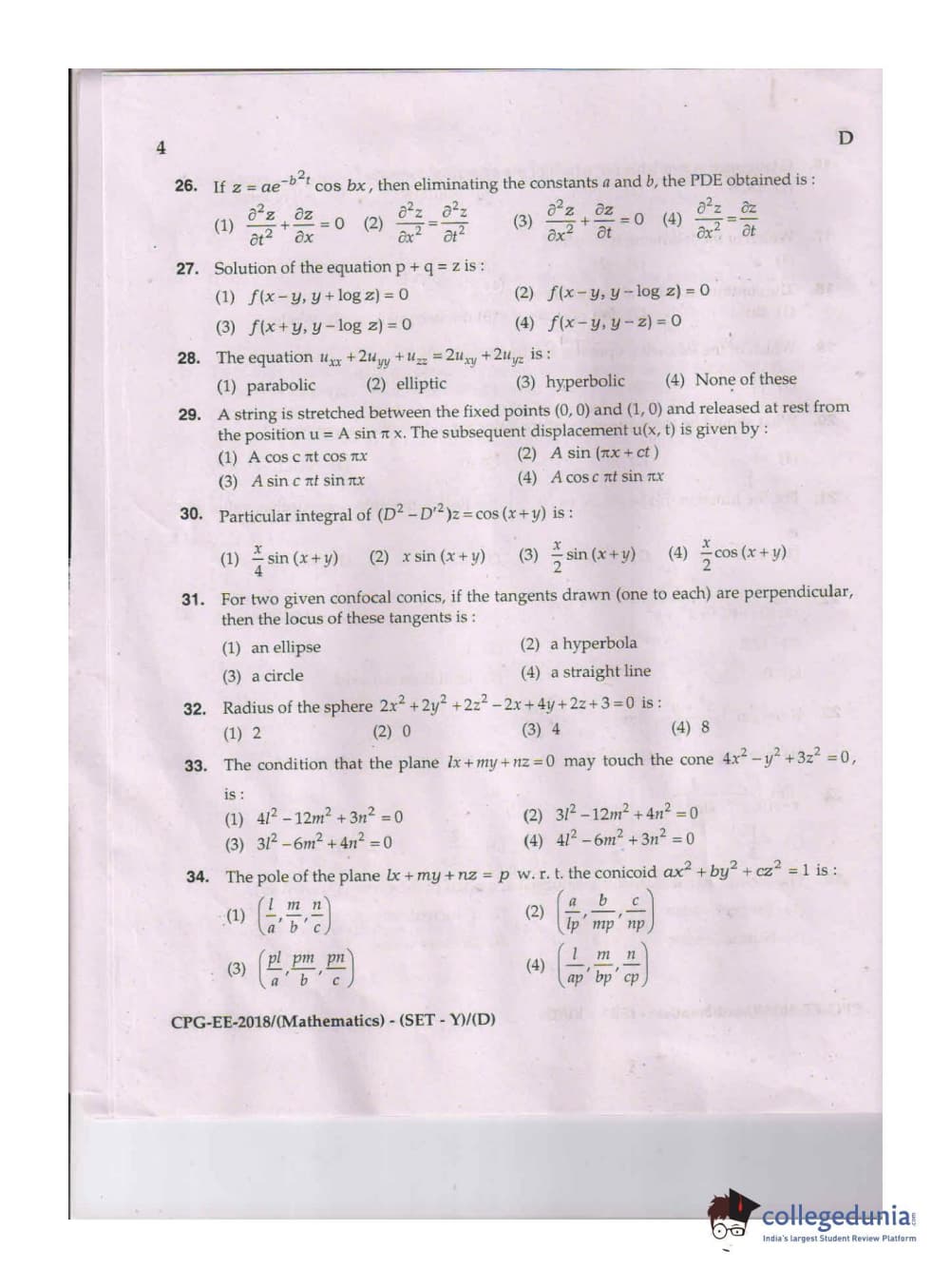MDUCEE 2018 Mathematics Set D Question Paper with Answer Key PDFs