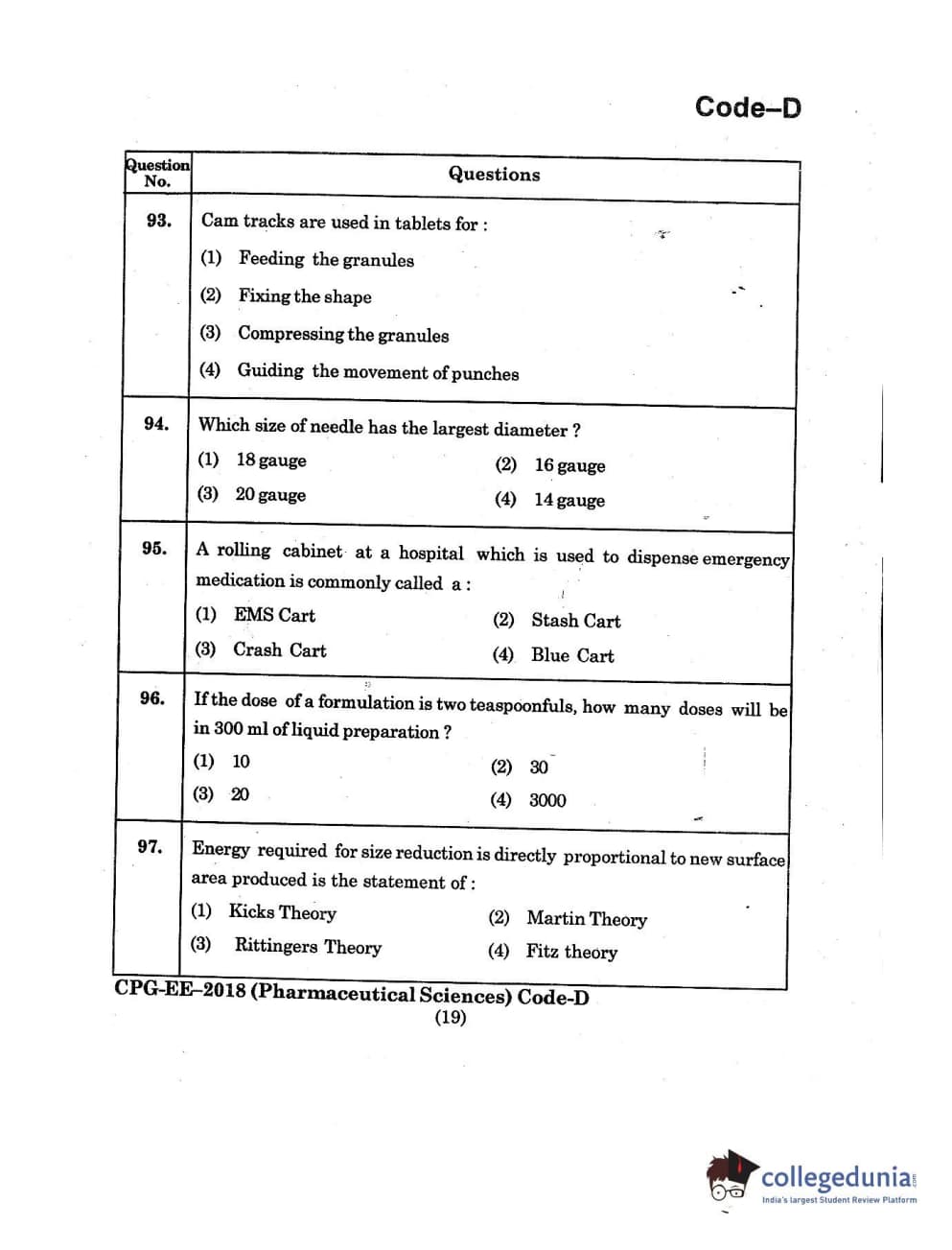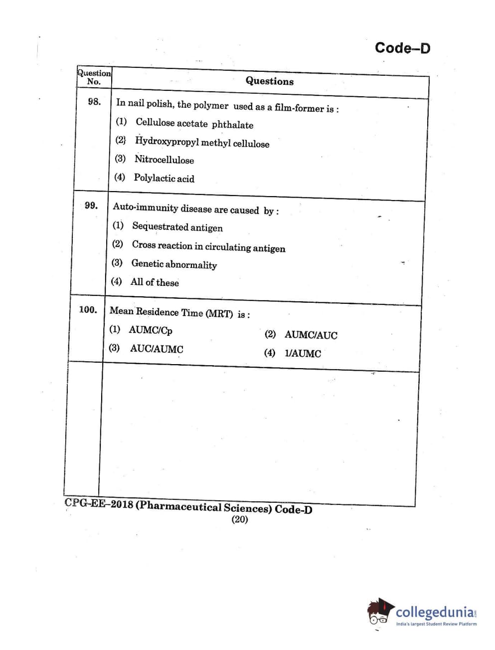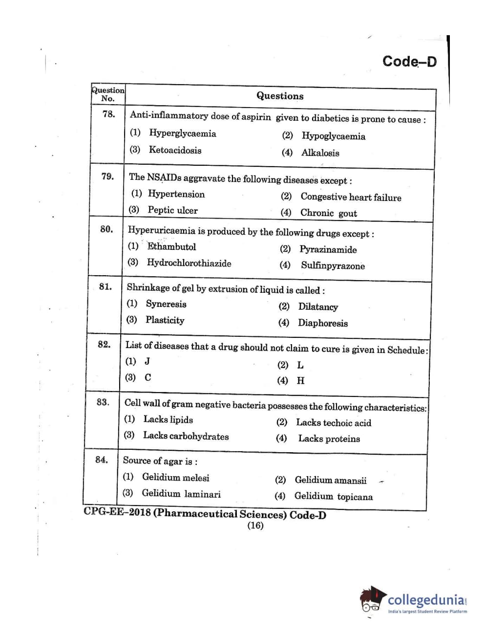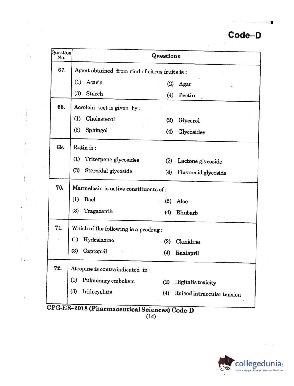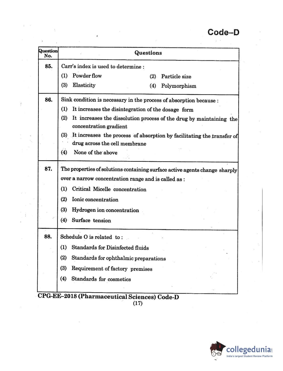 | MDUCEE 2018 Pharmaceutical Sciences Set D Question Paper PDF | MDUCEE 2018 Pharmaceutical Sciences Set D Answer Key PDF |