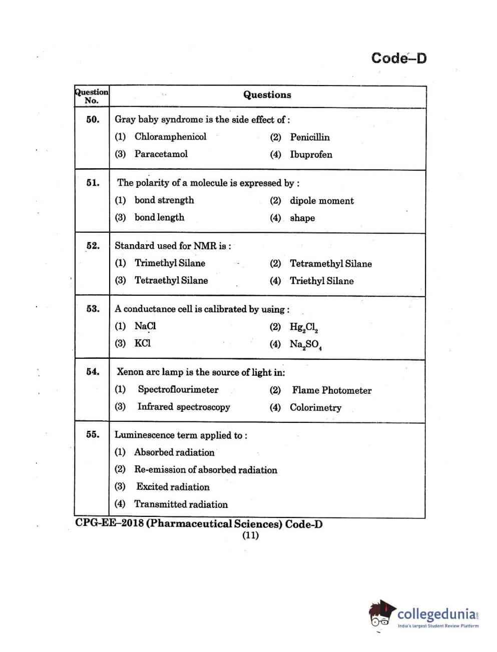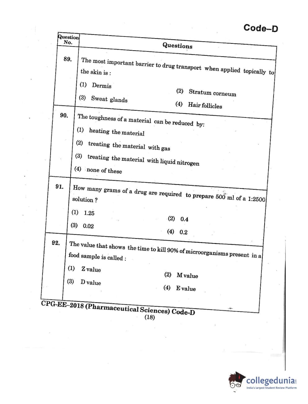 MDUCEE 2018 Pharmaceutical Sciences Set D Question Paper with Answer Key PDFs