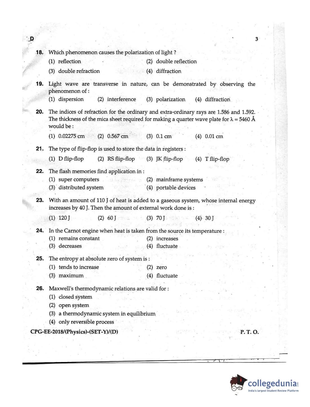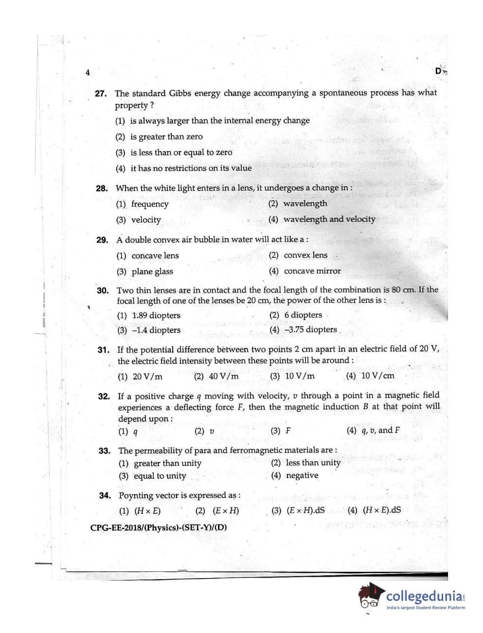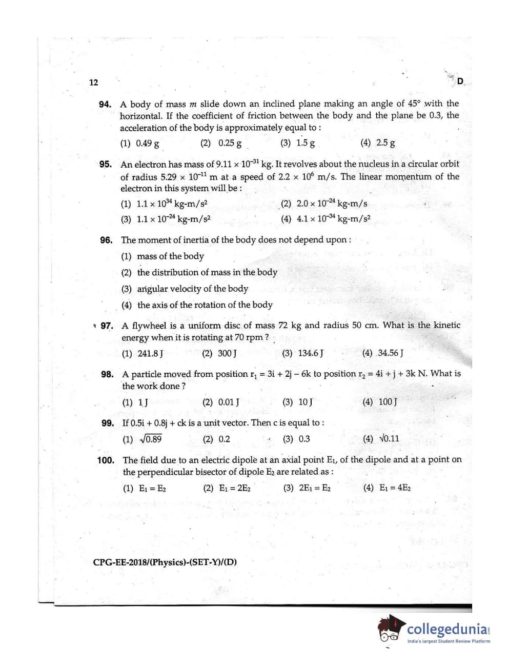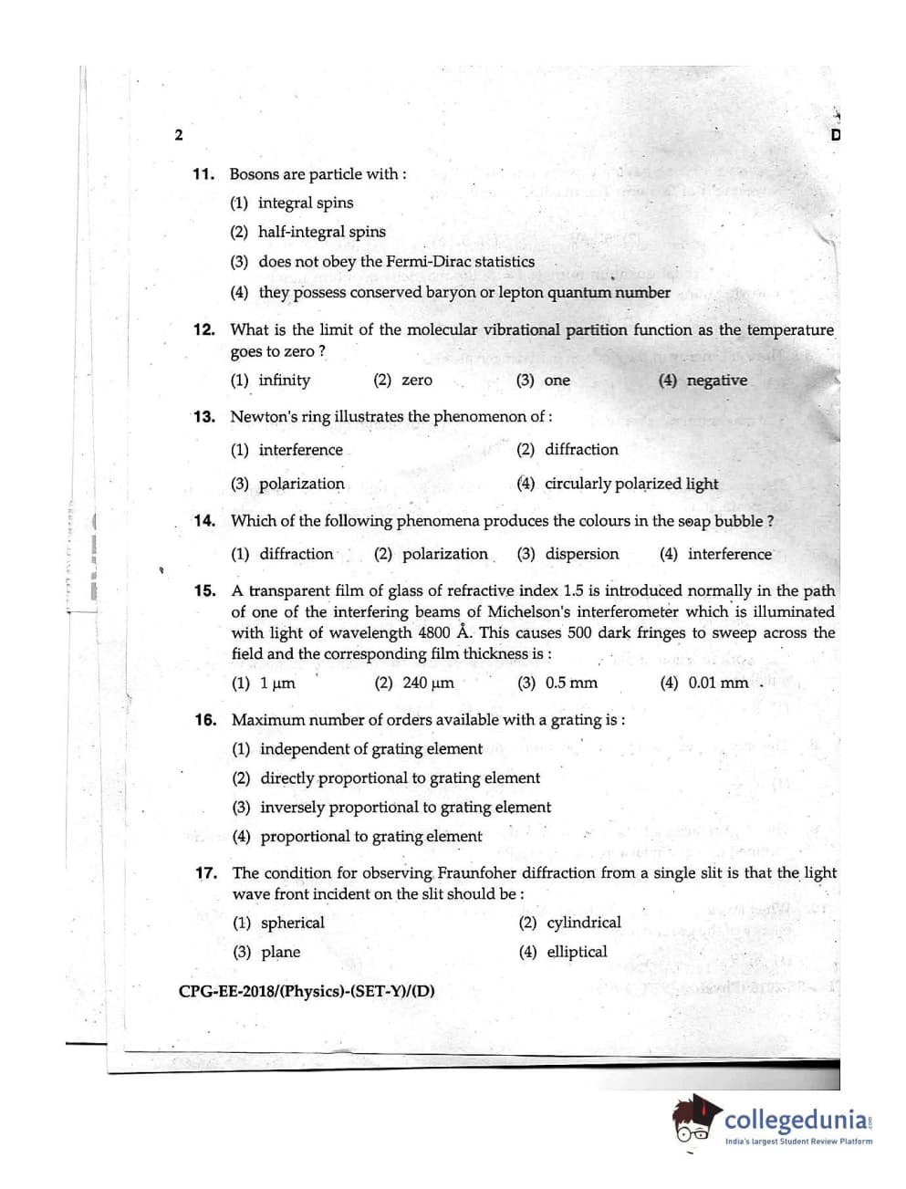 MDUCEE 2018 Physics Set D Question Paper with Answer Key PDFs