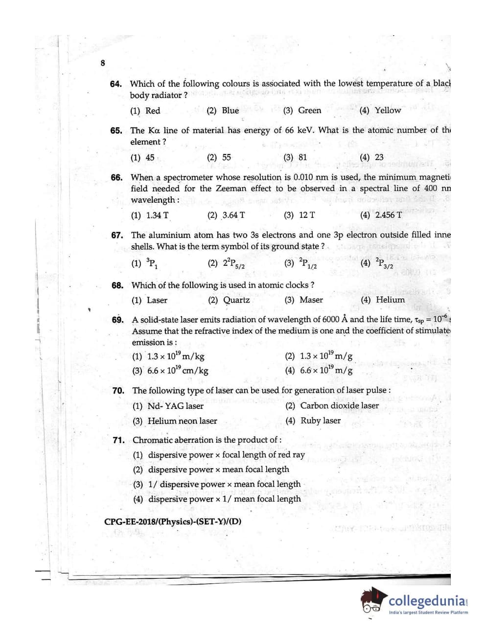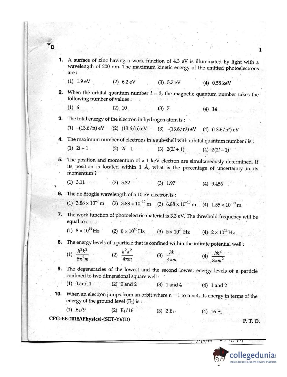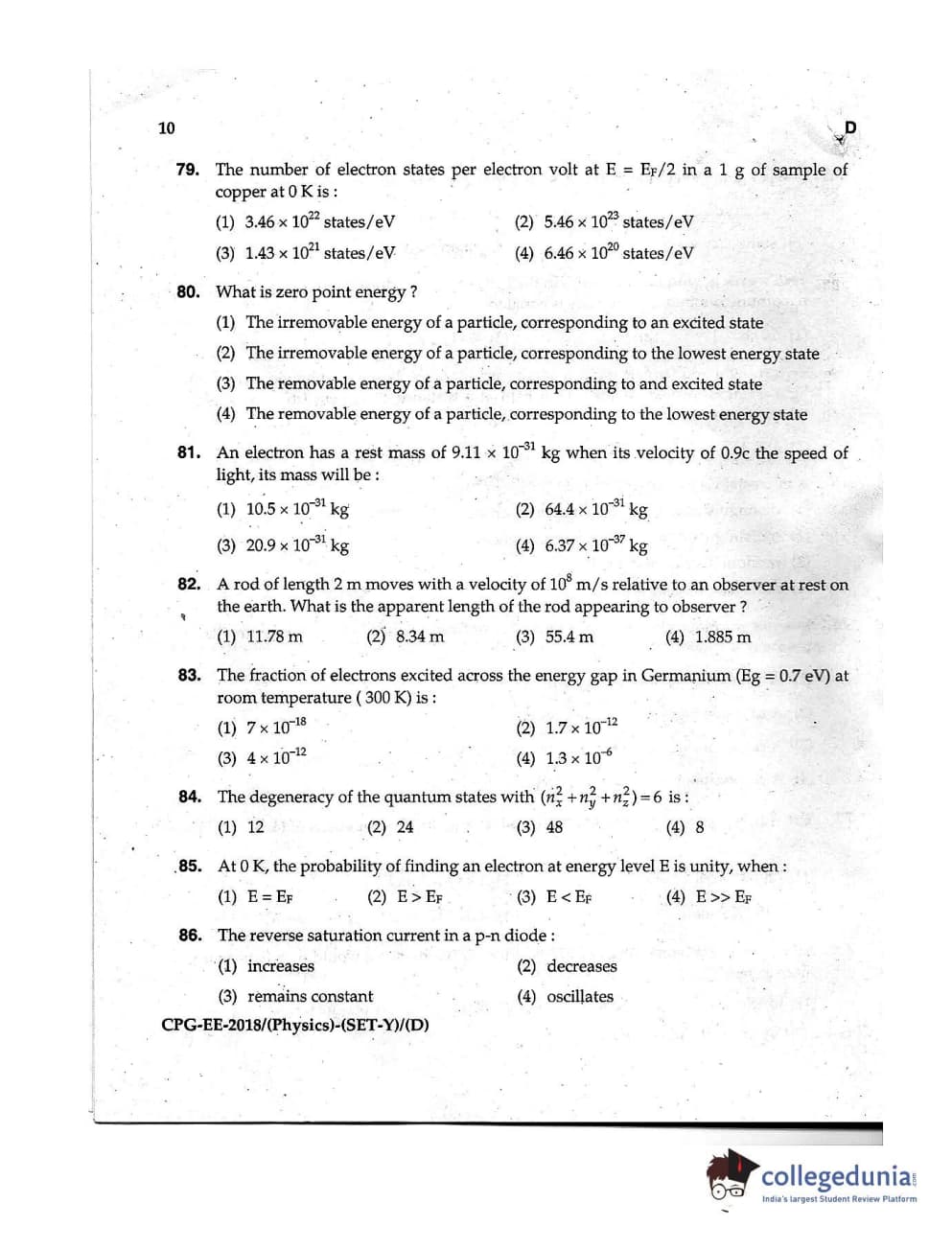 MDUCEE 2018 Physics Set D Question Paper with Answer Key PDFs