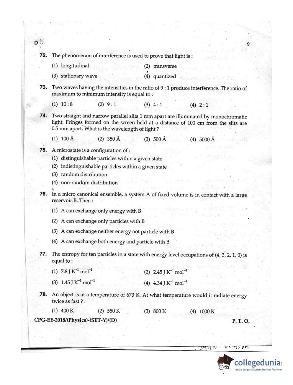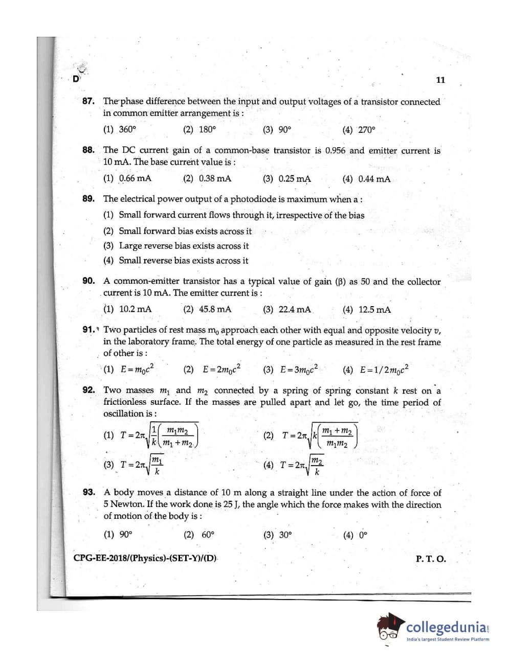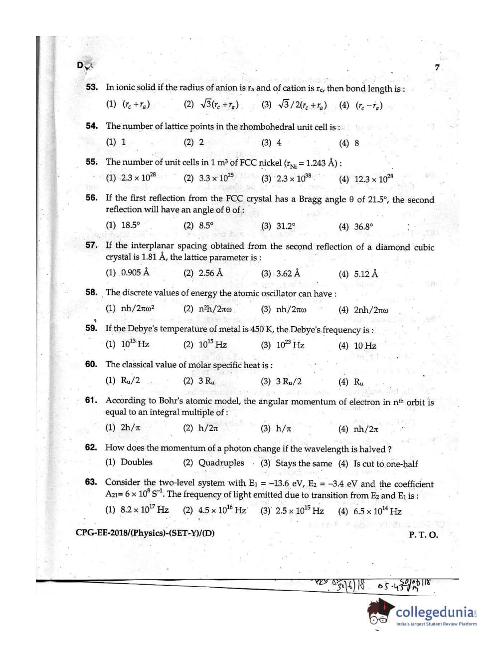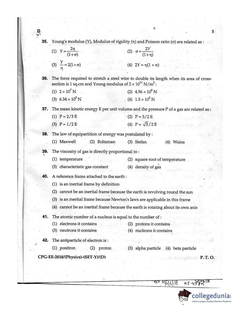 MDUCEE 2018 Physics Set D Question Paper with Answer Key PDFs