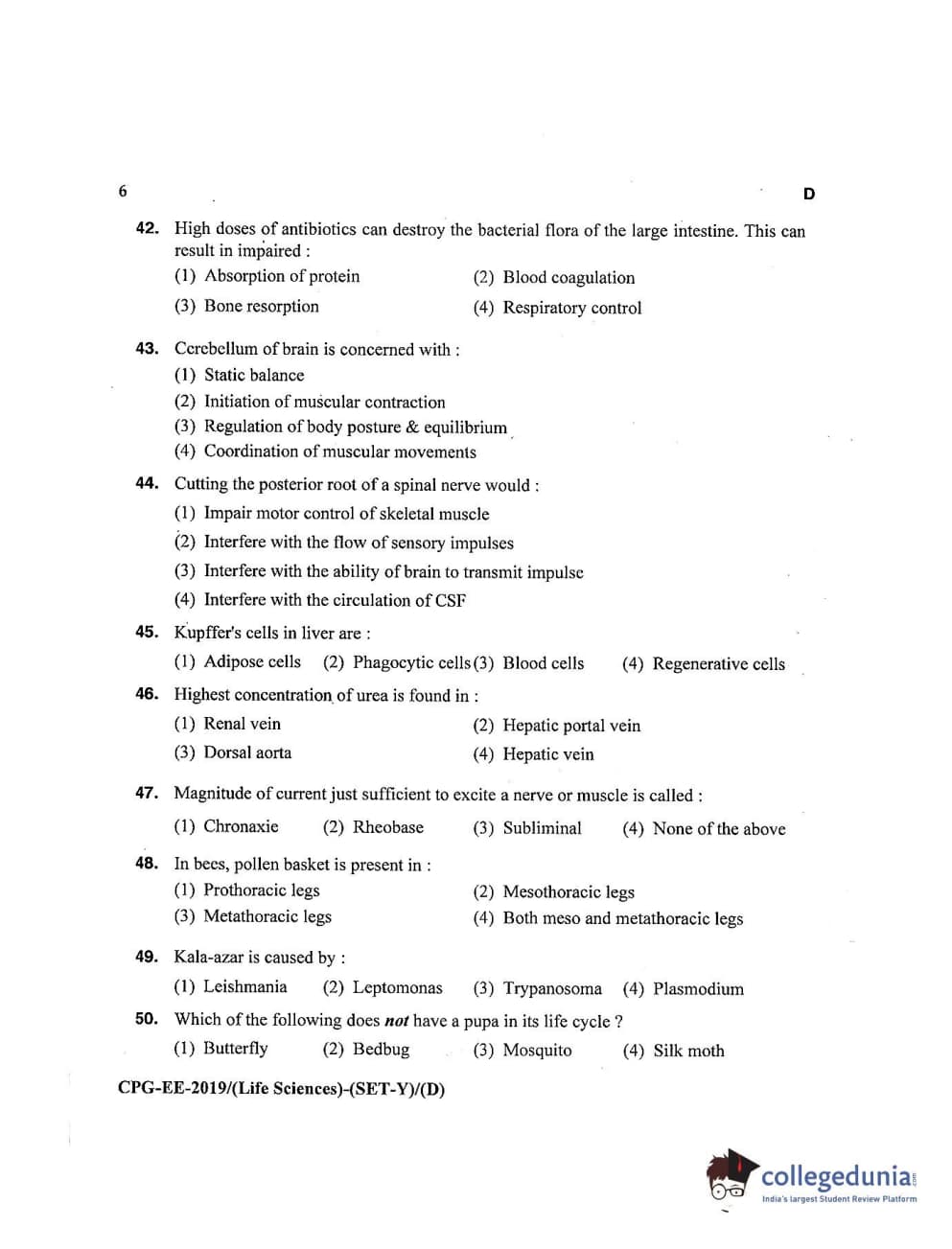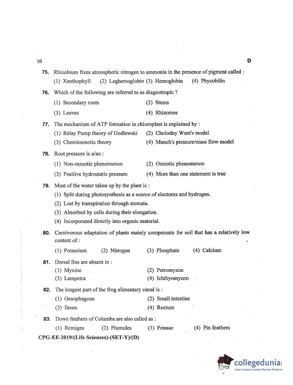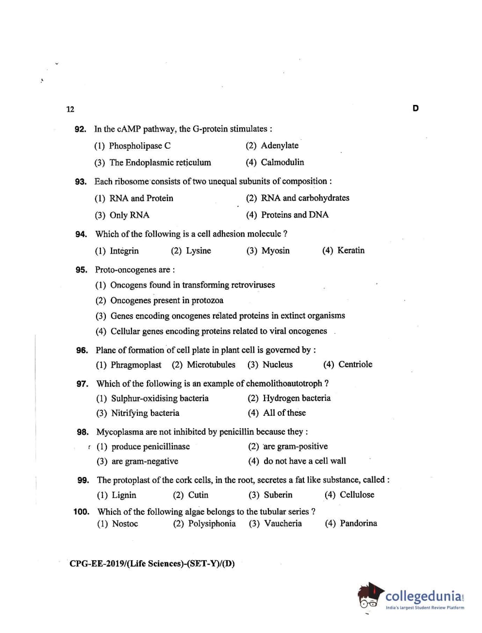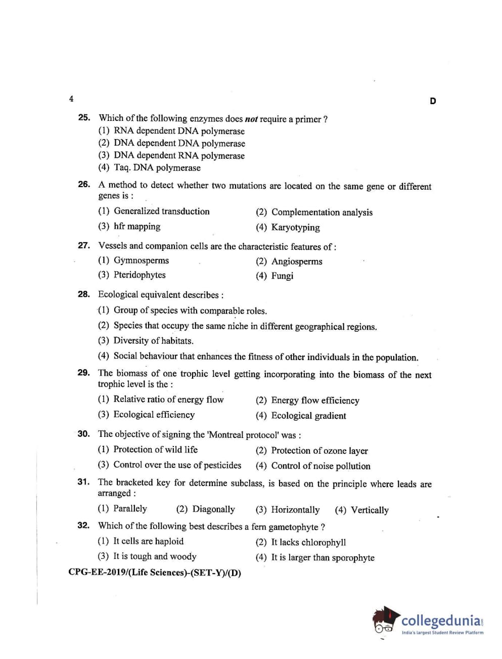MDUCEE 2019 Life Science Set D Question Paper with Answer Key PDFs