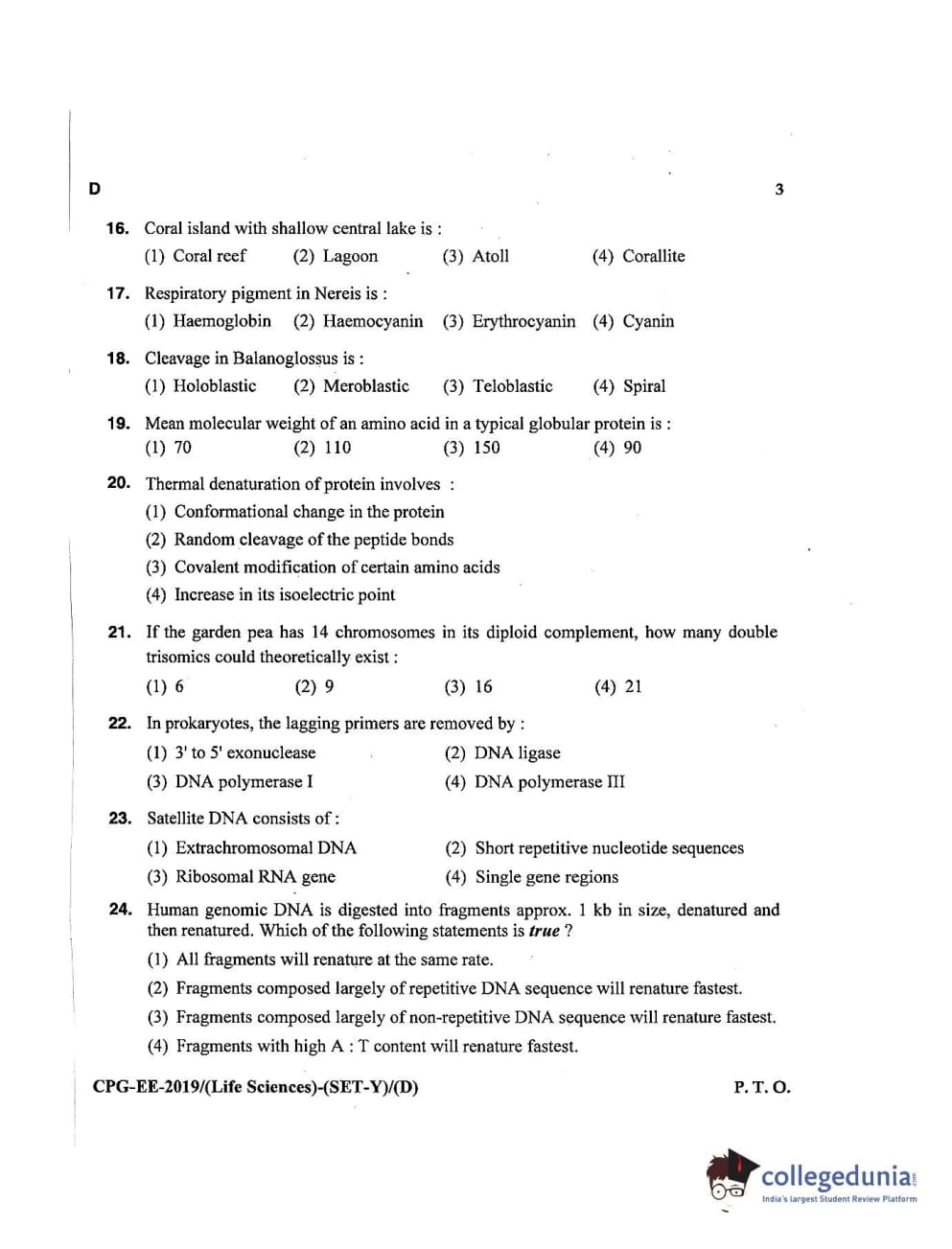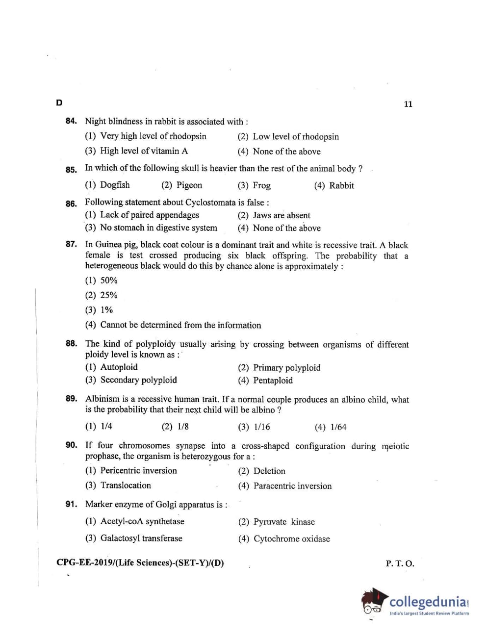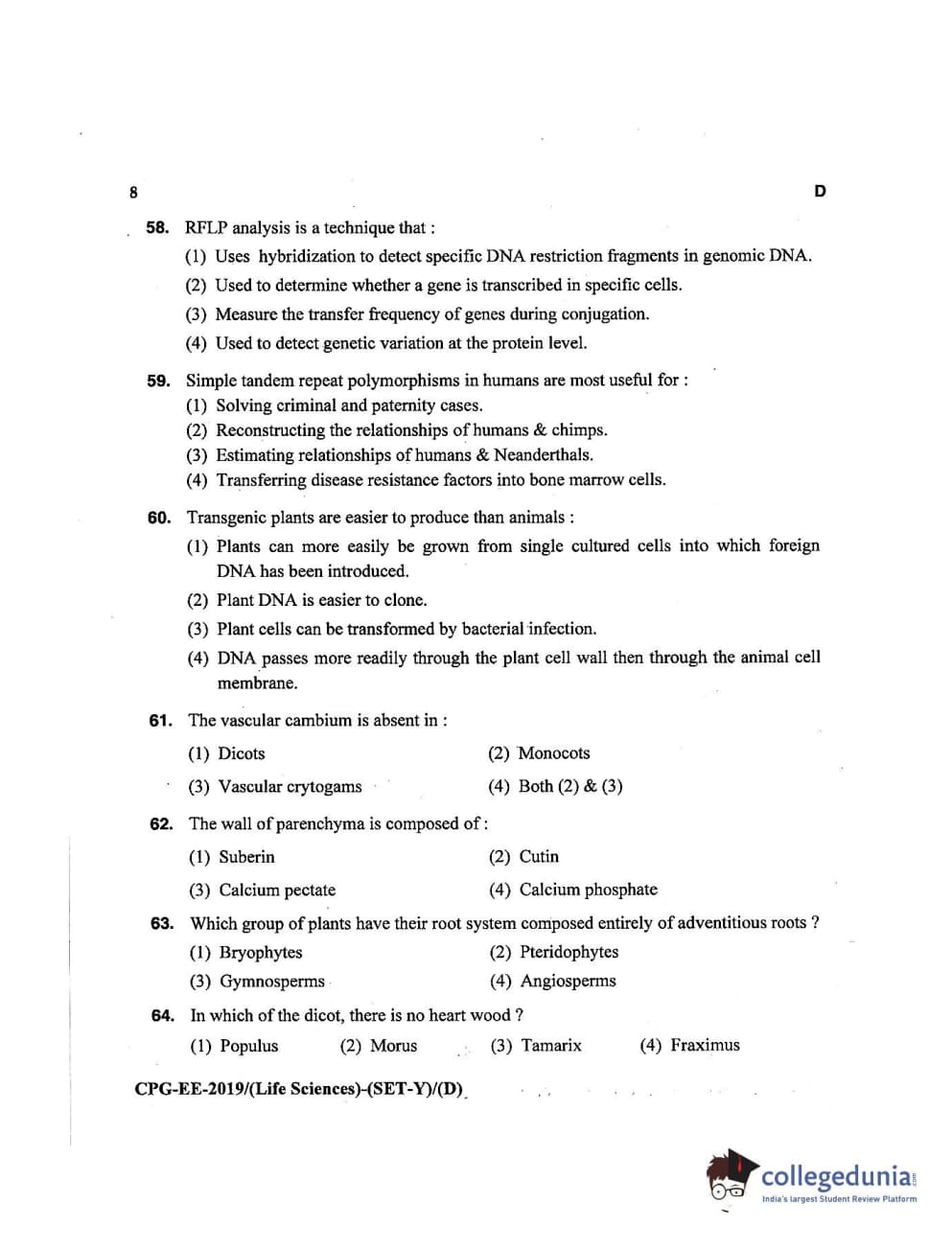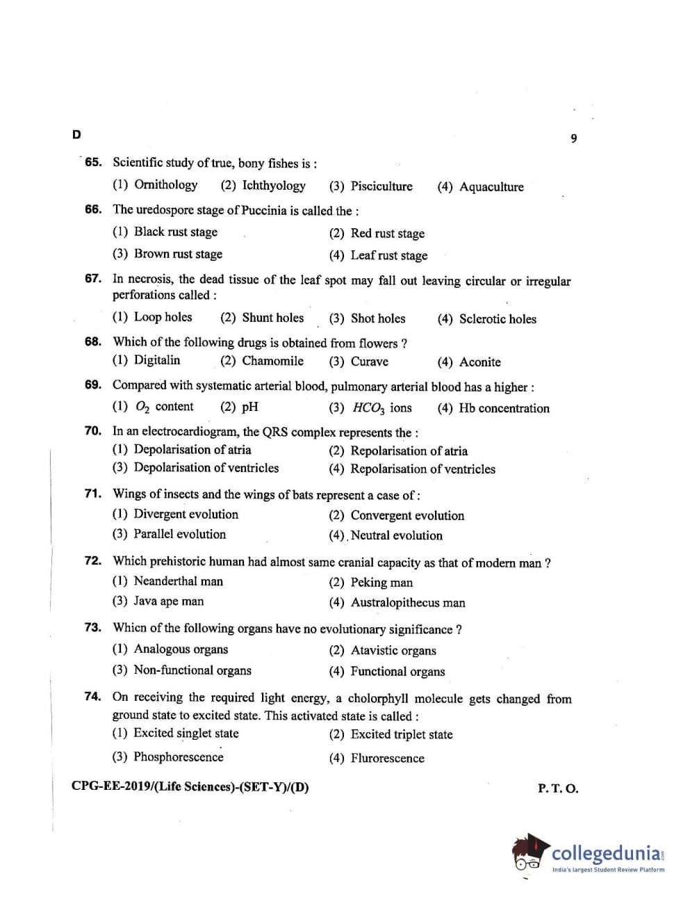MDUCEE 2019 Life Science Set D Question Paper with Answer Key PDFs