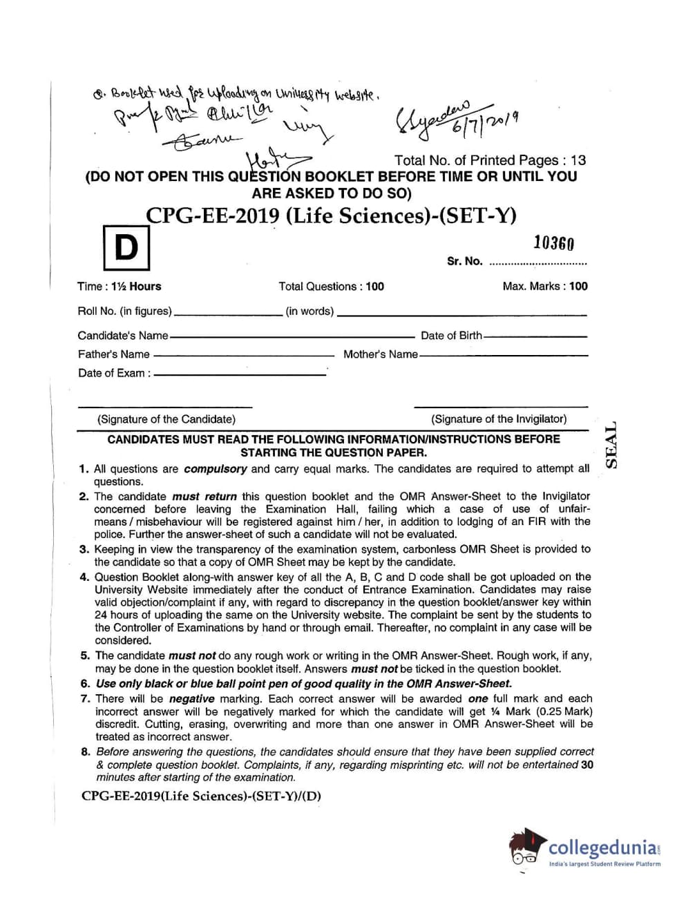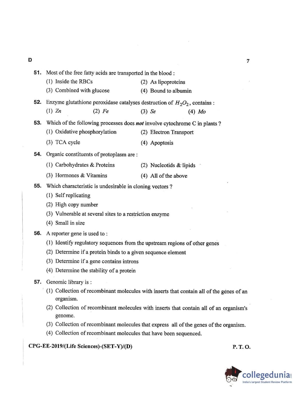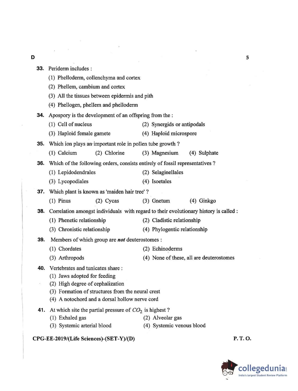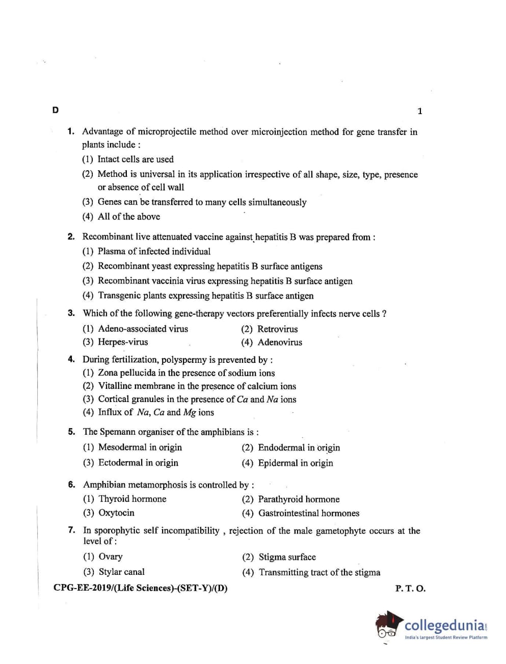 MDUCEE 2019 Life Science Set D Question Paper with Answer Key PDFs