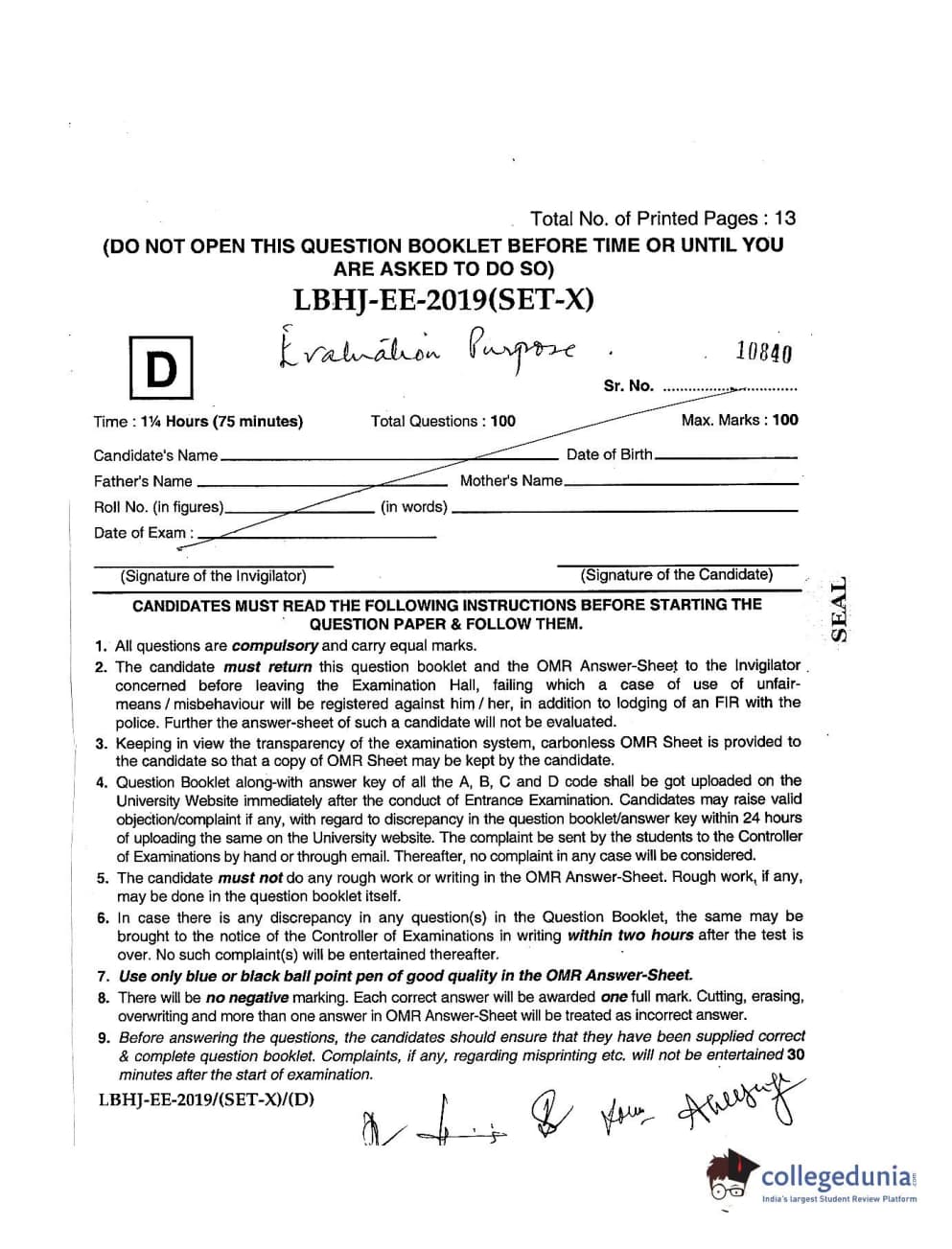 MDUCEE 2019 LL.B. (Hons.) 3 Years Set D Question paper with answer key pdf is available for download. The exam was successfully organized by Maharishi Dayanand University. The question paper comprised a total of 100 questions.