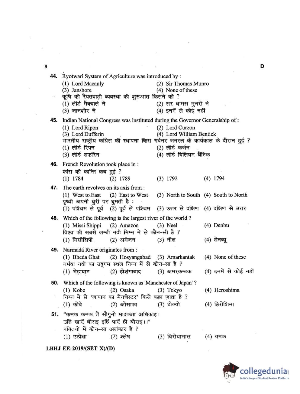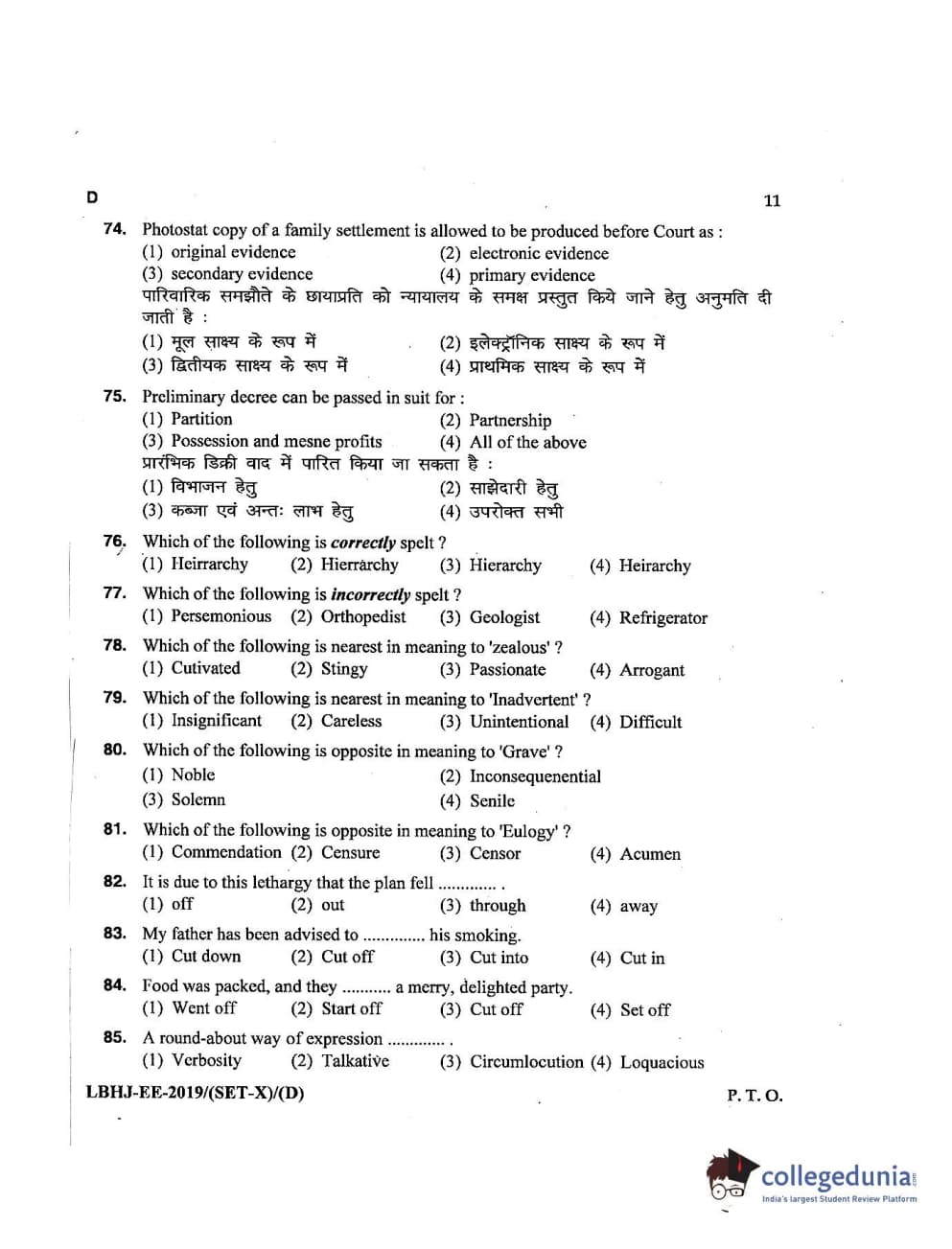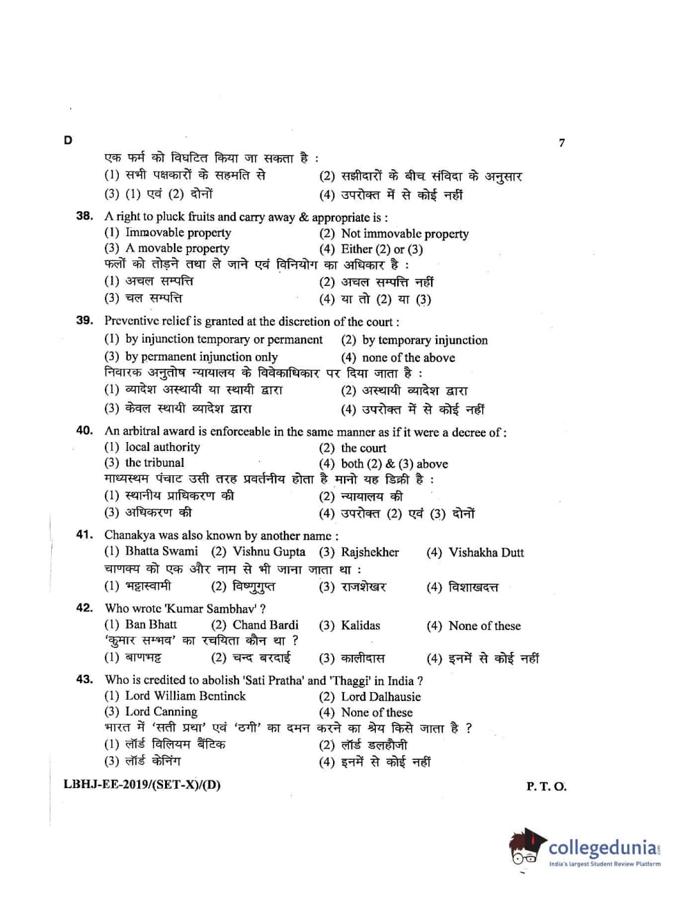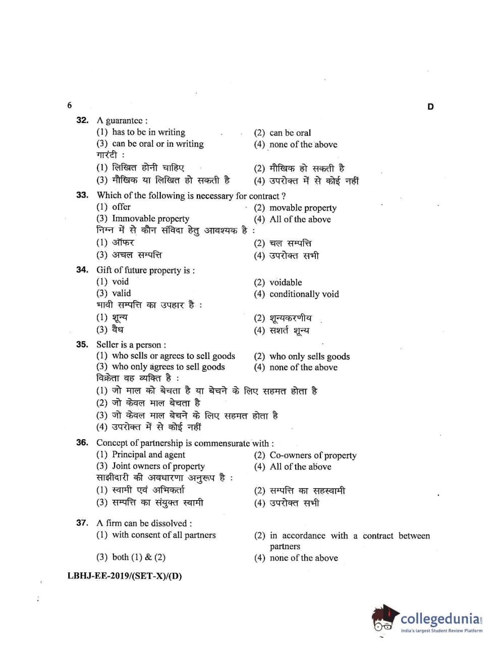 MDUCEE 2019 LL.B. (Hons.) 3 Years Set D Question Paper with Answer Key PDFs