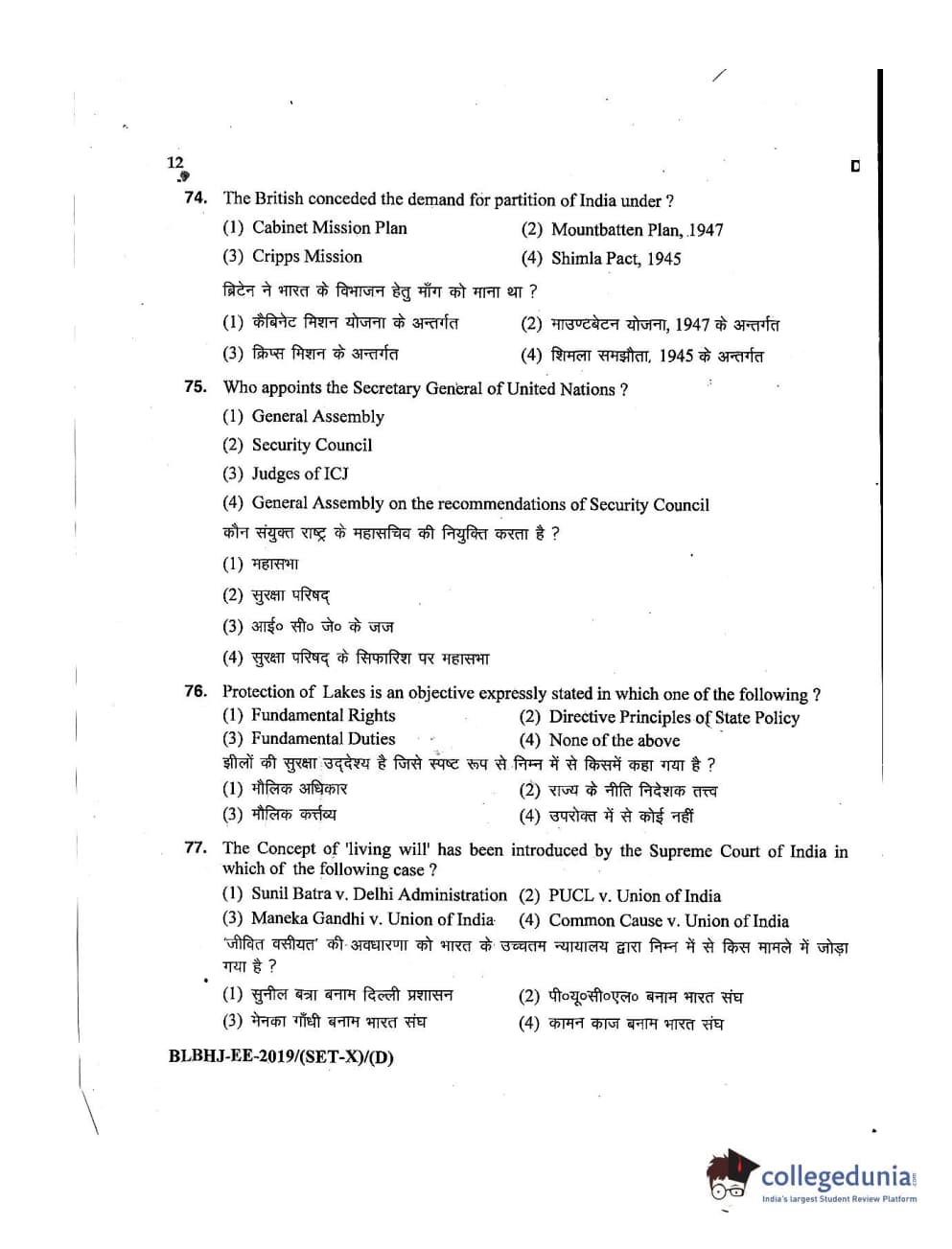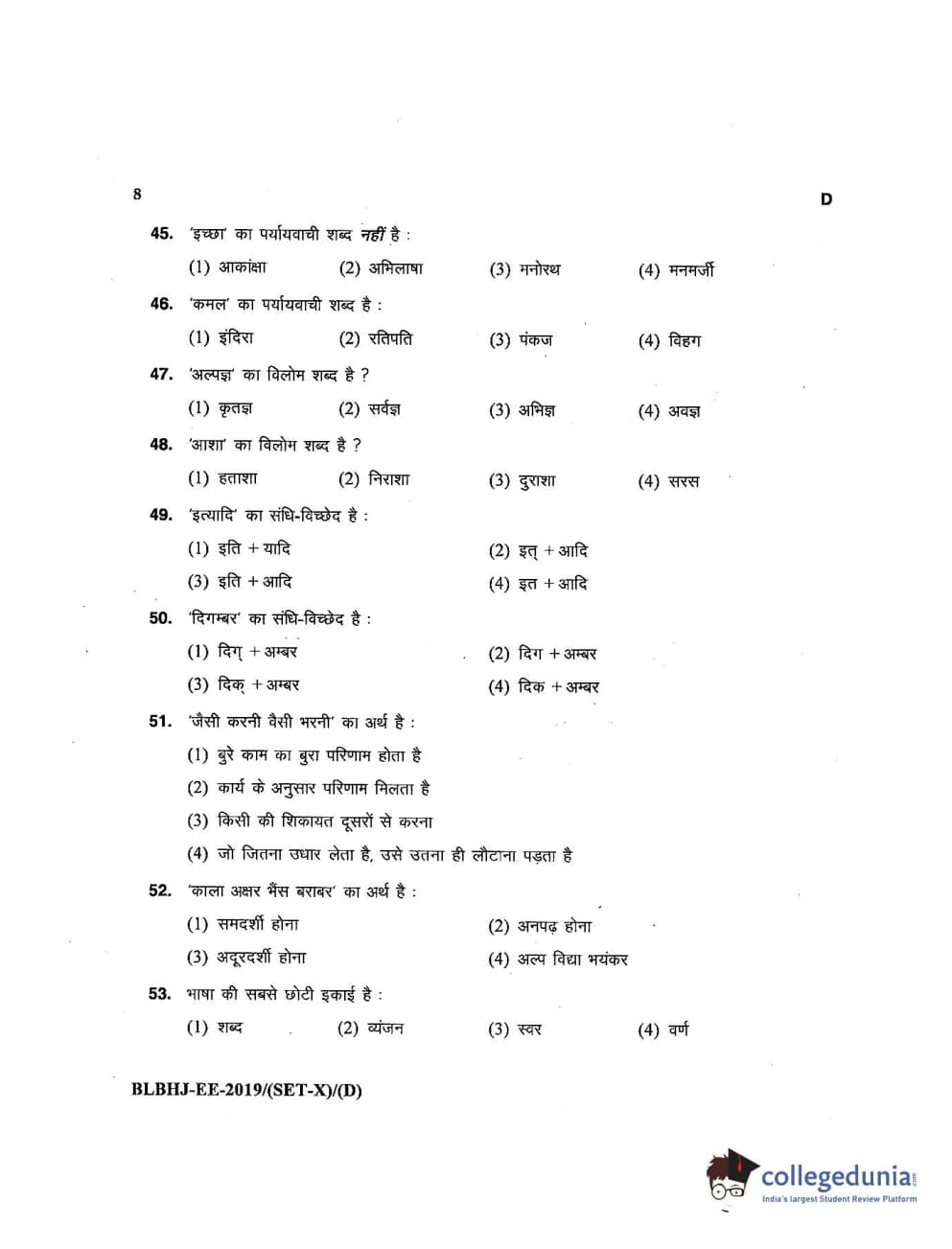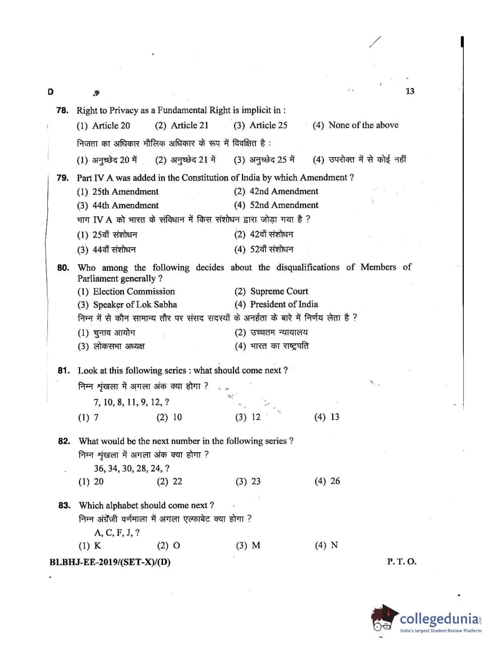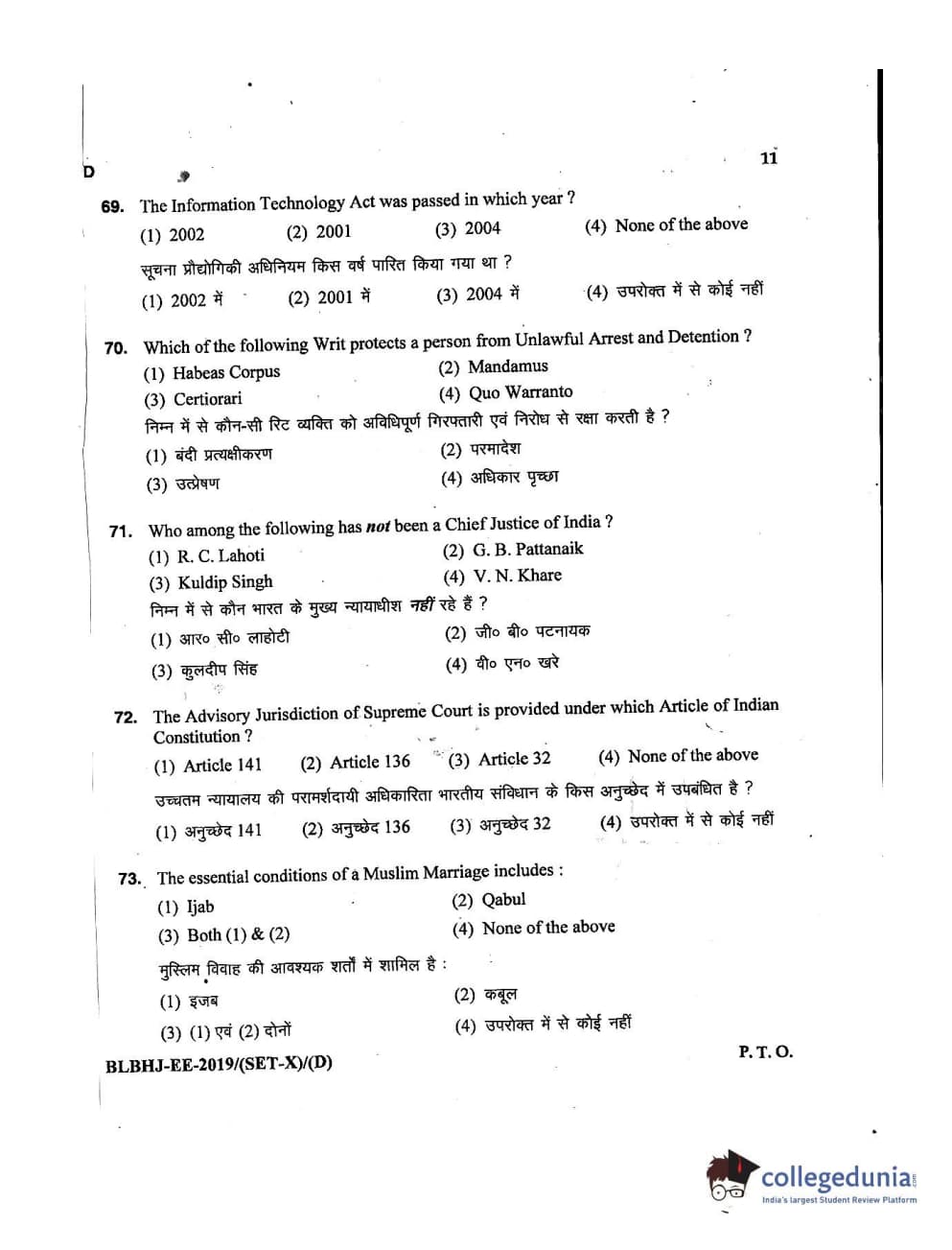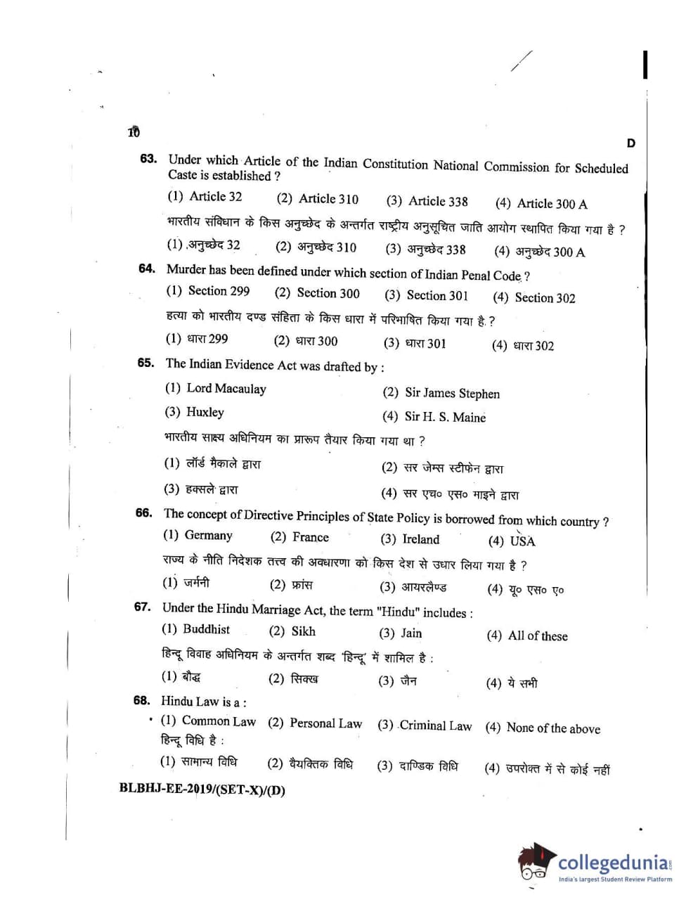 MDUCEE 2019 LL.B. (Hons.) 5 Years Integrated Set D Question Paper with Answer Key PDFs
