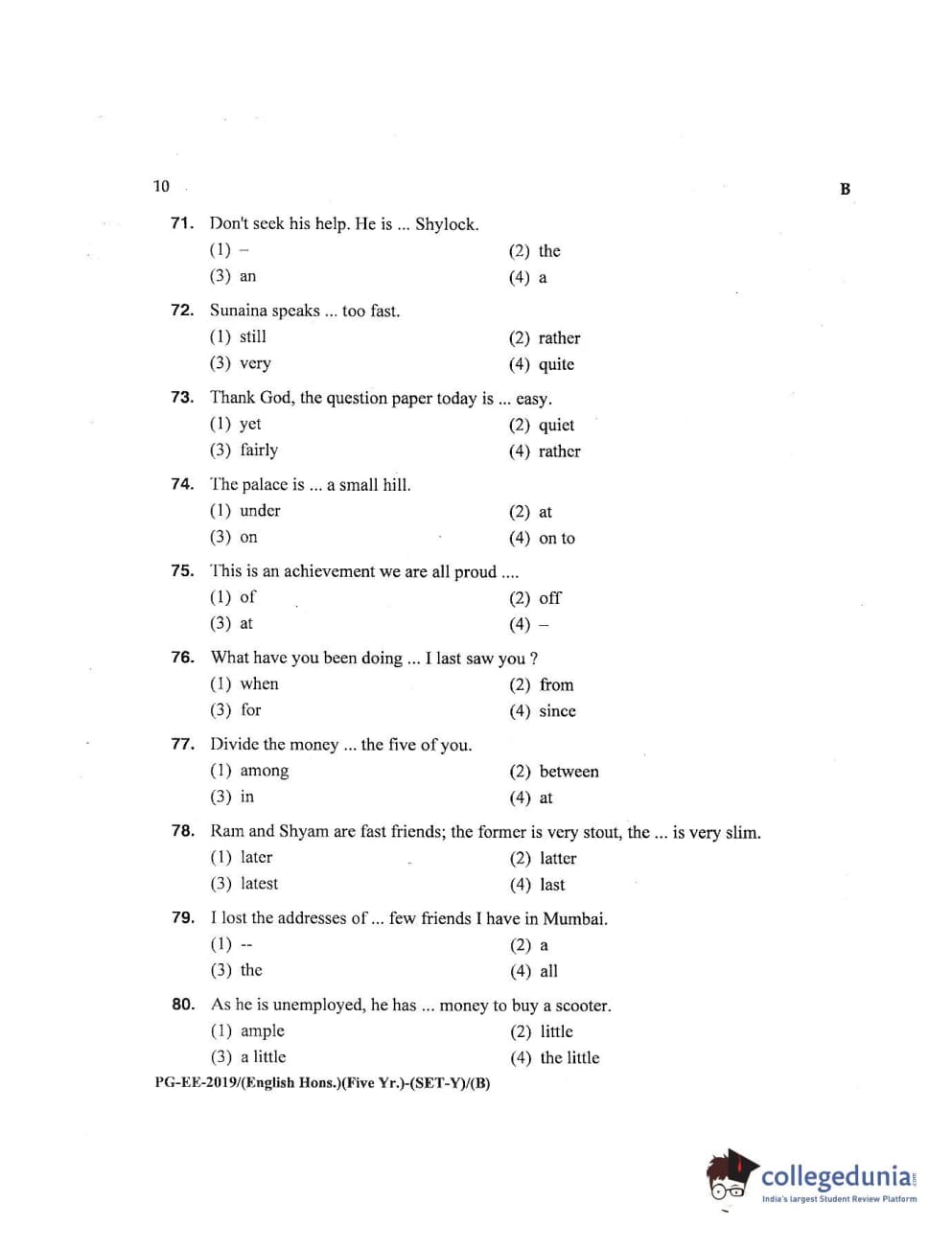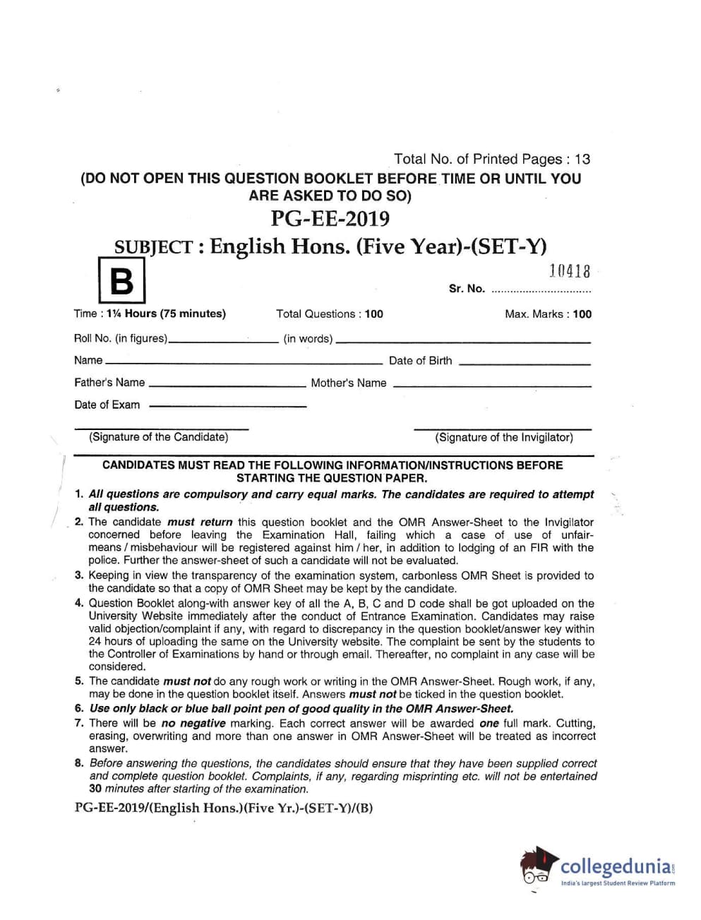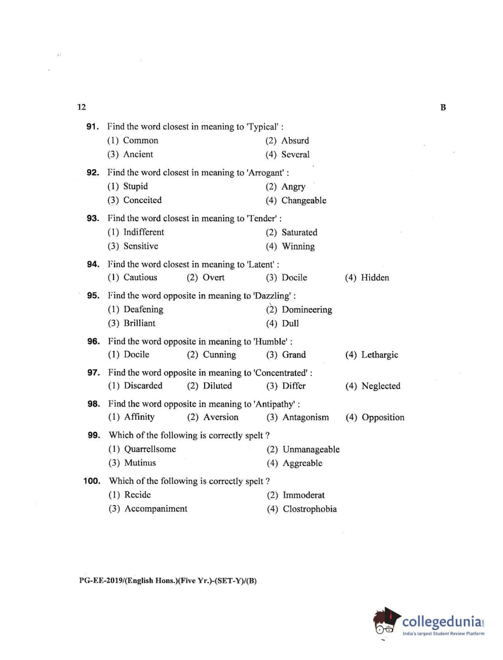 MDUCEE 2019 M.A English Hons 5 Year Integrated (Reconducted) Set B Question paper with answer key pdf is available for download. The exam was successfully organized by Maharishi Dayanand University. The question paper comprised a total of 100 questions.