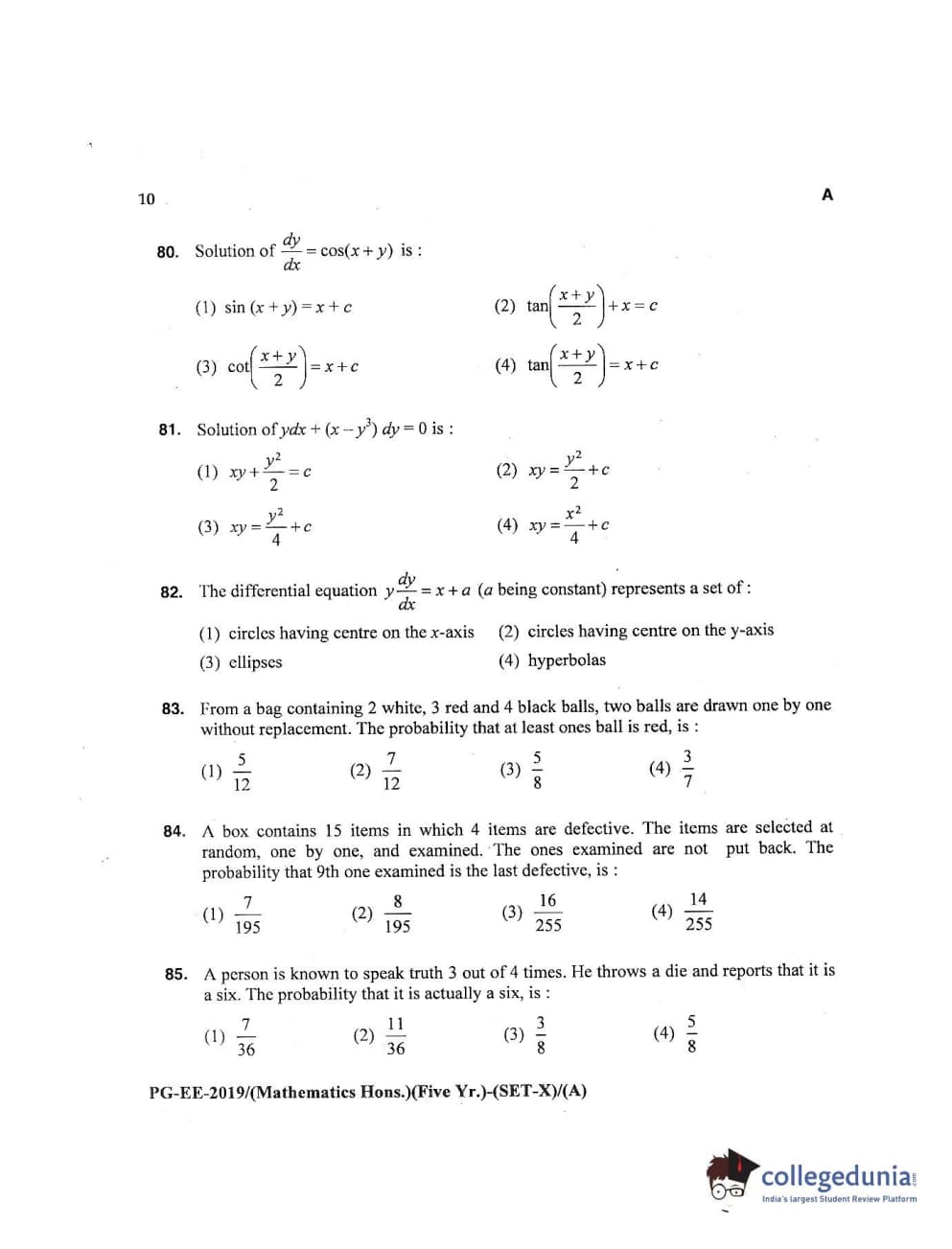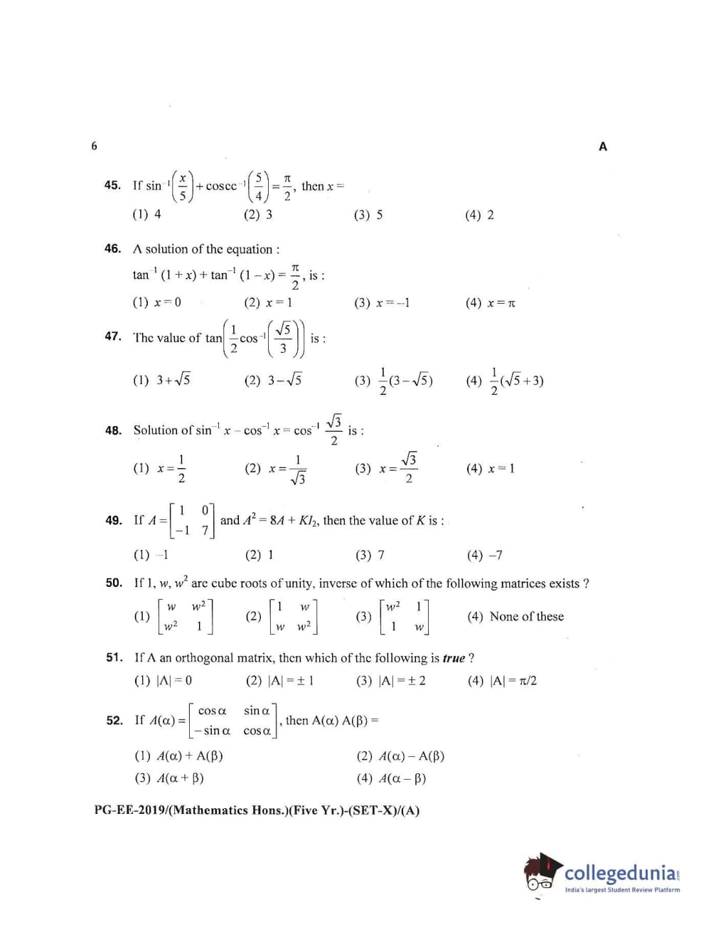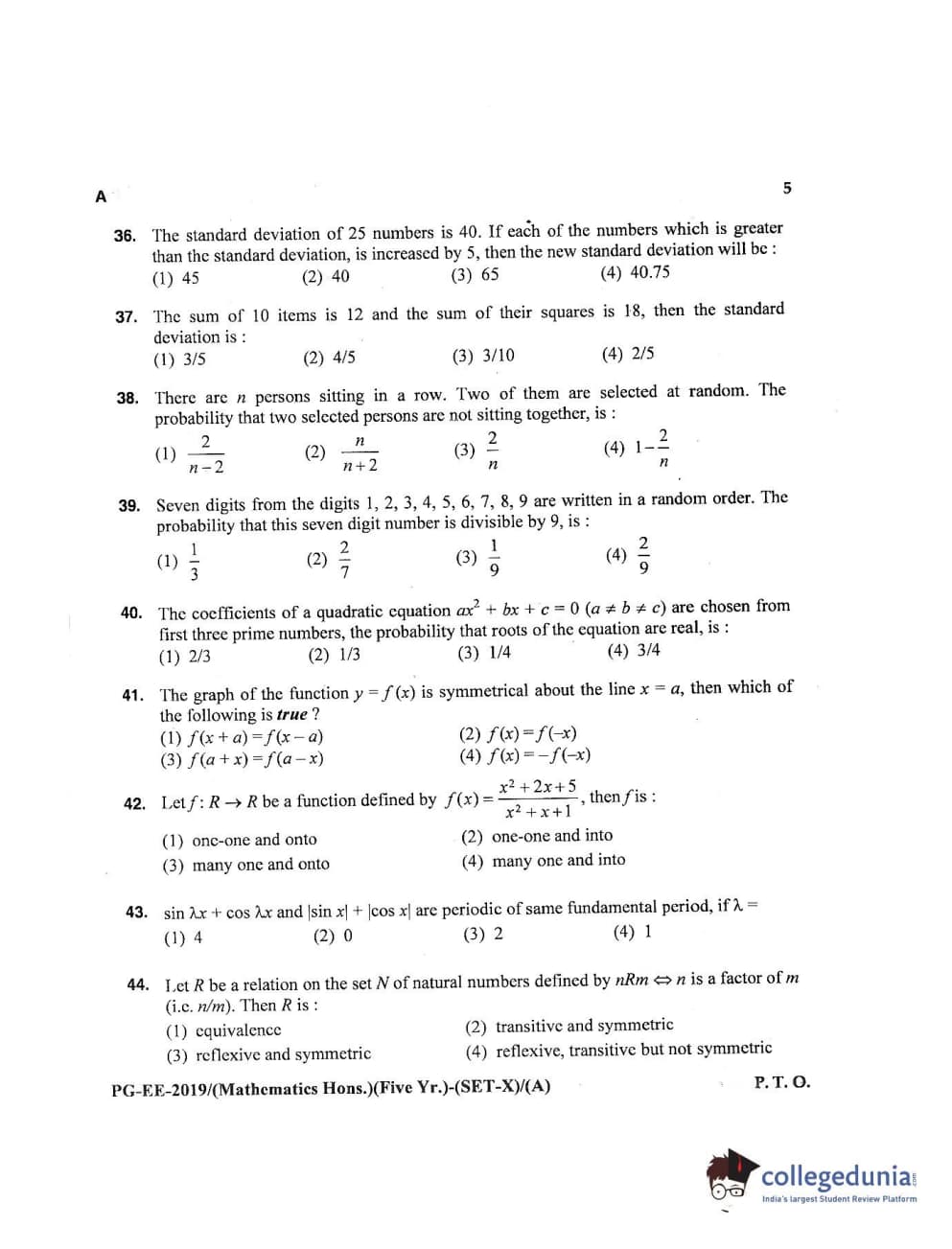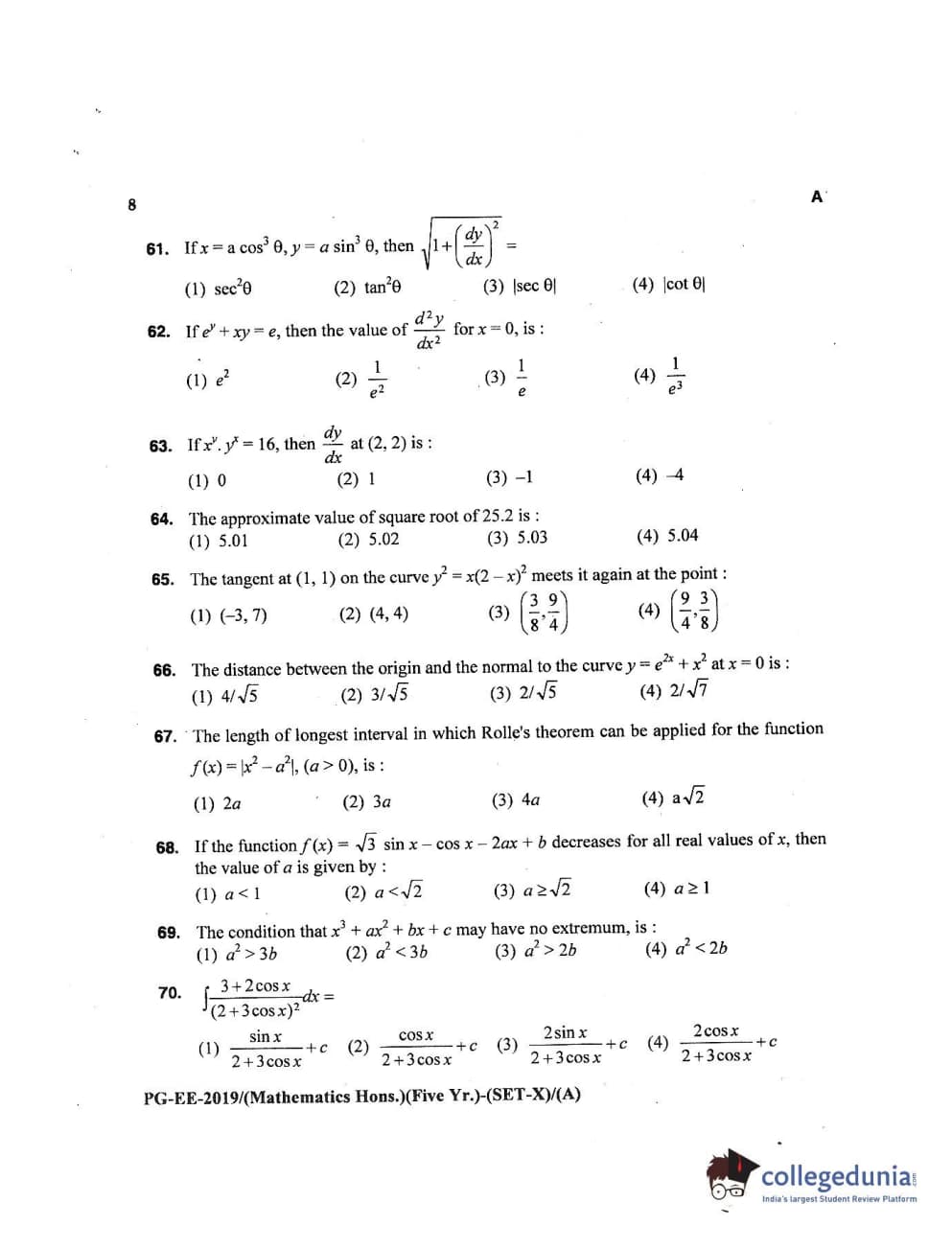 MDUCEE 2019 Mathematics Hons. (Five Year) Set A Question Paper with Answer Key PDFs