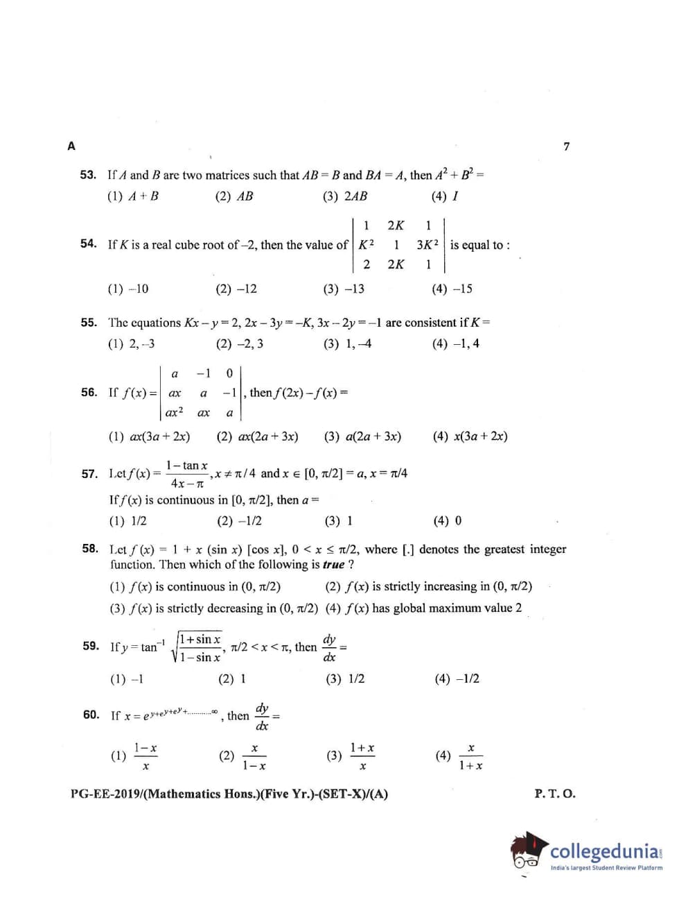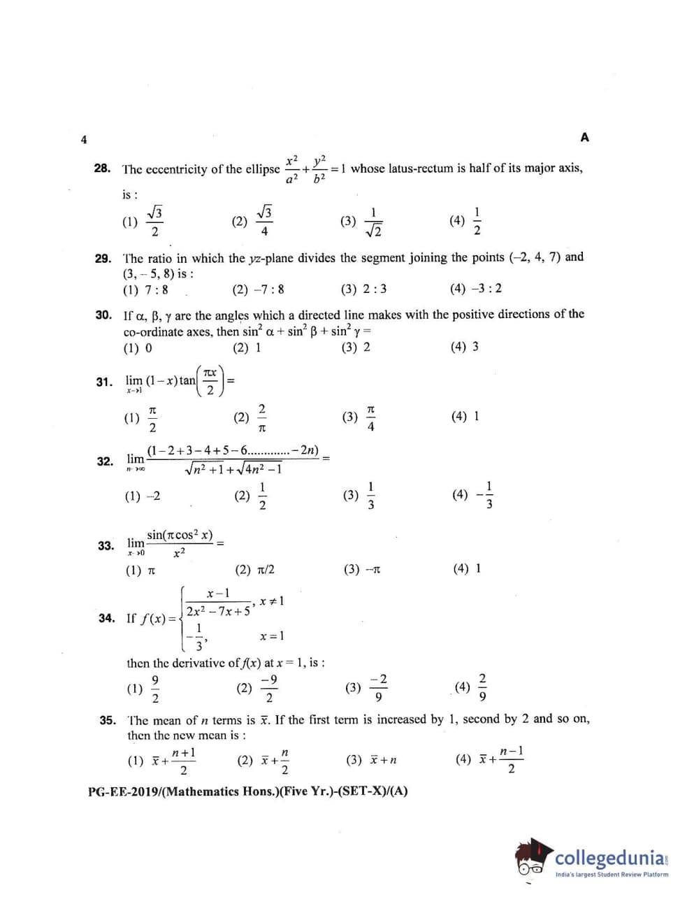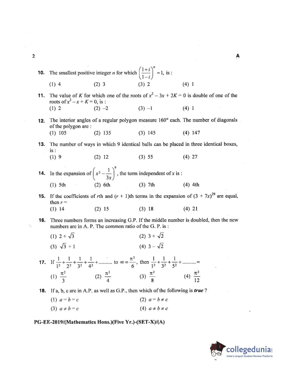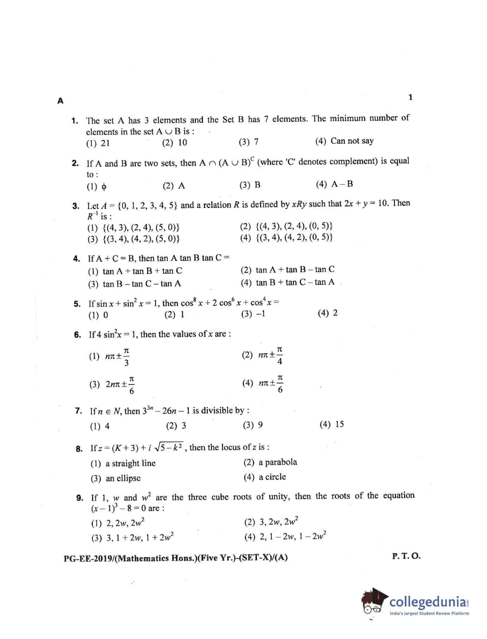 MDUCEE 2019 Mathematics Hons. (Five Year) Set A Question Paper with Answer Key PDFs