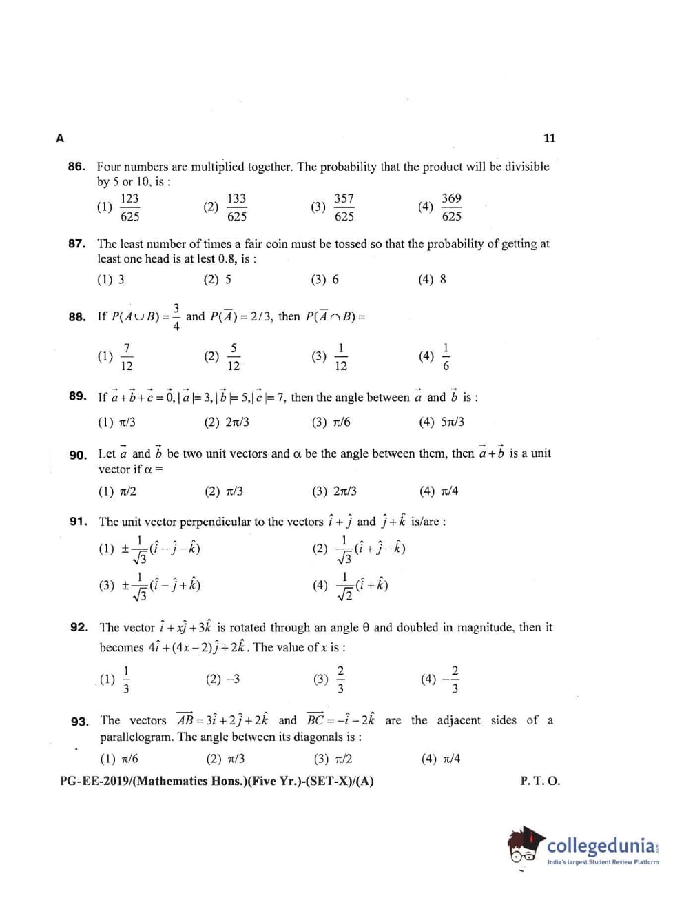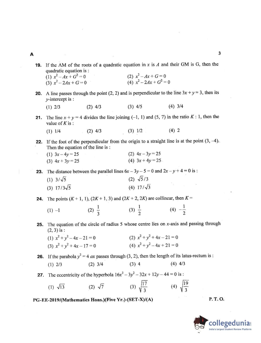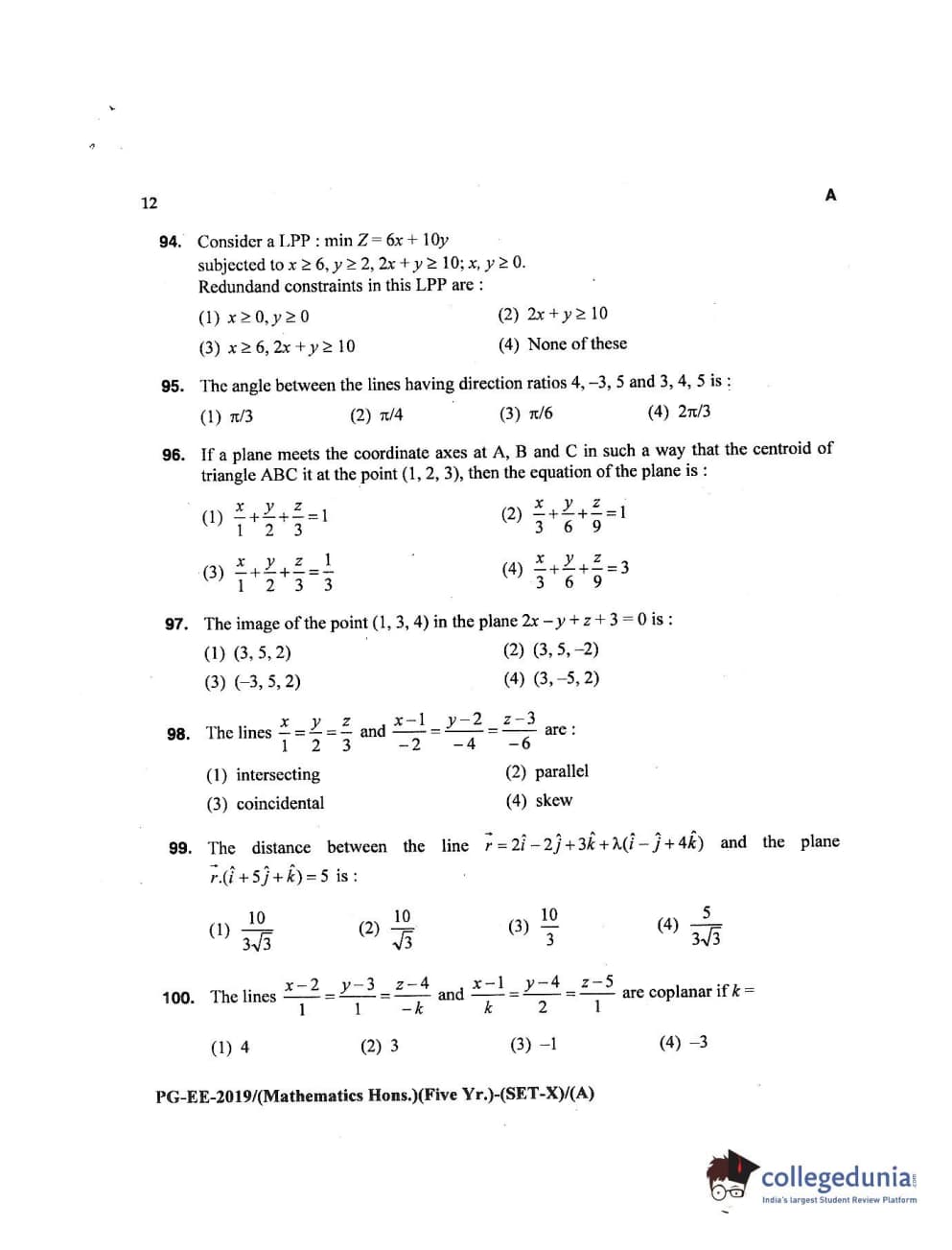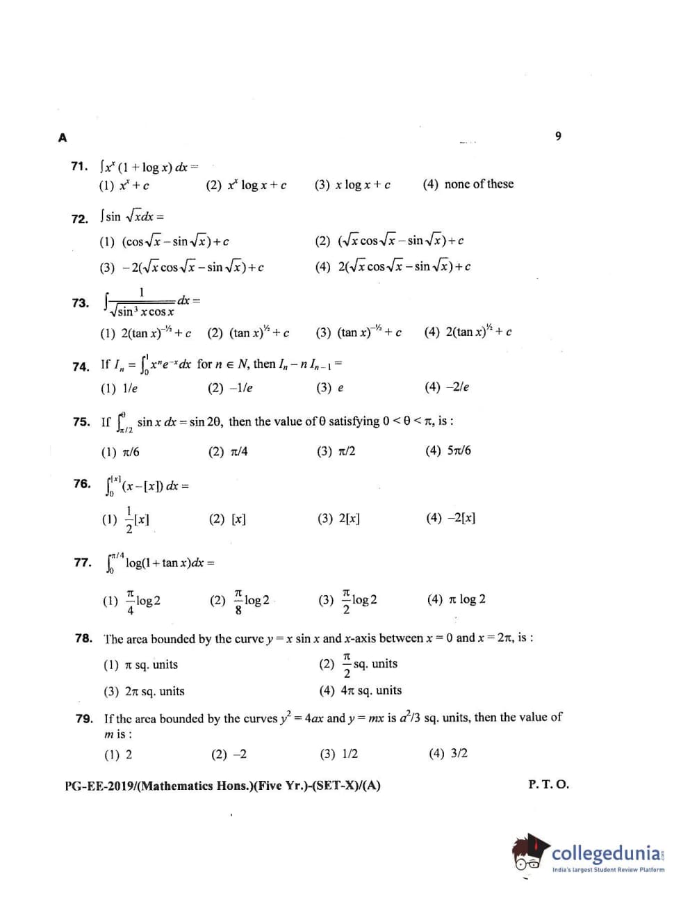 MDUCEE 2019 Mathematics Hons. (Five Year) Set A Question Paper with Answer Key PDFs