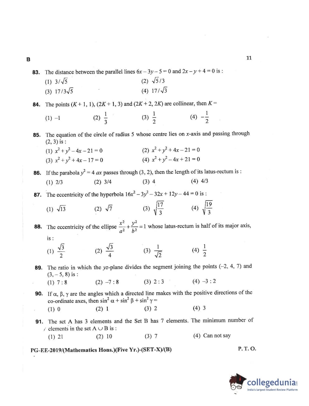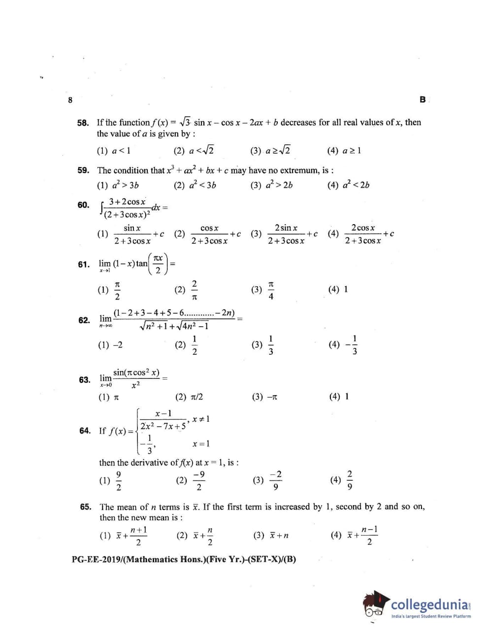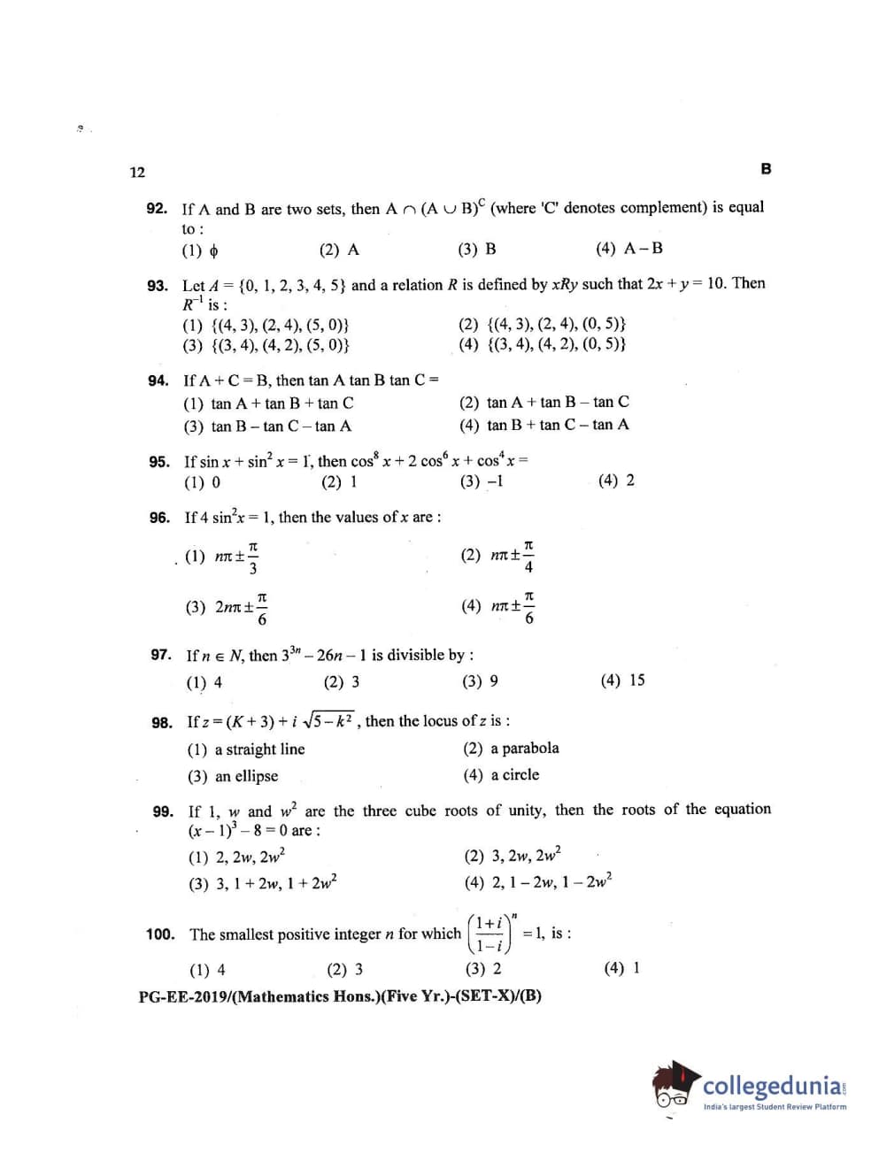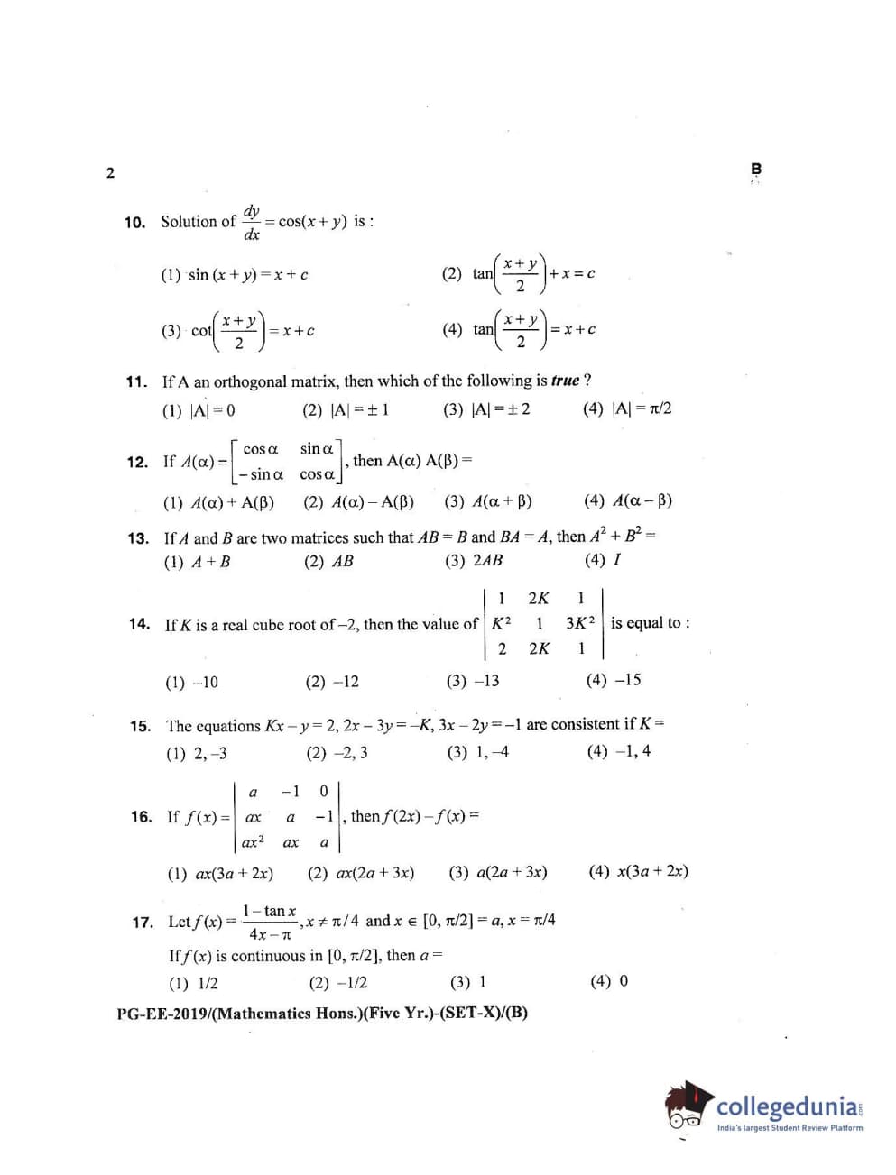 MDUCEE 2019 Mathematics Hons. (Five Year) Set B Question Paper with Answer Key PDFs