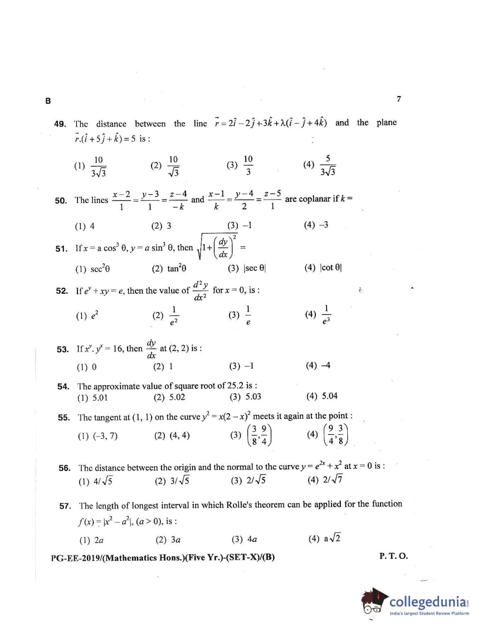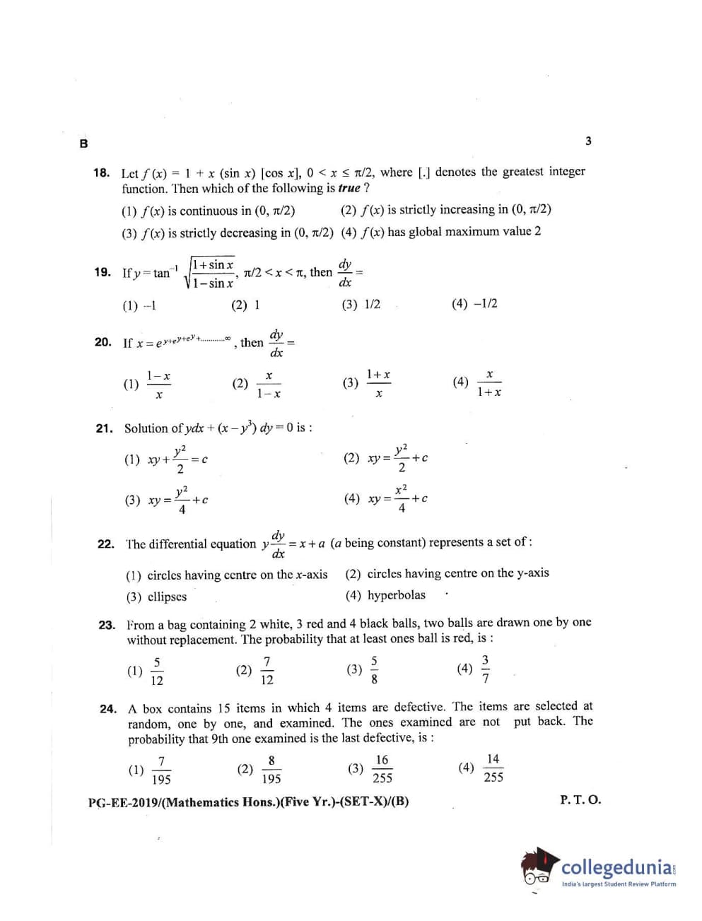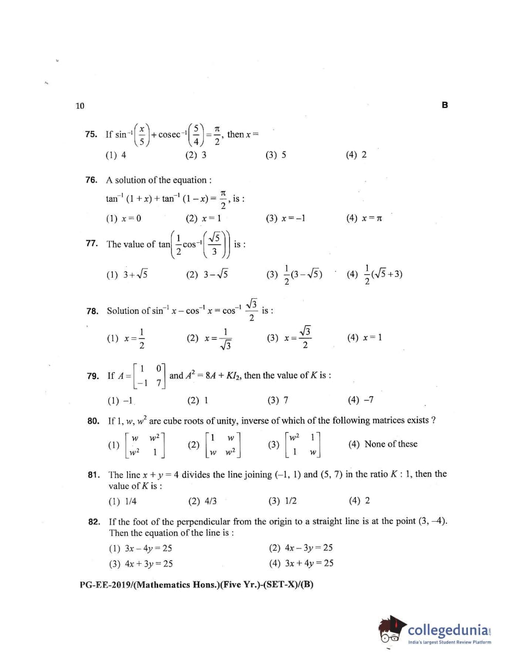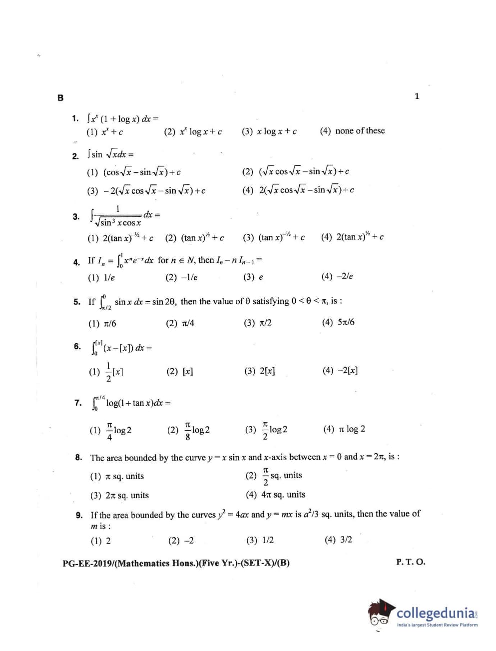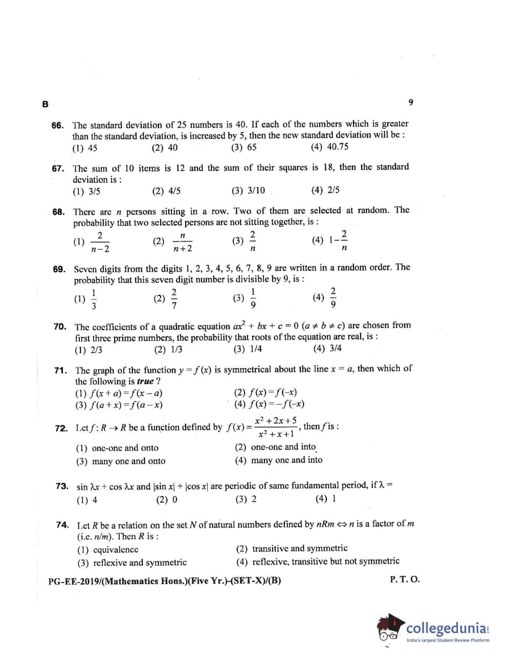 MDUCEE 2019 Mathematics Hons. (Five Year) Set B Question Paper with Answer Key PDFs