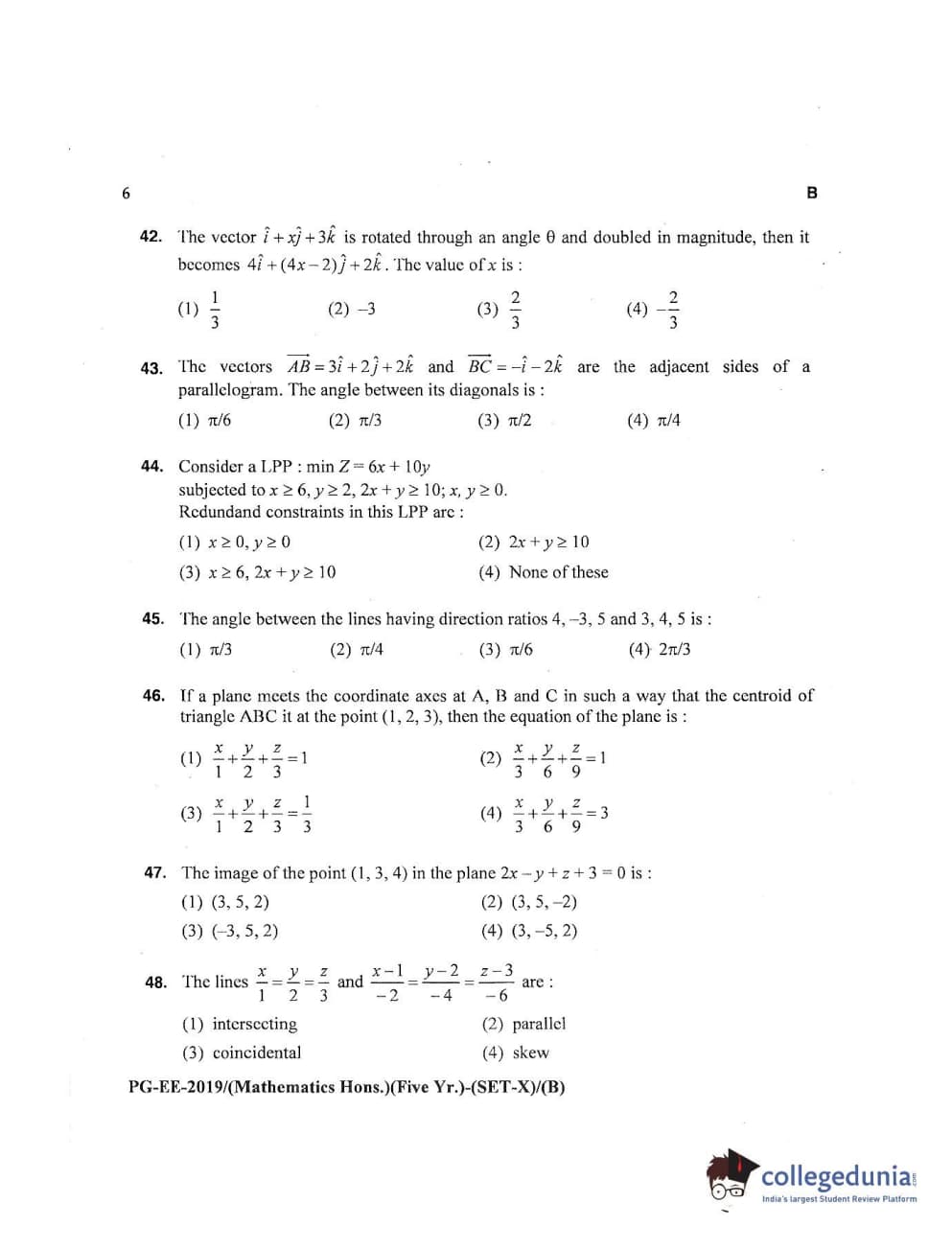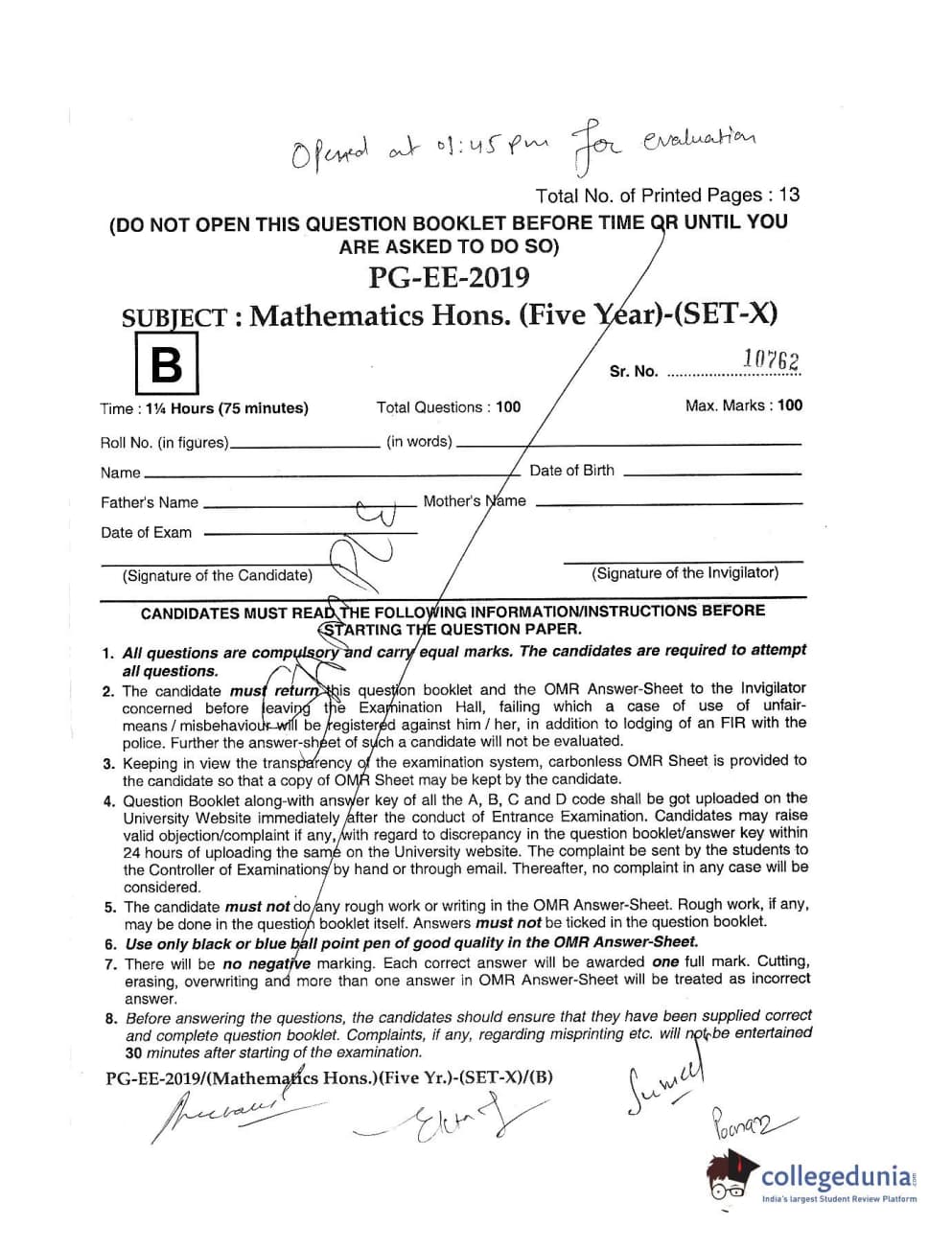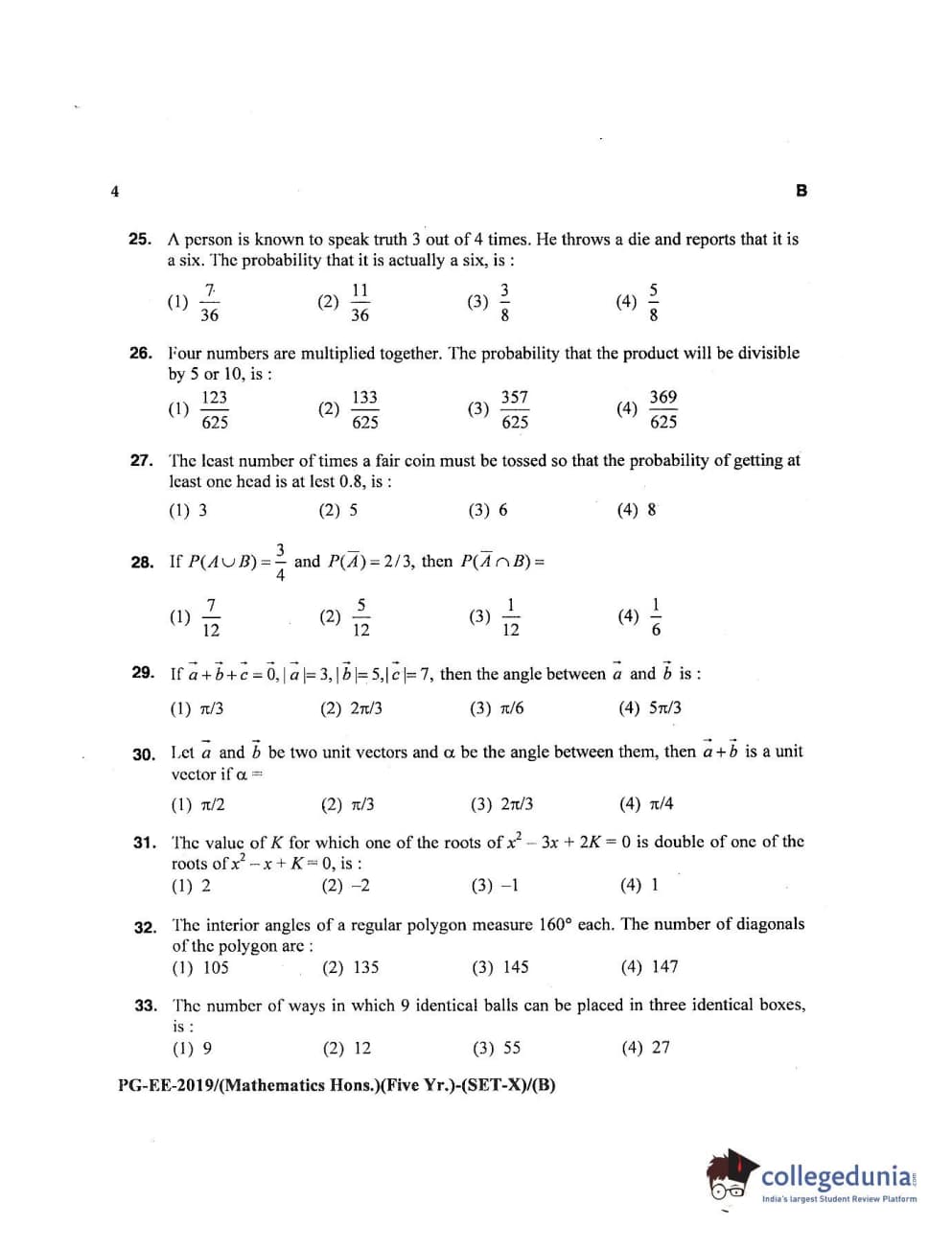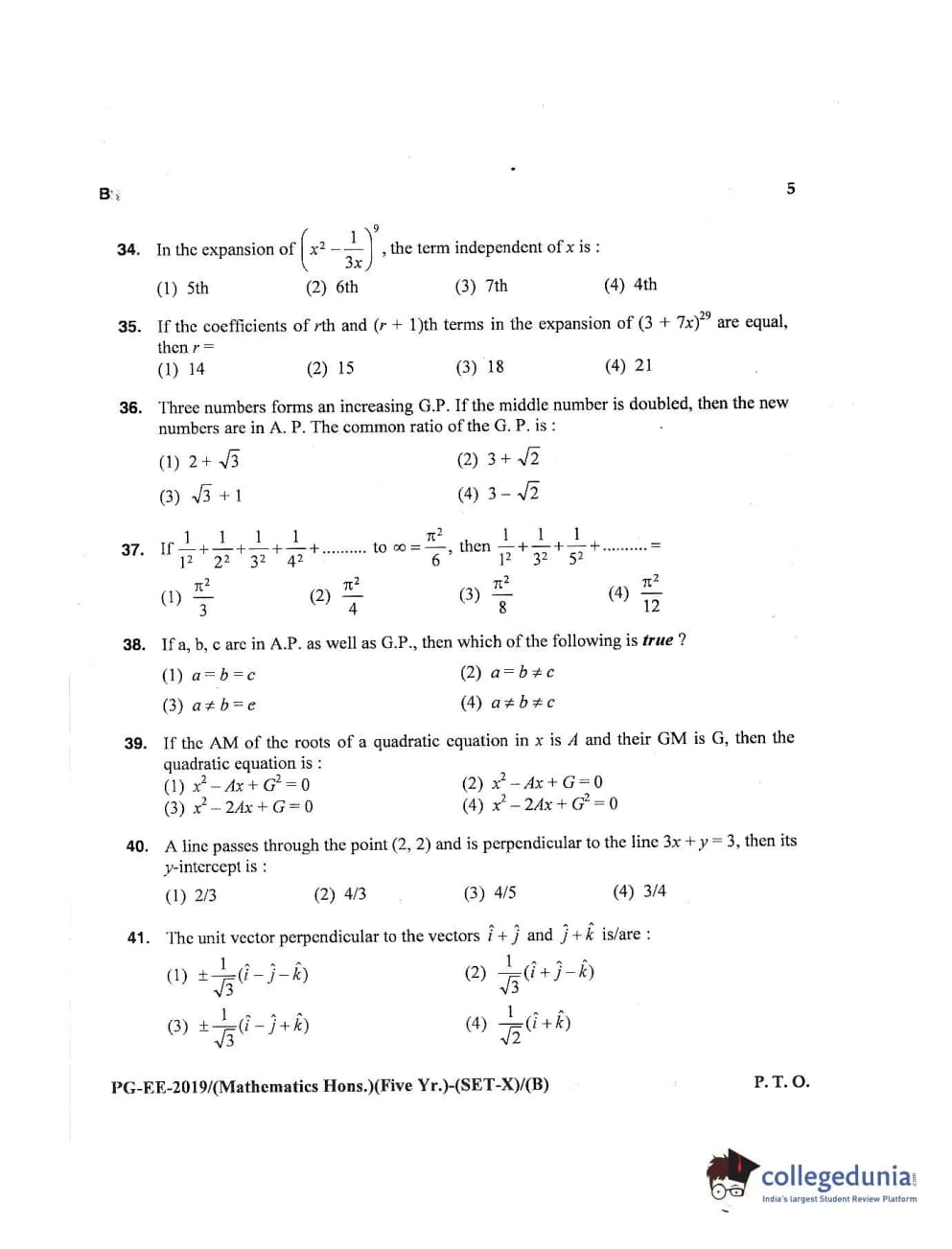 MDUCEE 2019 Mathematics Hons. (Five Year) Set B Question Paper with Answer Key PDFs