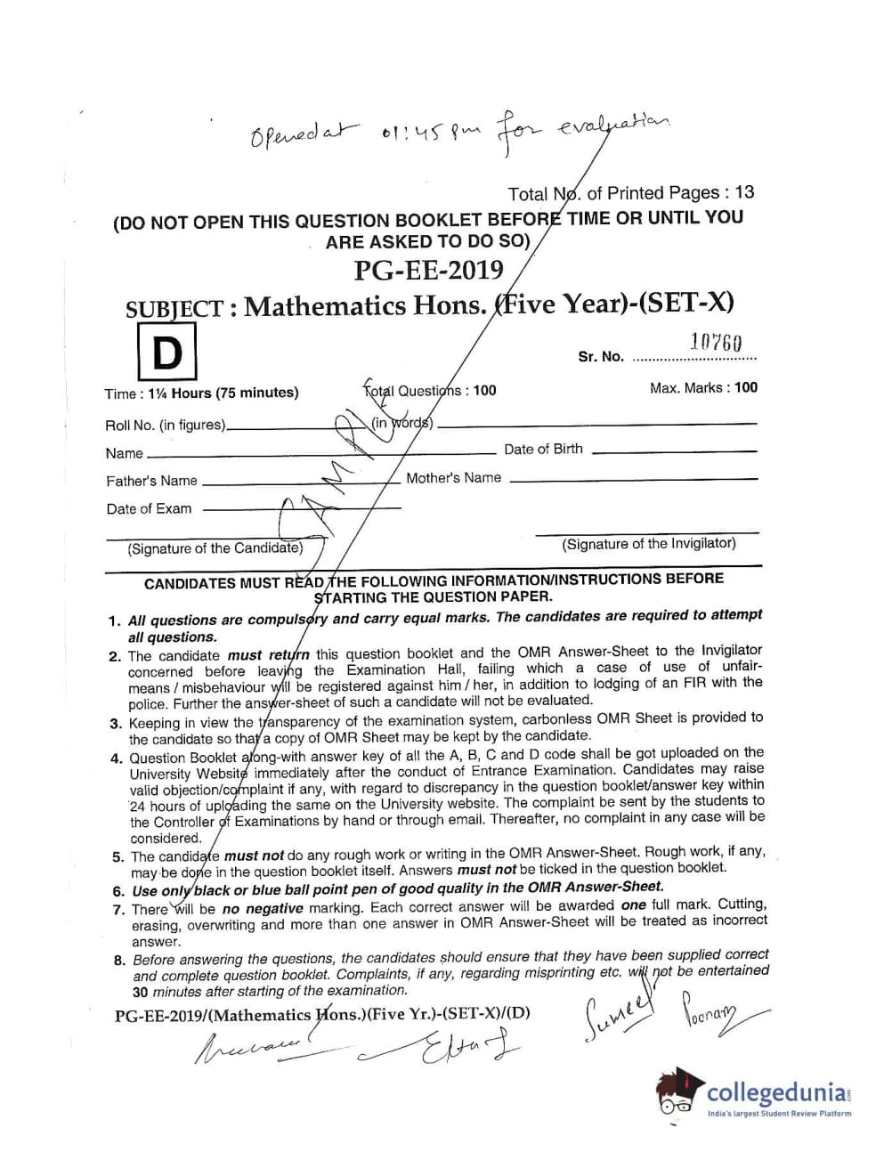 MDUCEE 2019 Mathematics Hons. (Five Year) Set D Question paper with answer key pdf is available for download. The exam was successfully organized by Maharishi Dayanand University. The question paper comprised a total of 100 questions.