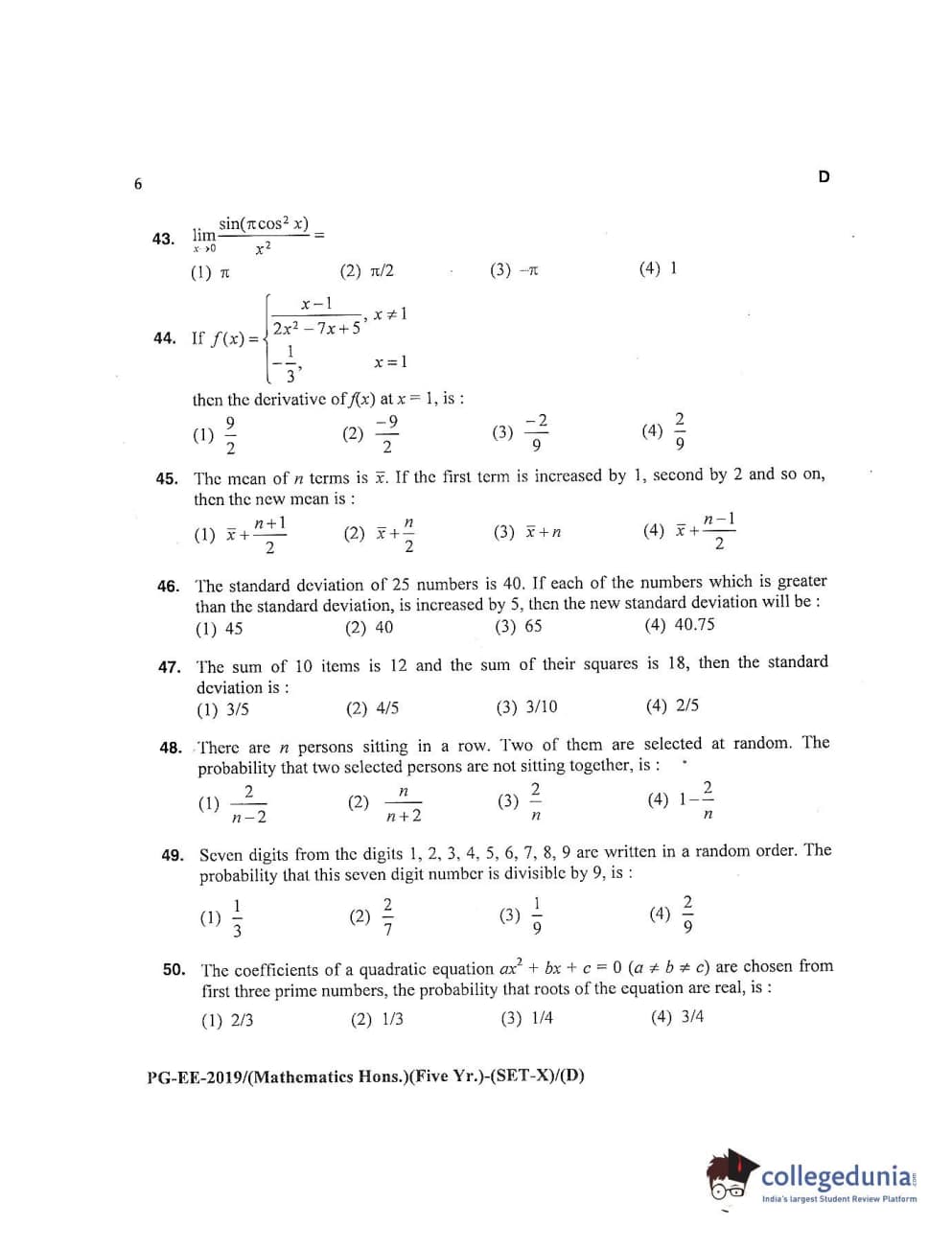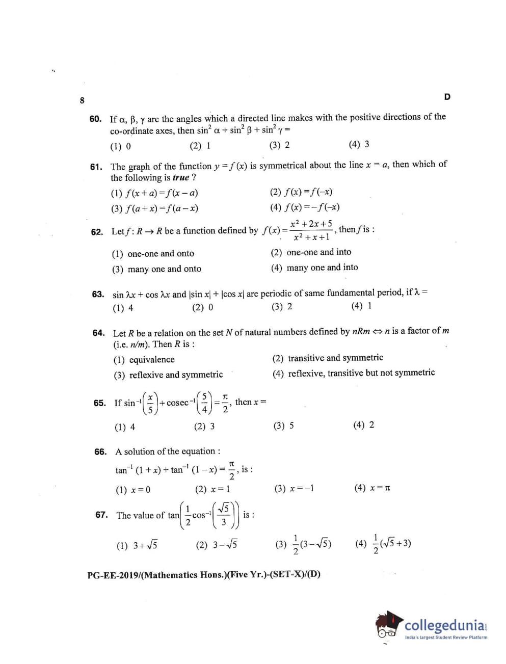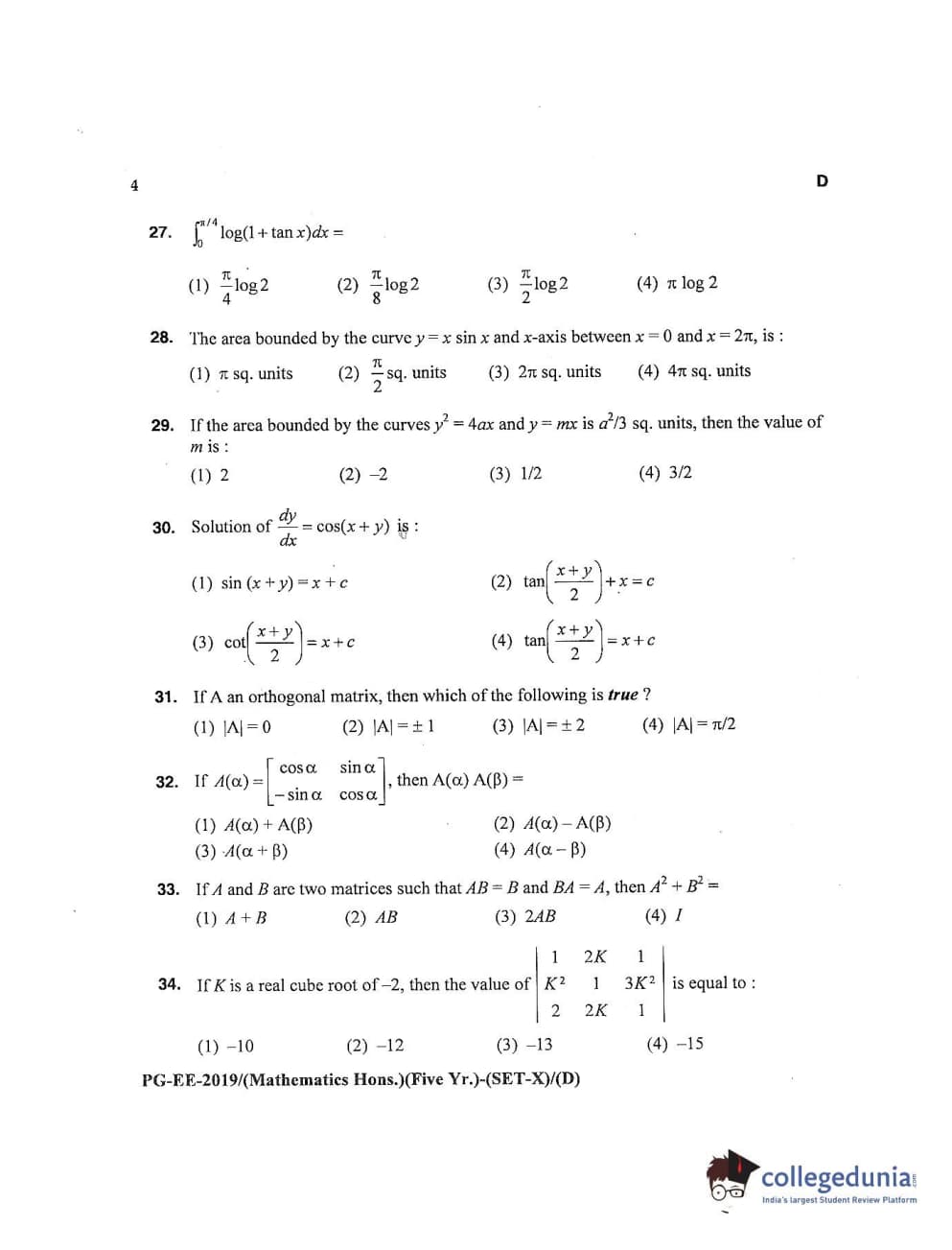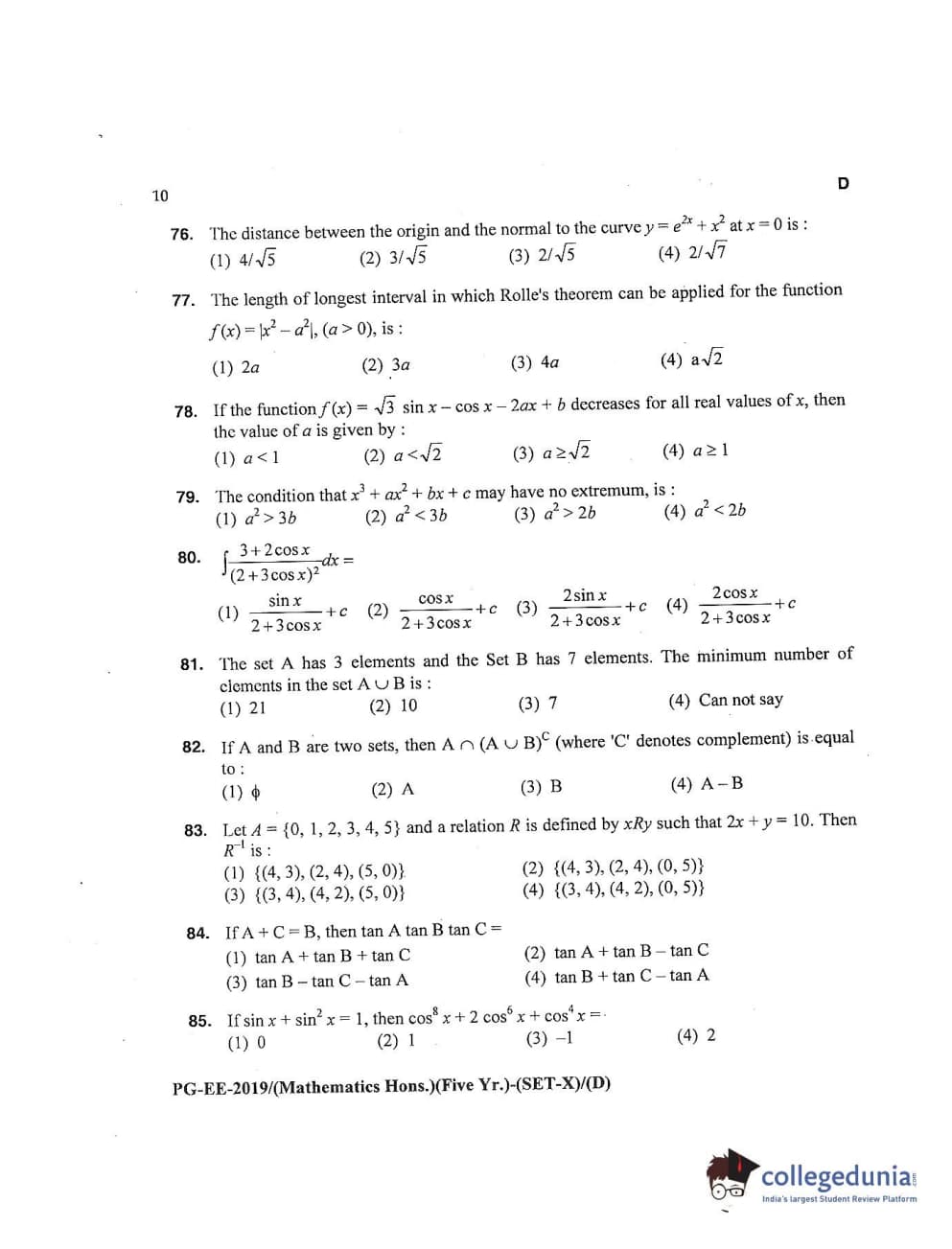 MDUCEE 2019 Mathematics Hons. (Five Year) Set D Question Paper with Answer Key PDFs
