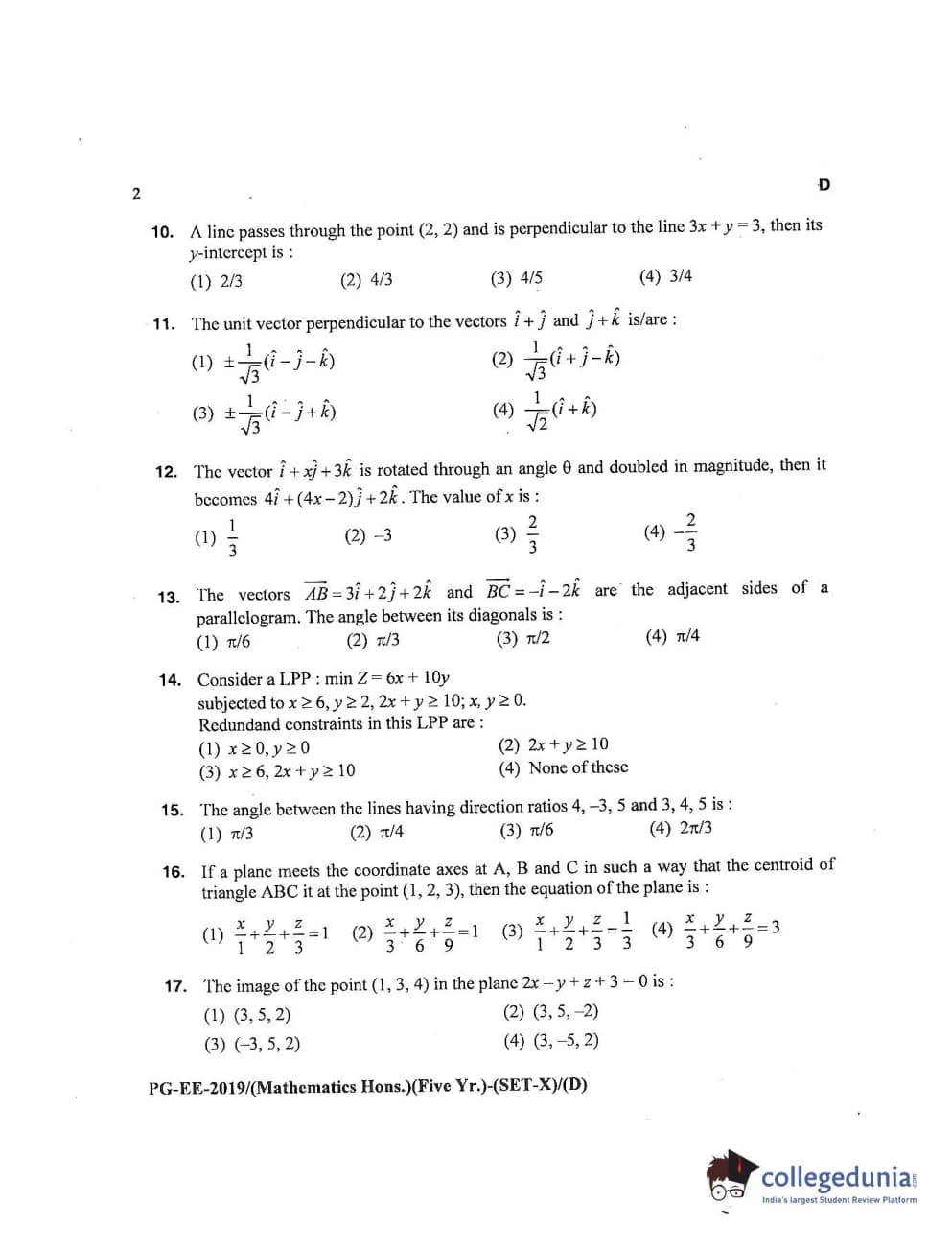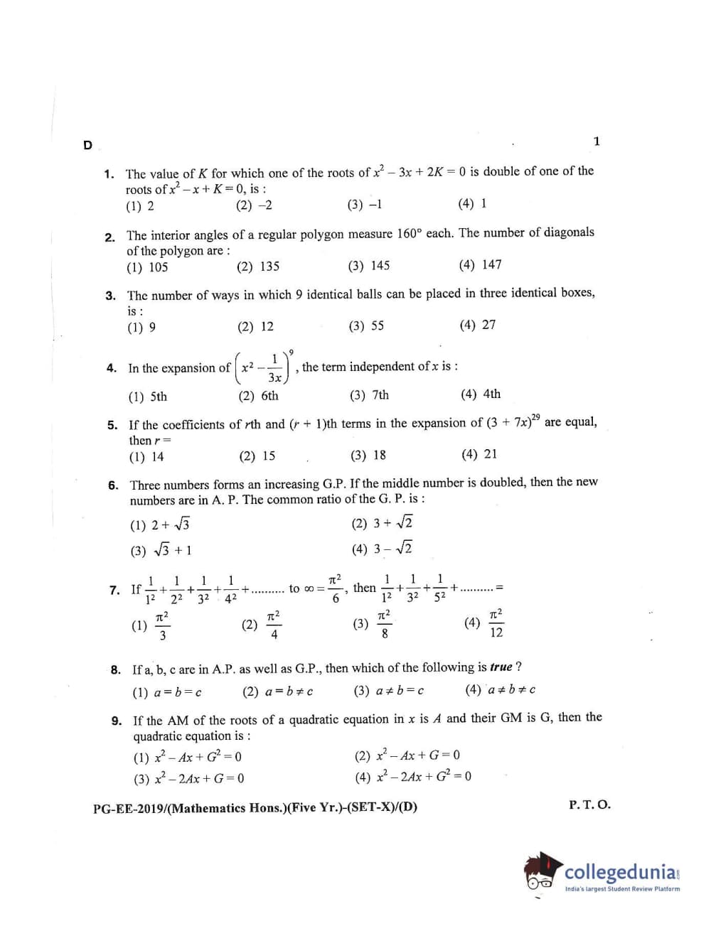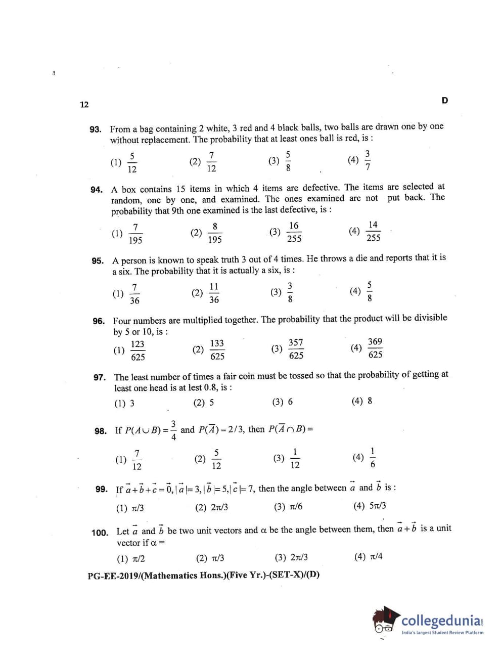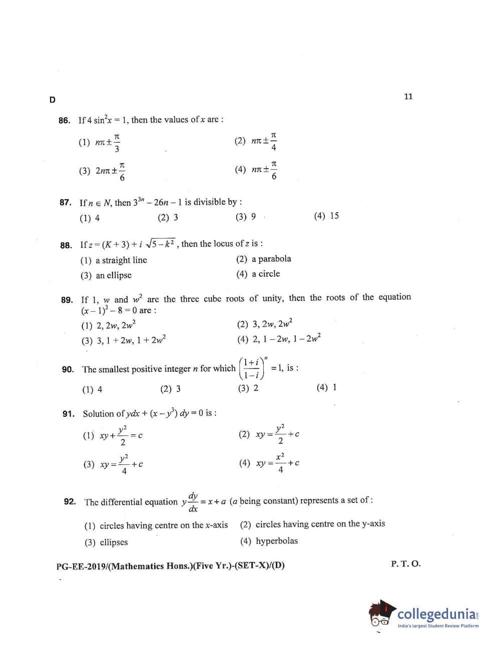 MDUCEE 2019 Mathematics Hons. (Five Year) Set D Question Paper with Answer Key PDFs