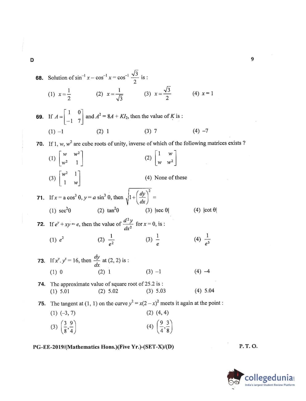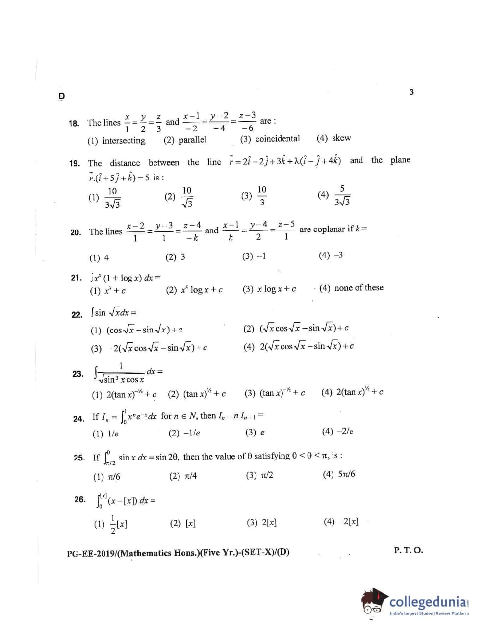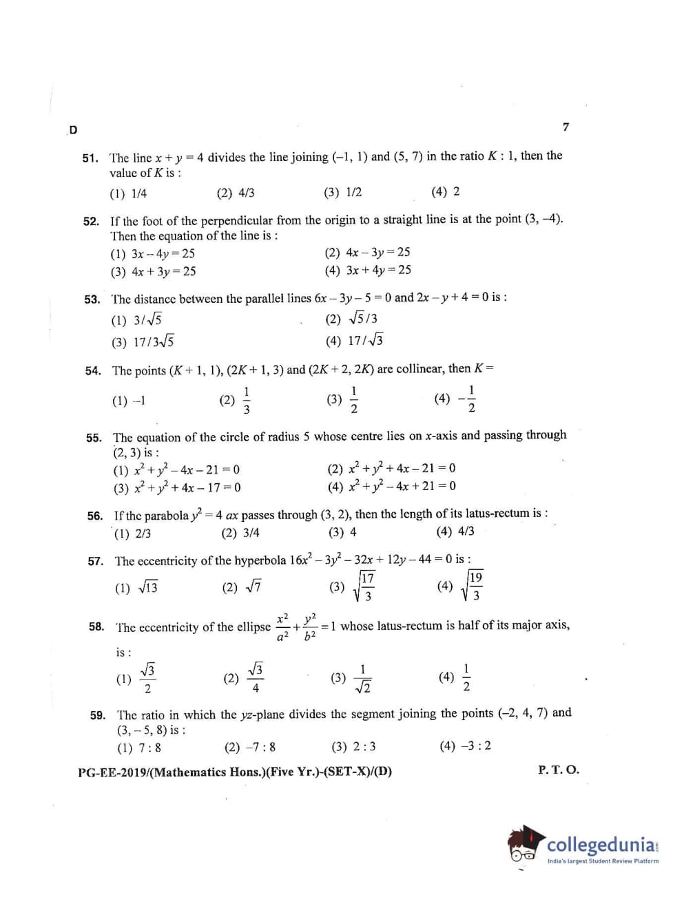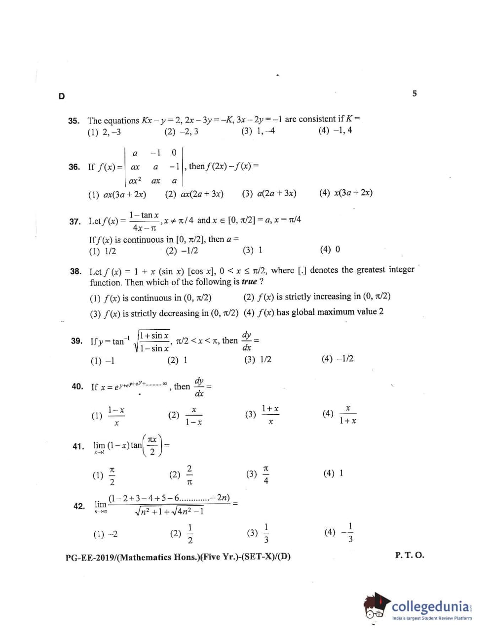 MDUCEE 2019 Mathematics Hons. (Five Year) Set D Question Paper with Answer Key PDFs